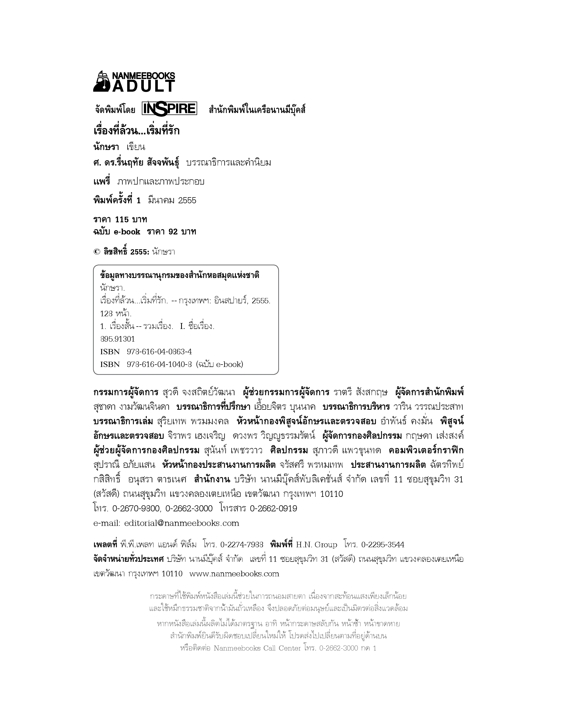 หนังสือ "เรื่องที่ล้วน....เริ่มที่รัก" เล่มนี้ เป็นผลงานนักเขียนอย่าง "นักษรา" ได้นำเสนอเรื่องสั้นรวม 15 เรื่องสั้นคัดสรร ไม่ว่าจะเป็น ลูกไม้ลายรัก กระป๋องรองน้ำ แว่นสีกุหลาบ ลูกบอรเพ็ด ต้นมะขามของพ่อ เลิกเพราะรัก และอื่นๆ อีกมากมาย ที่สะท้อนความรักหลากหลายรูปแบบ เพราะเราต่างเคย "ให้" และ "รับ" ความรักกันมาทั้งนั้น