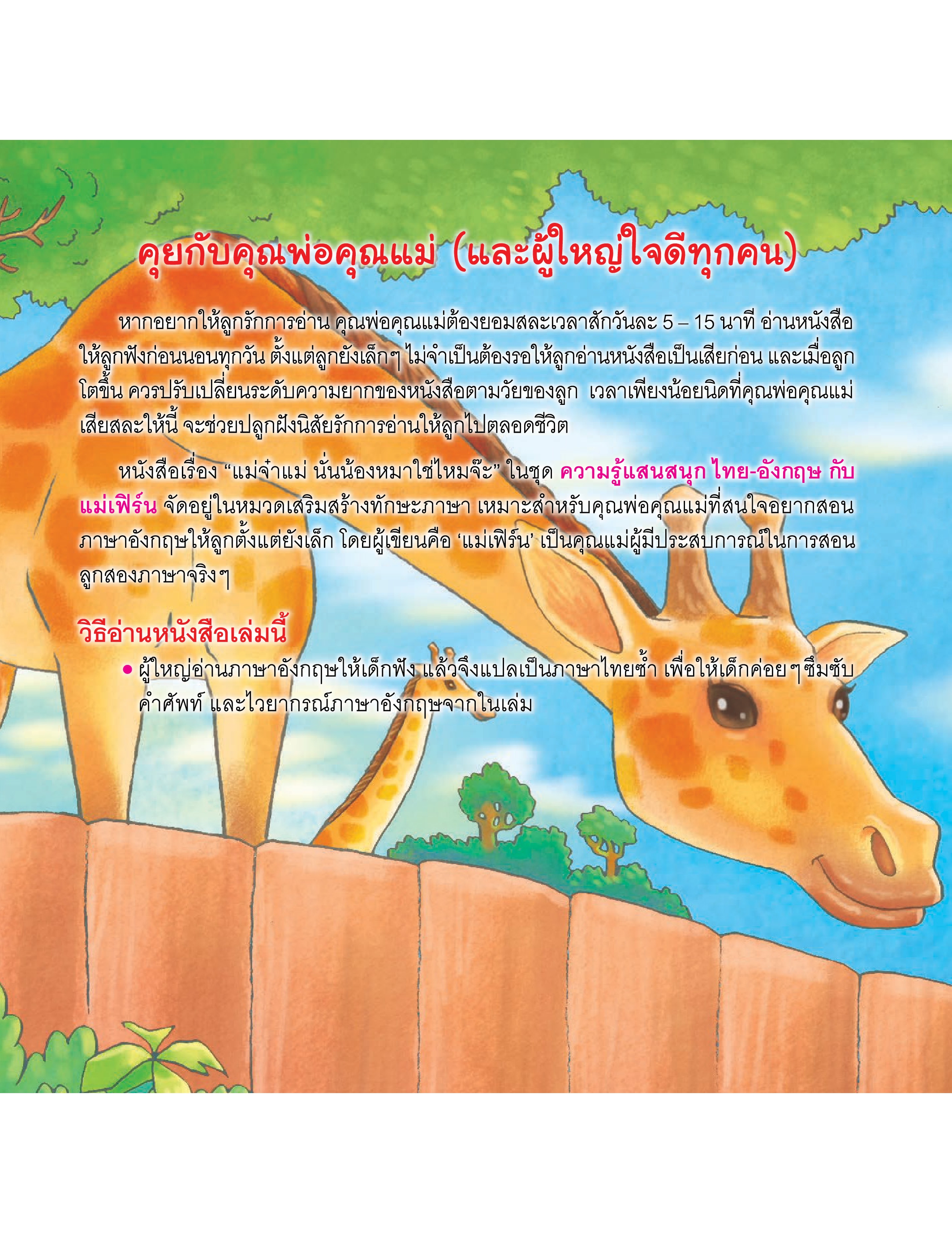 หนังสือสองภาษาแสนสนุกสำหรับเด็กๆทุกคน ในเล่มเด็กๆจะได้ท่องเที่ยวไปในสวนสัตว์ และพบเจอสัตว์หลากหล่ายชนิด แต่เด็กๆจะรู้ไปมว่าสัตว์แต่ละตัวไม่เหมือนกันอย่างไร