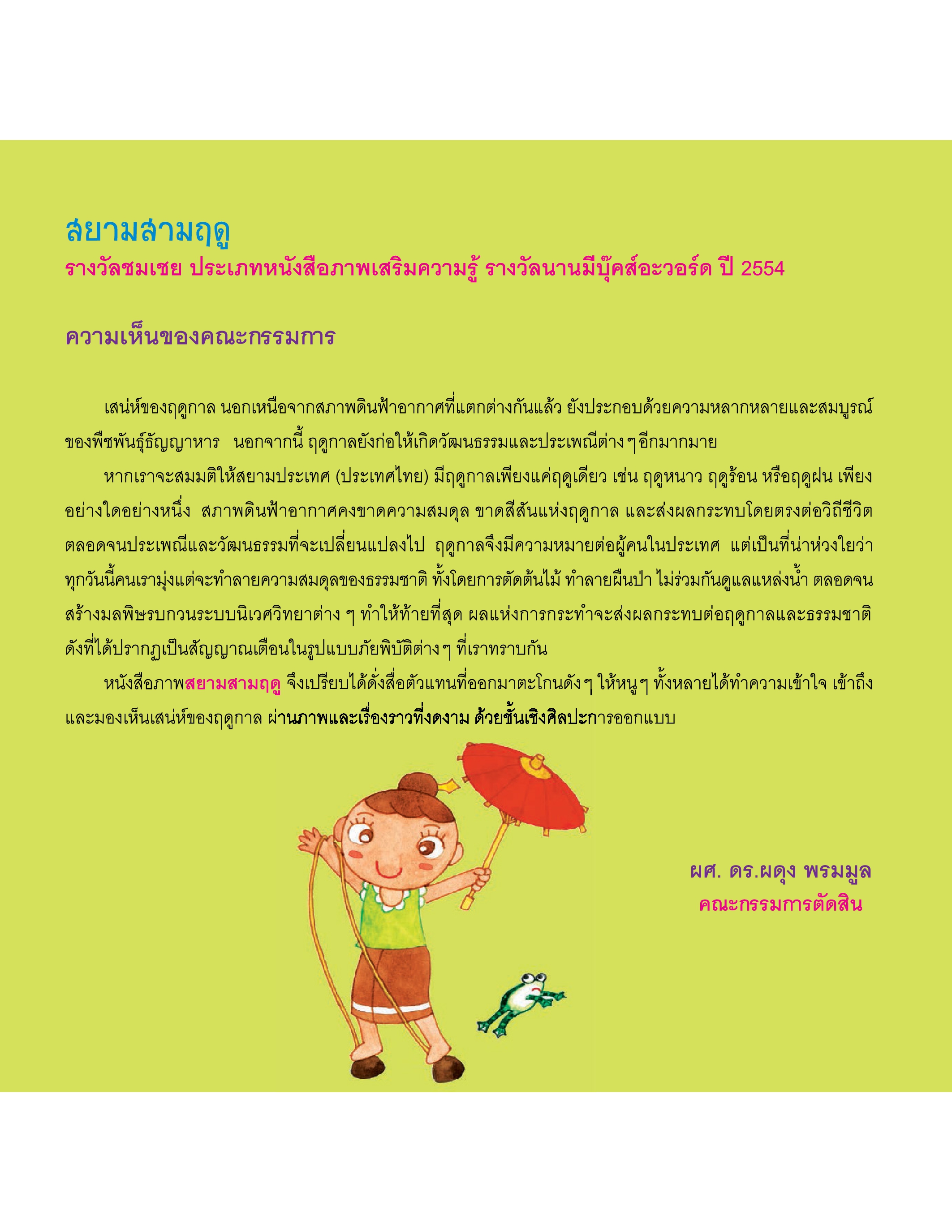 ในหนึ่งปีมีสามฤดู ได้แก่ ฤดูร้อน ฤดูฝน ฤดูหนาว แต่ภายในสามฤดูนี้มีอะไรเกิดขึ้นบ้างนะ สยามสามฤดูชวนเด็กๆมารู้จักแต่ละฤดูกาล พร้อมสอดแทรกเรื่องราว ของวัฒนธรรม ประเพณีไทยแต่โบราณ แล้วเด็กๆจะได้รู้ว่าไม่ว่าฤดูไหน ก็สนุกได้ทุกฤดูเลยนะ