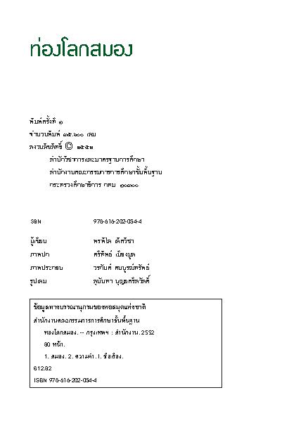 หนังสือเผยแพร่ โดย สำนักวิชาการและมาตรฐานการศึกษา สำนักงานคณะกรรมการการศึกษาขึ้นพื้นฐาน กระทรวงศึกษาธิการ หนังสือ "่ท่องโลกสมอง" เล่มนี้ เขียนขึ้นเพื่อให้เด็กๆ อ่าน ถ้าเด็กรู้จักสมองของตัวเอง ก็จะรู้จักดูแลสมอง รู้จักวิธีกาารใช้สมองอย่างมีประสิทธิภาพมากขึ้น