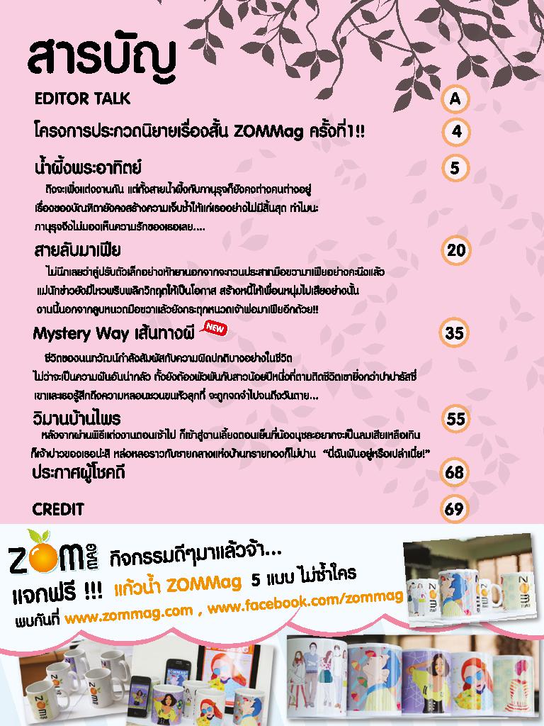 ZOMMag นิตยสารนิยายออนไลน์ยุคใหม่หลากหลายรสชาติมีตั้งแต่รสหวานฉ่ำของนิยายรักซึ้งกินใจ รสเปรี้ยวอมหวานของนิยายรักกุ๊กกิ๊ก และรสเปรี้ยวซ่าชวนเปรี๊ยวกรามของนิยายสืบสวน ไม่ว่าจะรสชาติไหน ผลไม้ไรเหลี่ยมลูกนี้ก็พร้อมเสริฟให้ฟินทุกความอร่อยได้แล้ววันนี้ !!Slogan - ZOMMag ผลไม้ไร้เหลี่ยม!! : peoplemedia
