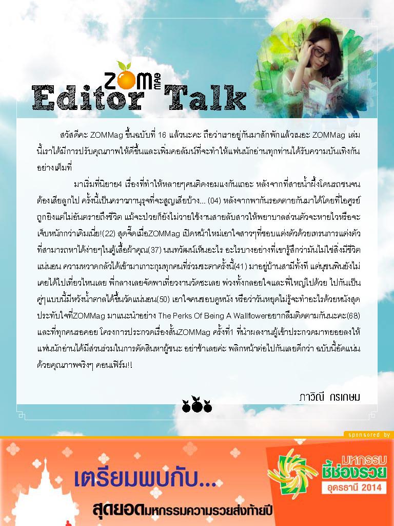 ZOMMag นิตยสารนิยายออนไลน์ยุคใหม่หลากหลายรสชาติมีตั้งแต่รสหวานฉ่ำของนิยายรักซึ้งกินใจ รสเปรี้ยวอมหวานของนิยายรักกุ๊กกิ๊ก และรสเปรี้ยวซ่าชวนเปรี๊ยวกรามของนิยายสืบสวน ไม่ว่าจะรสชาติไหน ผลไม้ไรเหลี่ยมลูกนี้ก็พร้อมเสริฟให้ฟินทุกความอร่อยได้แล้ววันนี้ !!Slogan - ZOMMag ผลไม้ไร้เหลี่ยม!! : peoplemedia