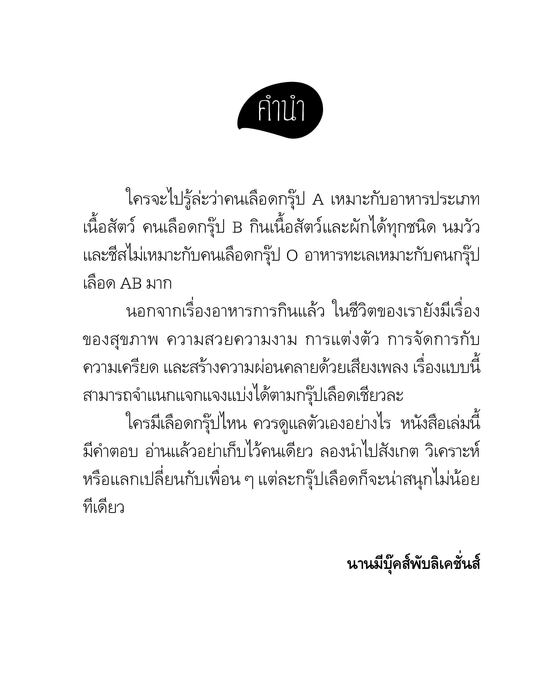 สุขภาพของแต่ละกรุ๊ปเลือดเป็นอย่างไร ? อาหารที่เหมาะกับแต่ละกรุ๊ปเลือด ? กรุ๊ปเลือดไหนอ้วนง่ายที่สุด ? วิธีออกกำลังกายตามกรุ๊ปเลือด ? เคล็ดลับทำหน้าสวยตามกรุ๊ปเลือด ? หนังสือเล่มนี้มีคำตอบ : นานมีบุ๊คส์,Nanmeebooks