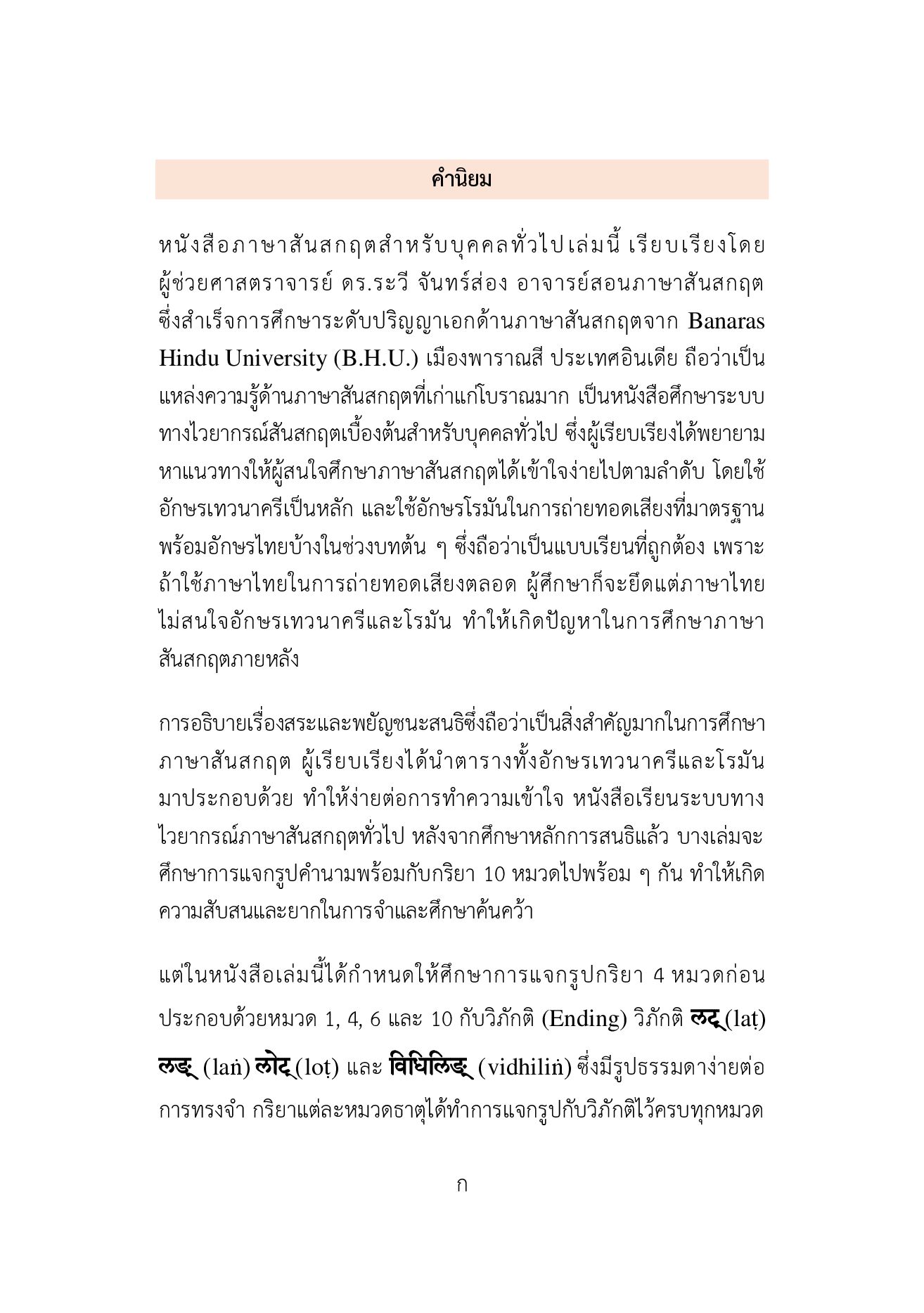หนังสือเล่มนี้ จัดทำขึ้นเพื่อเป็นคู่มือในการเรียนภาษาสันสกฤตสำหรับผู้สนใจทั่วไป ประกอบไปด้วยเนื้อหาที่จำเป็นสำหรับการเรียน ได้แก่ ประวัติความเป็นมาของภาษาสันสกฤต อักษรชนิดต่างๆ ที่ควรทราบ ที่ควรทราบ ตลอดจนไวยากรณ์สันสกฤตเบื้องต้น ผู้เขียนได้จัดลำดับเนื้อหาให้เข้าใจง่าย ตัดกฎเกณฑ์บางอย่างที่ซับซ้อนออกไปคงไว้แต่ส่วนที่จำเป็นเท่านั้น เนื้อหาแต่ละตอนประกอบด้วยวิธีการและตัวอย่างประกอบและยังมีแบบทดสอบท้ายตอนเพื่อทบทวนความเข้าใจของผู้เรียนอีกด้วย เหมาะสำหรับผู้ที่มีความสนใจในภาษาสันสกฤตตั้งแต่เริ่มศึกษาไปจนถึงระดับสูง