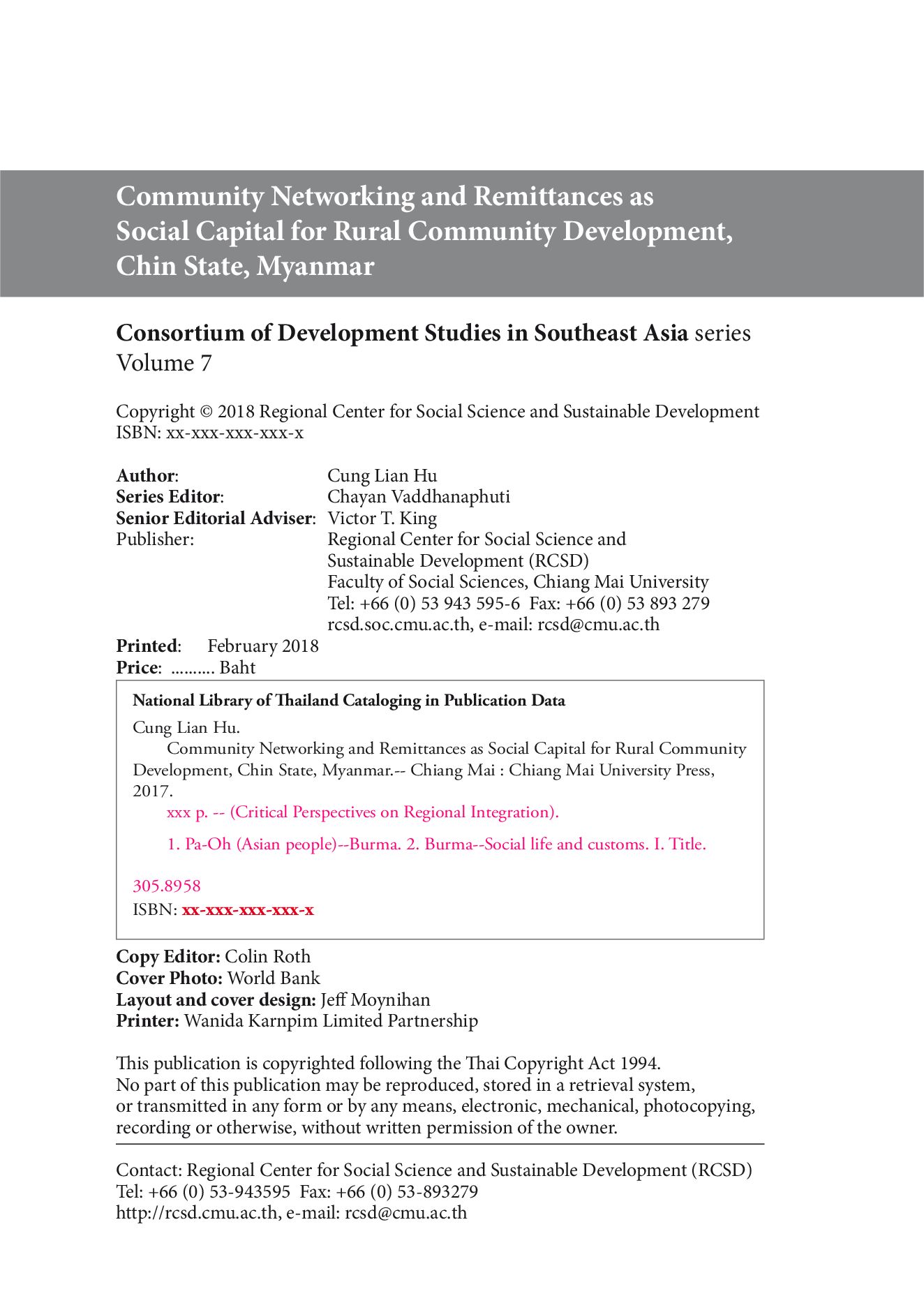 Sixty years of military rule and economic depression in Myanmar have led to large-scale emigration; Vanzang village in northeast Chin State is no exception. Migrants have resettled, many of them as refugees in Australia, Europe and USA. They send money back to the village, where their remittances have played a crucial role sustaining their families and also in funding education, health care, and improving village infrastructure. But there is a down side: a wealth gap has appeared between families who have migrant relatives and those who don’t. Village society has become more materialistic and many customs have changed. Some families have fallen apart when migrants discovered that their remittances had been mismanaged. The author, who is himself Chin and lived in the village as a child, investigates the roles of kinship, religious, and community networks in mobilizing funds for community development, and explores the impacts of remittances—both good and bad—on village society.