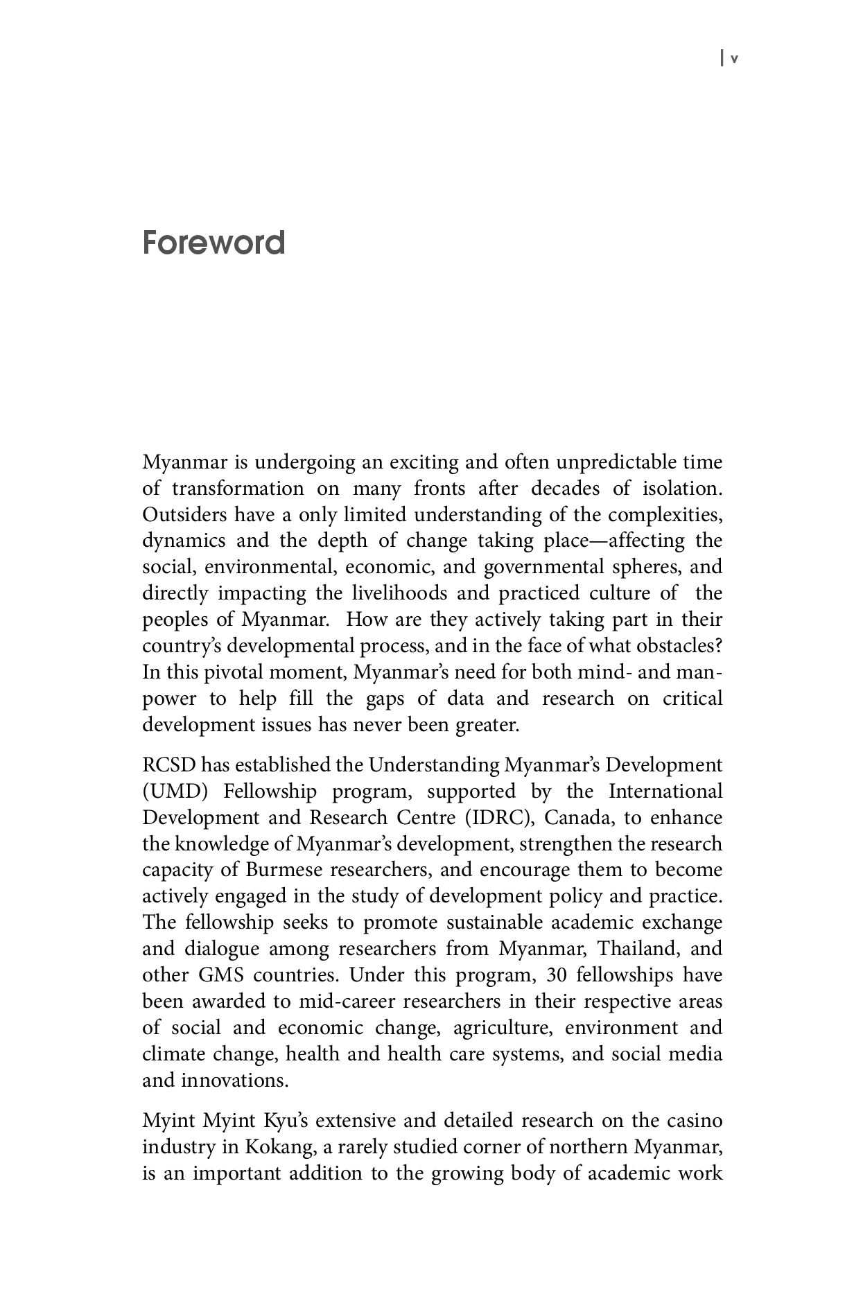 This study examines the casino industry that has come to dominate, Kokang, a border region of northern Myanmar, whose local population is a Chinese speaking minority officially recognized by the central government. The area which is now officially known as the Kokang Self-Administered Zone, is a corner of northern Shan State that was once known for its thriving opium production. Interviews with casino employees and local residents of Kokang were conducted for this study, which focuses on the development of the casino industry in the region since its emergence after 1989 and the industry's economic and social impact on the region