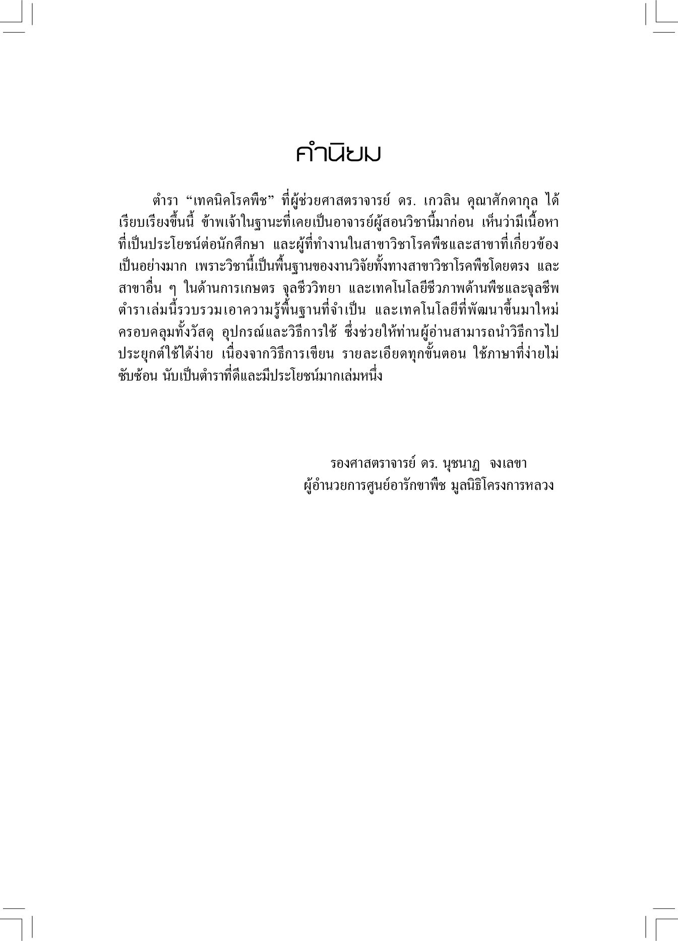 เทคนิคโรคพีชเป็นตำราที่มีเนื้อหาหลักด้านทฤษฎีและวิธีปฎิบัติที่สำคัญทางโรคพืชอย่างครบถ้วน เสนอเนื้อหาตั้งแต่เทคนิคพื้นฐาน การใช้เครื่องมือจำเป็นที่มีในห้องปฏิบัติการทางโรคพืช การฆ่าเชื้ออุปกรณ์ เครื่องมือ อาหารเลี้ยงเชื้อบริสุทธิ์ การปลูกเชื้อ การเก็บรักษาเชื้อ สาเหตุโรคเพื่อใช้ในการทดลองได้อย่างต่อเนื่องโดยเชื้อไม่สูญเสียความสามารถในการทำให้เกิดโรค และรวบรวมตัวอย่าง วิธีการที่ใช้ในการศึกษาเชื้อสาเหตุโรคพืชสำคัญบางชนิด รวมทั้งภาพประกอบการอธิบายตามความเหมาะสมในแต่ละบท เพื่อให้ความรู้ความเข้าใจแก่ผู้ที่สนใจในการนำไปเป็นพื้นฐานและประยุกต์ใช้ในการศึกษาวิจัยให้ประสบผลสำเร็จ