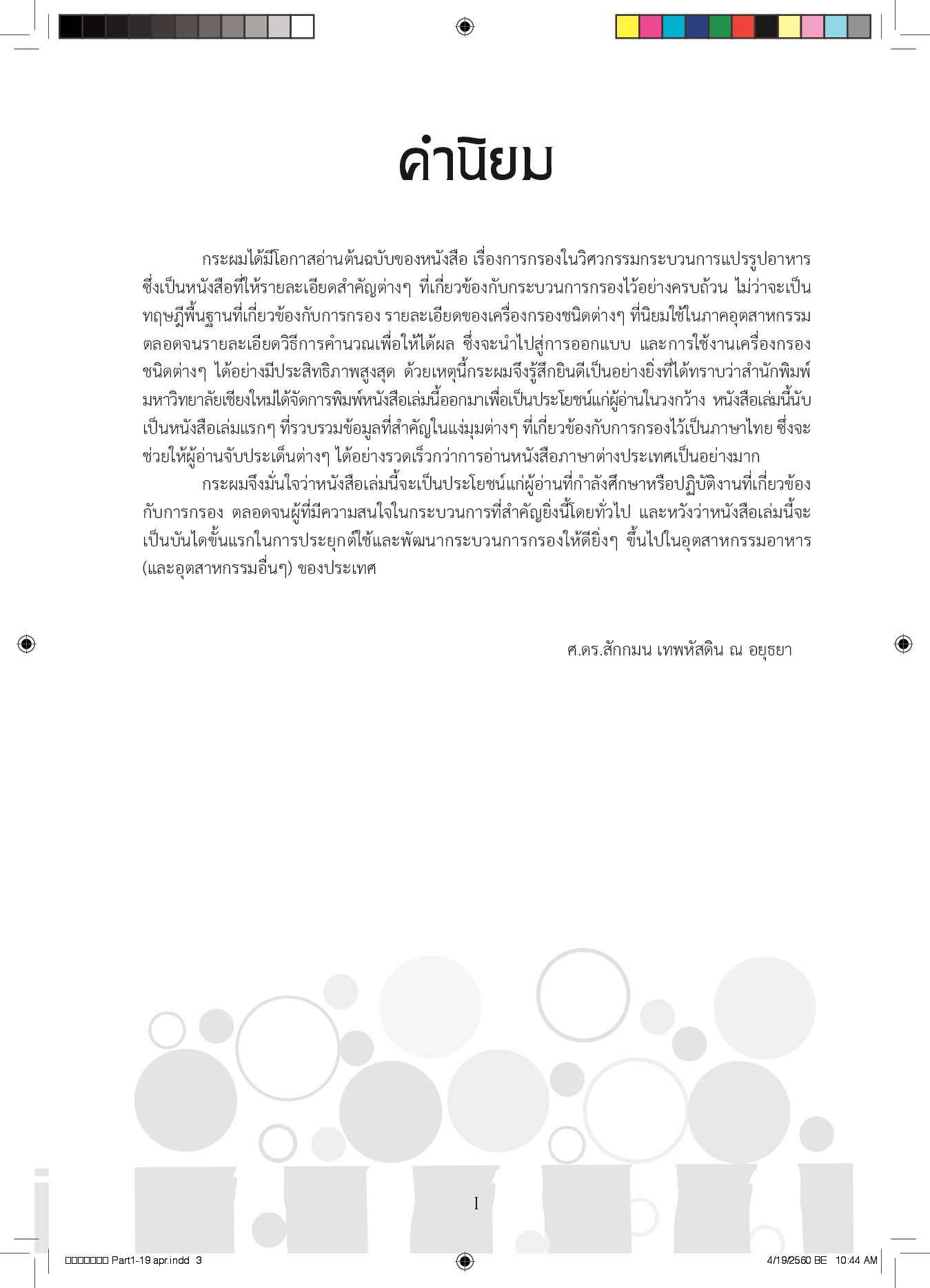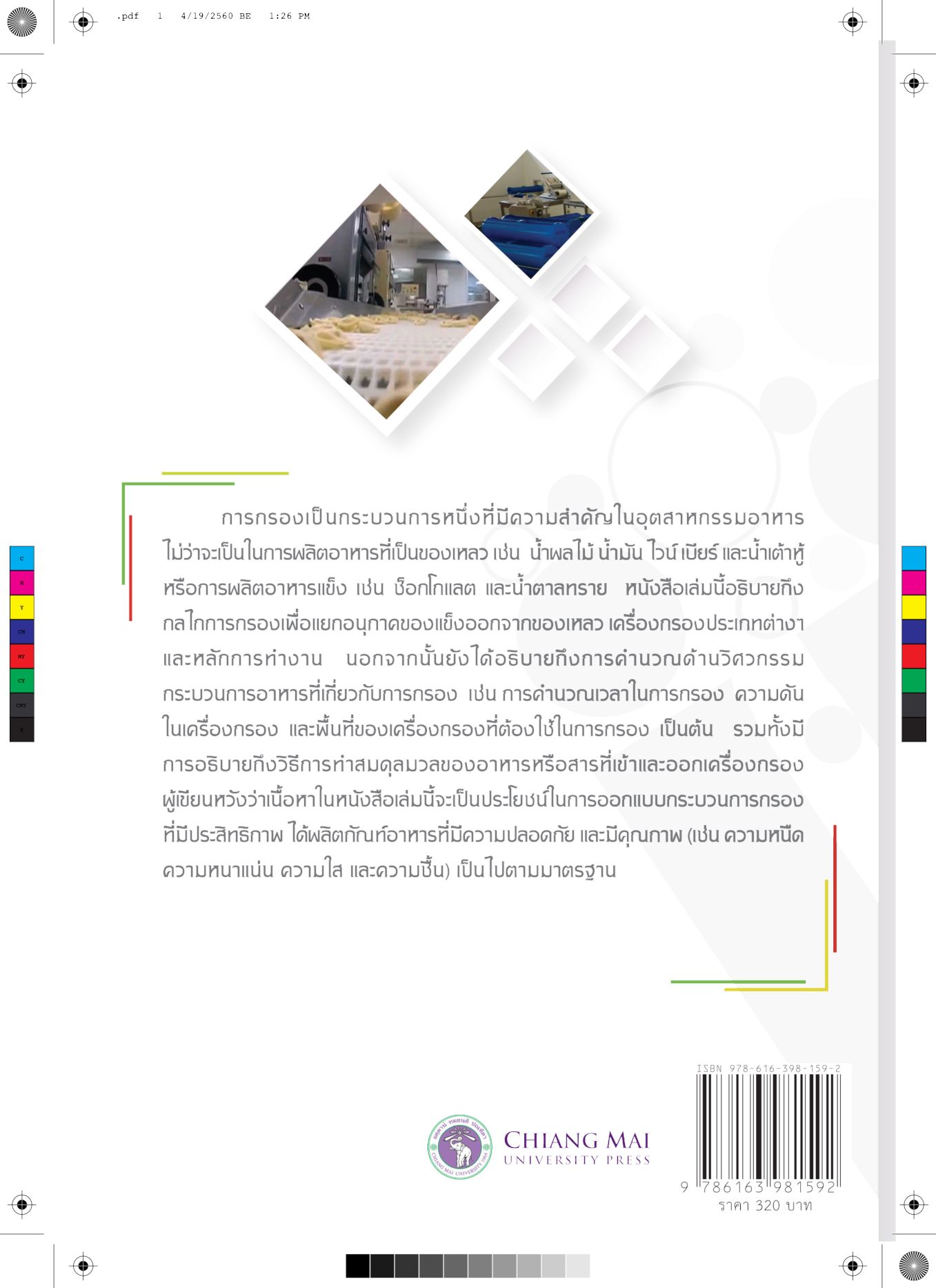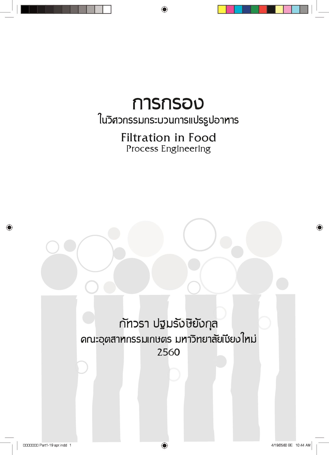 การกรองเป็นกระบวนการหนึ่งที่มีความสำคัญในอุตสาหกรรมอาหารไม่ว่าจะเป็นในการผลิตอาหารที่เป็นของเหลว เช่น น้ำผลไม้ น้ำมัน ไวน์ เบียร์ และนำ้เต้าหู้หรือการผลิตอาหารแข็ง เช่น ช็อกโกแลต และน้ำตาลทราย หนังสือเล่มนี้อธิบายถึงกลไกการกรองเพื่อแยกอนุภาคของแข็งออกจากของเหลว เครื่องกรองประเภทต่างๆ และหลักการทำงาน นอกจากนั้นยังได้อธิบายถึงการคำนวณด้านวิศวกรรมกระบวนการอาหารที่เกี่ยวกับการกรอง เช่น การคำนวณเวลาในการกรอง ความดันในเครื่องกรอง และพื้นที่ของเครื่องกรองที่ต้องใช้ในการกรอง เป็นต้น รวมทั้งมีการอธิบายถึงวิธีการทำสมดุลมวลของอาหารหรือสารที่เข้าและออกเครื่องกรอง ผู้เขียนหวังว่าเนื้อหาในหนังสือเล่มนี้จะเป็นประโยชน์ในการออกแบบกระบวนการกรองที่มีประสิทธิภาพ ได้ผลิตภัณฑ์อาหารที่มีความปลอดภัยและมีคุณภาพ (เช่น ความหนืด ความหนาแน่น ความใส และความชื้น) เป็นไปตามมาตรฐานต่อไป