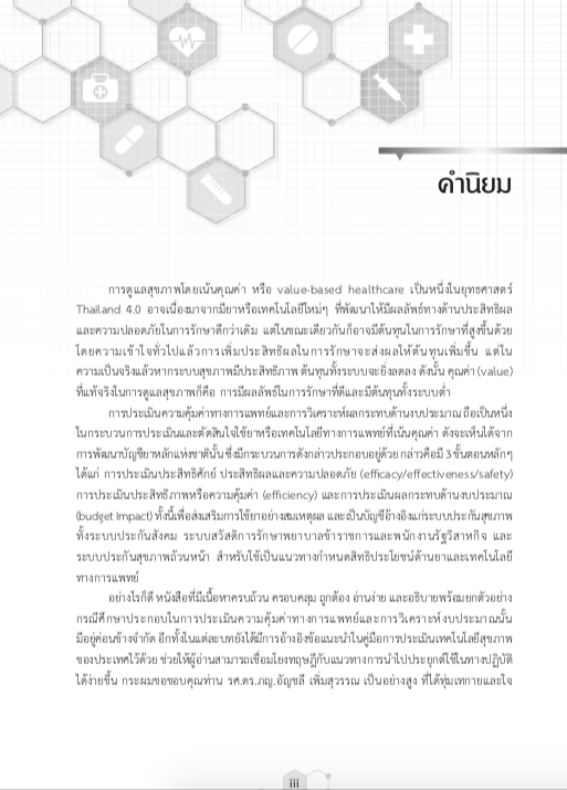 เทคโนโลยีด้านสุขภาพ (health technology) ในหนังสือเล่มนี้ใช้คําว่ามาตรการทางสุขภาพ (health care intervention) ครอบคลุมถึง ยา หัตถการ วัคซีน เครื่องมือแพทย์ ขั้นตอนและระบบ รวมถึงนโยบายต่างๆ ที่พัฒนาขึ้นเพื่อแก้ไขปัญหาสุขภาพและเสริมสร้างคุณภาพชีวิตของประชาชน[1] ปัจจุบันมีมาตรการทางสุขภาพเกิดขึ้นใหม่เป็นจํานวนมาก ซึ่งสวนทางกับงบประมาณของประเทศ ที่มีจํากัด ทําให้บทบาทของการประเมินความคุ้มค่าของมาตรการใหม่ๆ มีความจําเป็นเพิ่มขึ้น ทั้งต่อหน่วยงานภาครัฐบาลและเอกชน เนื่องจากข้อมูลที่ได้จากการประเมินความคุ้มค่าทางการแพทย์ (economic evaluation) สามารถนําไปใช้พิจารณาประกอบการตัดสินใจลงทุนด้านสุขภาพ อย่างเหมาะสม เพื่อให้ประชาชนได้รับการรักษาและการบริการที่ดีขึ้น สามารถเข้าถึงยารักษาโรค และเครื่องมือแพทย์ที่มีคุณภาพได้มากขึ้น การประเมินความคุ้มค่าทางการแพทย์จึงเป็นการประเมินว่า มาตรการใหม่นั้นมีความคุ้มค่ากับงบประมาณที่ลงทุนหรือไม่ (value for money)