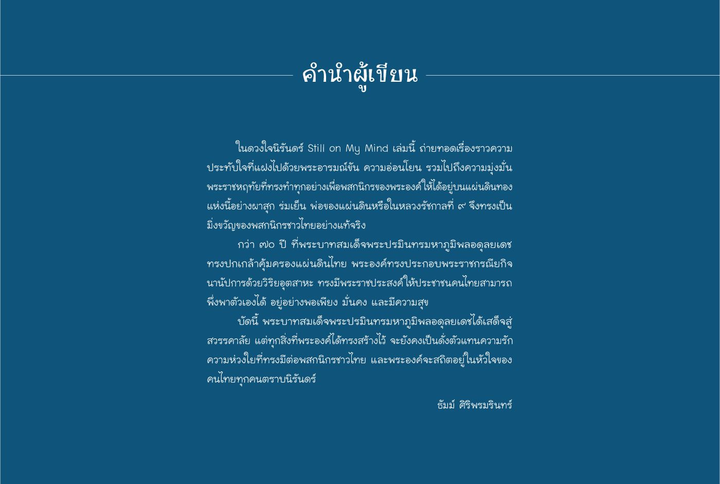 ในดวงใจนิรันดร์ Still on My Mind เล่มนี้ คือเรื่องราวความประทับใจที่แฝงไปด้วยพระอารมณ์ขัน ความอ่อนโยน รวมไปถึงความมุ่งมั่นพระราชหฤทัยที่ทรงทำทุกอย่างเพื่อพสกนิกรของพระองค์ให้ได้อยู่บนแผ่นดินทองแห่งนี้อย่างผาสุกร่มเย็น พ่อของแผ่นดินหรือในหลวงรัชกาลที่ ๙ จึงทรงเป็นมิ่งขวัญของพสกนิกรชาวไทยอย่างแท้จริง