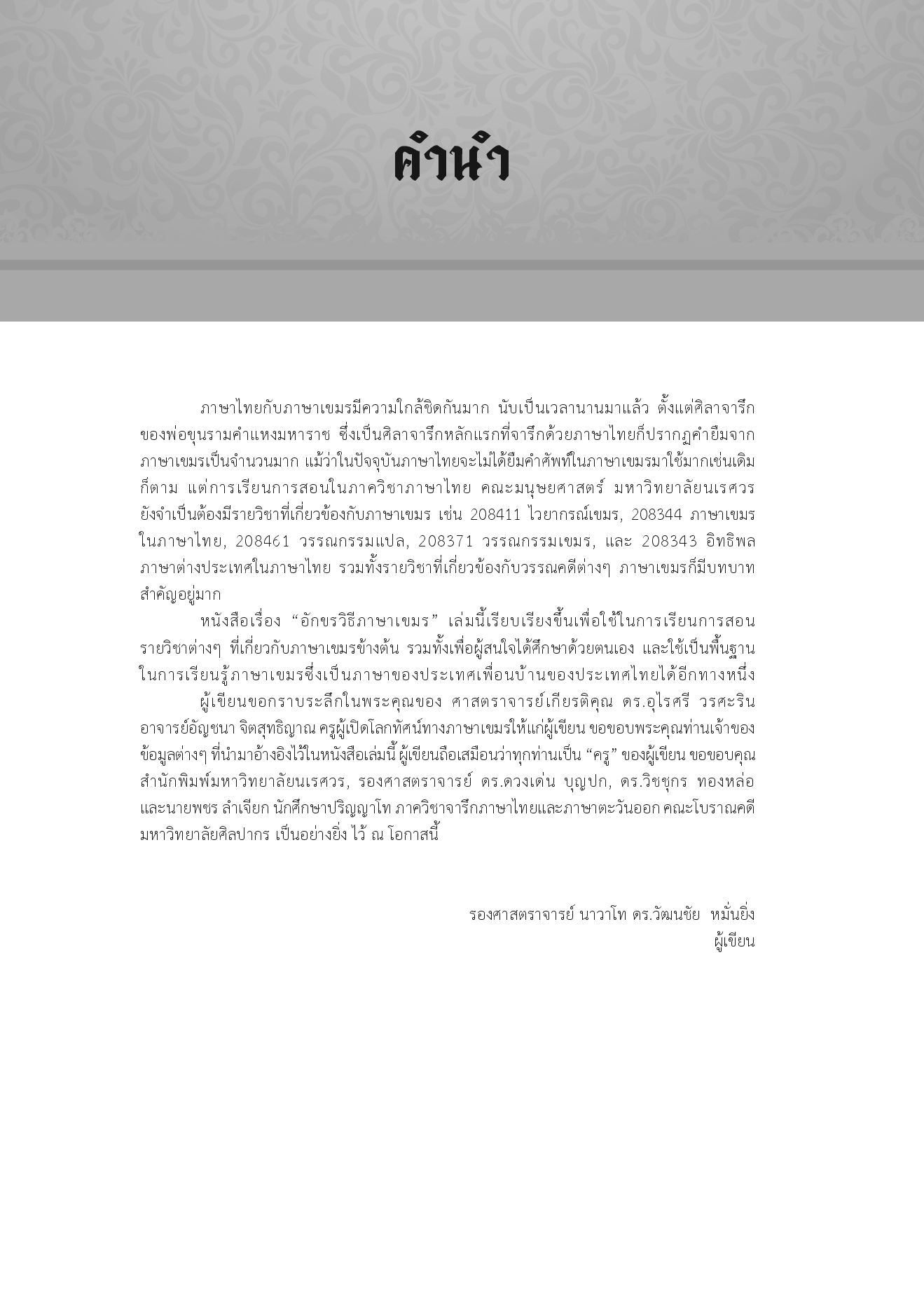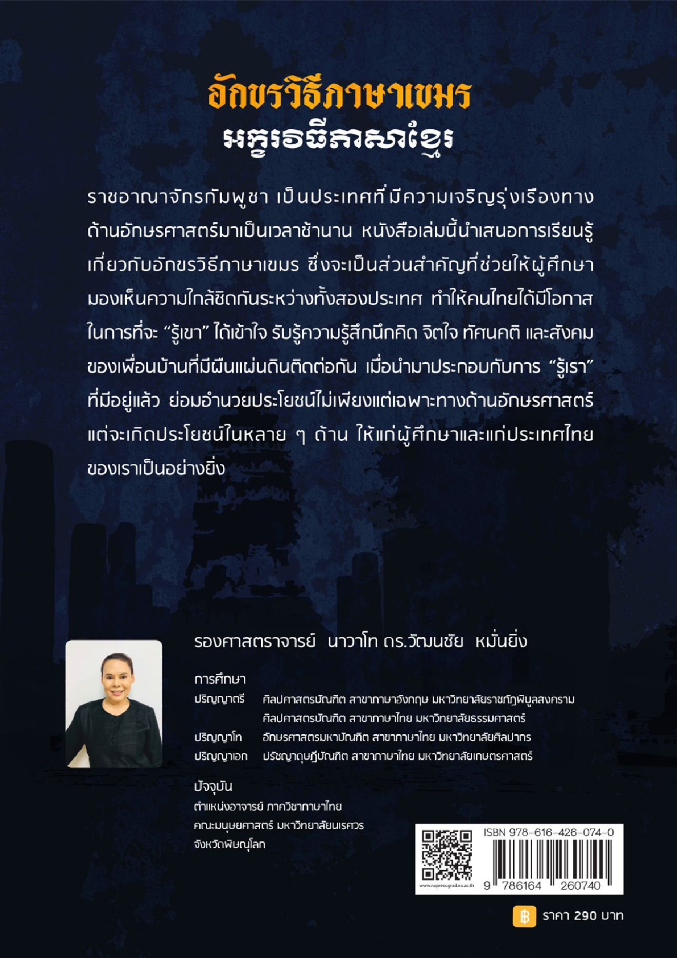 ราชอาณาจักรกัมพูชา เป็นประเทศที่มีความเจริญรุ่งเรืองทางด้านอักษรศาสตร์มาเป็นเวลาช้านาน หนังสือเล่มนี้นำเสนอการเรียนรู้เกี่ยวกับอักขรวิธีภาษาเขมร ซึ่งจะเป็นส่วนสำคัญที่ช่วยให้ผู้ศึกษามองเห็นความใกล้ชิดกันระหว่างทั้งสองประเทศ ทำให้คนไทยได้มีโอกาสในการที่จะ “รู้เขา” ได้เข้าใจ รับรู้ความรู้สึกนึกคิด จิตใจ ทัศนคติ และสังคมของเพื่อนบ้านที่มีผืนแผ่นดินติดต่อกัน เมื่อนำมาประกอบกับการ “รู้เรา” ที่มีอยู่แล้ว ย่อมอำนวยประโยชน์ไม่เพียงแต่เฉพาะทางด้านอักษรศาสตร์ แต่จะเกิดประโยชน์ในหลาย ๆ ด้าน ให้แก่ผู้ศึกษาและแก่ประเทศไทยของเราเป็นอย่างยิ่ง