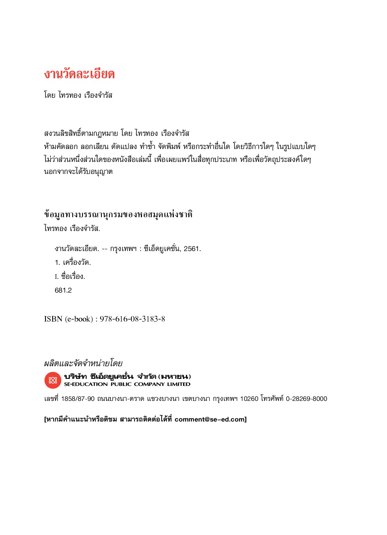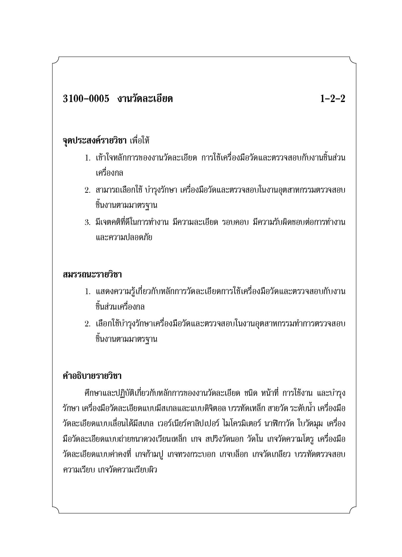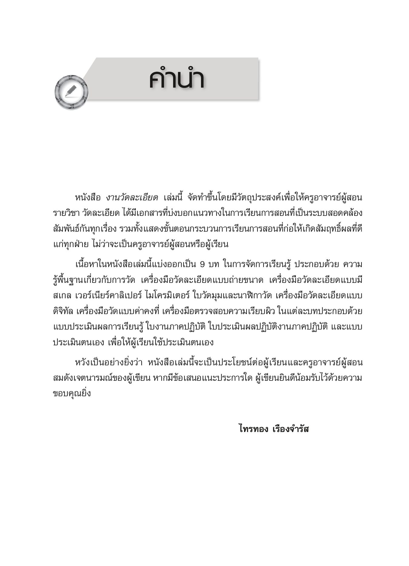 "งานวัดละเอียด (รหัสวิชา 3100-0005)" เล่มนี้ จัดทำขึ้นตรงตามหลักสูตรประกาศนียบัตรวิชาชีพชั้นสูง ของสำนักงานคณะกรรมการอาชีวศึกษา พุทธศักราช 2557 เนื้อหาในหนังสือแบ่งออกเป็น 9 บท ในการจัดการเรียนรู้ ประกอบด้วย เรื่องพื้นฐานงานวัดละเอียด เครื่องมือวัดละเอียดแบบถ่ายขนาด เวอร์เนียร์คาลิเปอร์ ไมโครมิเตอร์ เครื่องมือวัดละเอียดแบบเลื่อนได้มีขีดสเกล ใบวัดมุม นาฬิกาวัด บรรทัดวัดมุมสากล เครื่องมือวัดละเอียดแบบดิจิทัล เครื่องมือวัดแบบค่าคงที่ รวมถึงการตรวจสอบความเรียบผิว ในแต่ละบทประกอบด้วย ใบความรู้ แบบประเมินผลการเรียนรู้ ใบมอบหมายงาน ใบประเมินผลปฏิบัติงาน และแบบประเมินตนเอง เพื่อให้ผู้เรียนใช้ประเมินตนเอง