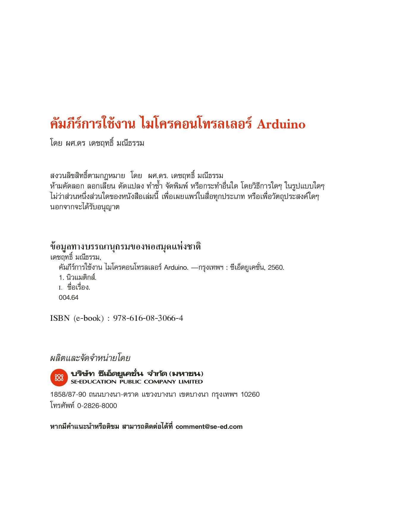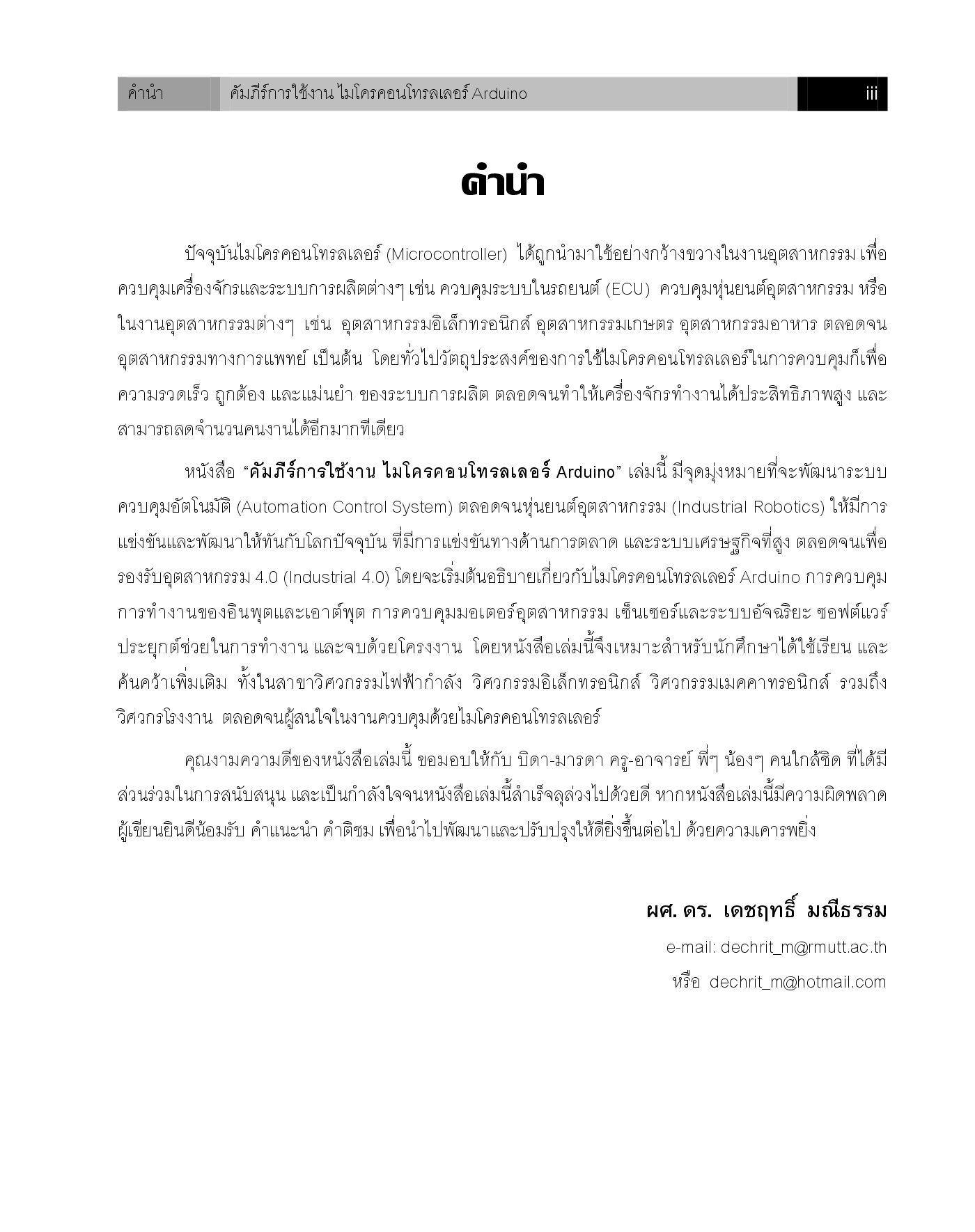 "คัมภีร์การใช้งาน ไมโครคอนโทรลเลอร์ Arduino" เล่มนี้ นำเสนอเนื้อหาเกี่ยวกับการพัฒนาระบบควบคุมอัตโนมัติ (Automation Control System) ตลอดจนหุ่นยนต์อุตสาหกรรม (Industrial Robotics) เพื่อให้มีการแข่งขันและพัฒนาให้ทันกับโลกปัจจุบัน ที่มีการแข่งขันสูงทางด้านการตลาดและระบบเศรษฐกิจ ตลอดจนเพื่อรองรับอุตสาหกรรม 4.0 (Industrial 4.0) โดยจะเริ่มต้นอธิบายเกี่ยวกับไมโครคอนโทรลเลอร์ Arduino (อ่านว่า อา-ดู-อิ-โน่) การควบคุมการทำงานของอินพุตและเอาต์พุต การควบคุมมอเตอร์อุตสาหกรรม เซ็นเซอร์ และระบบอัจฉริยะ ซอฟต์แวร์ประยุกต์ช่วยในการทำงาน และจบด้วยโครงงาน เหมาะกับผู้ที่ศึกษาทางด้านวิศวกรรมศาสตร์ ทั้งในสาขาวิศวกรรมไฟฟ้ากำลัง วิศวกรรมอิเล็กทรอนิกส์ วิศวกรรมเมคคาทรอนิกส์ รวมถึงวิศวกรโรงงาน ตลอดจนผู้สนใจในงานควบคุมด้วยไมโครคอนโทรลเลอร์