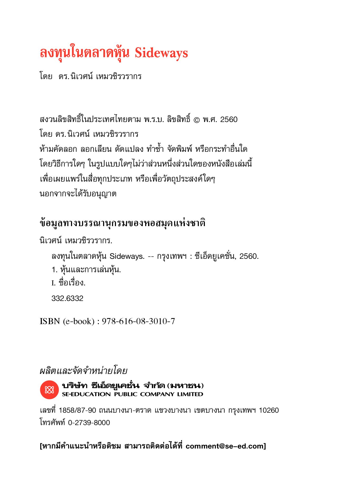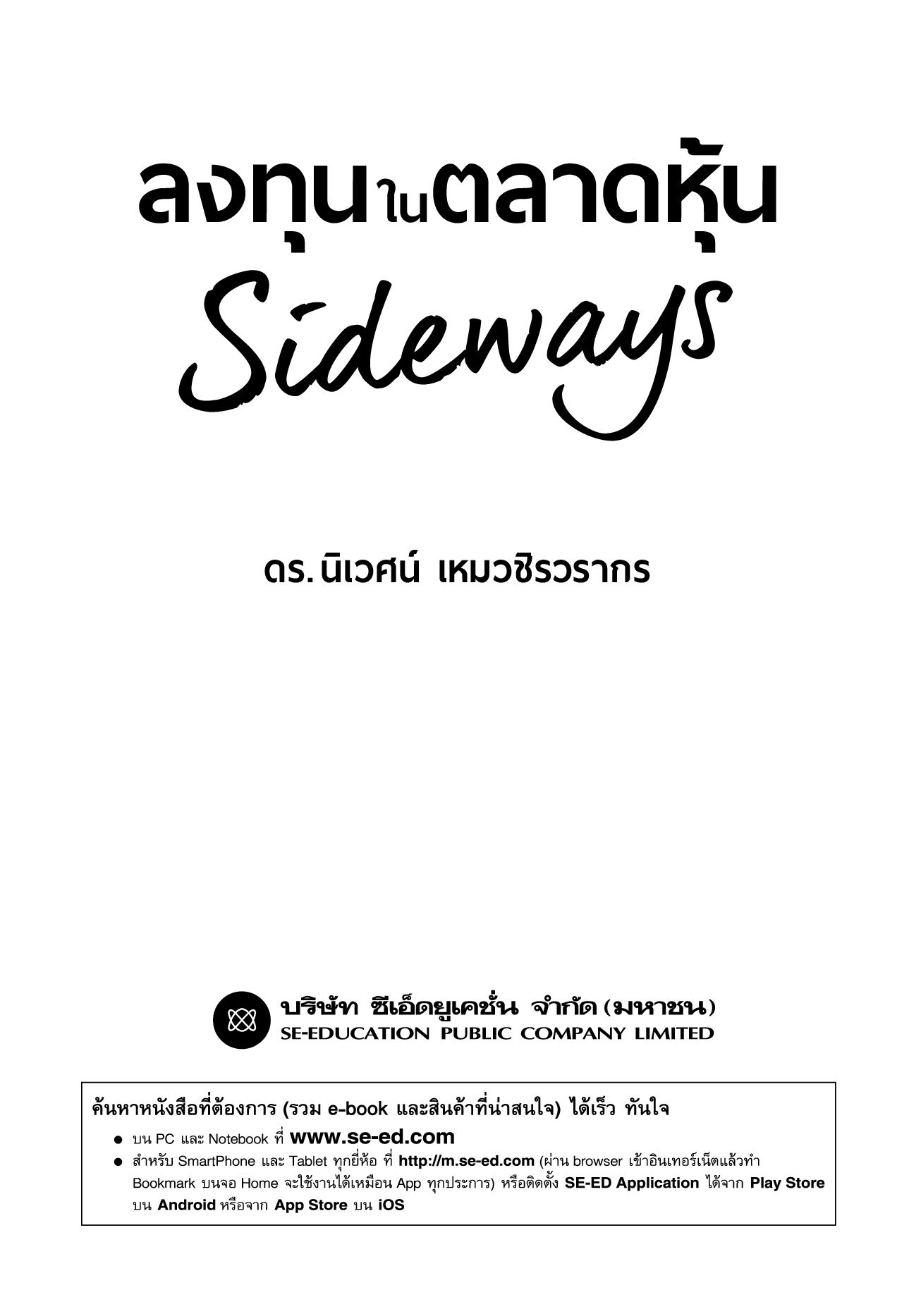 ตลาดหุ้น Sideways คือตลาดหุ้นที่ดัชนีไม่ไปไหนมายาวนาน แม้ว่าระหว่างนั้นหุ้นอาจจะตกลงมาแรง และขึ้นไปแรง เป็นช่วงๆ กลยุทธ์การเล่นหุ้นในตลาดแบบ Sideways ข้อแรกคือ ไม่ถือหุ้นร้อยเปอร์เซ็นต์ ควรถือเงินสดไว้บ้าง สอง เลือกหุ้นที่เติบโตขึ้นมากกว่าการปรับลดลงของค่า PE สาม ดูคุณภาพของบริษัทที่จะต้องดี ประเด็นสุดท้ายคือ เลือกหุ้นที่มีการปันผลที่ดี นี่เป็นหลักการ ที่กูรูการลงทุนชั้นแนวหน้าของเมืองไทยได้แนะนำไว้ และหนังสือเล่มนี้ได้อธิบายหลักการเหล่านี้อย่างละเอียด พร้อมข้อมูลที่ควรรู้มากมาย เพื่อให้การลงทุนของคุณเป็นไปอย่างที่ใจต้องการ