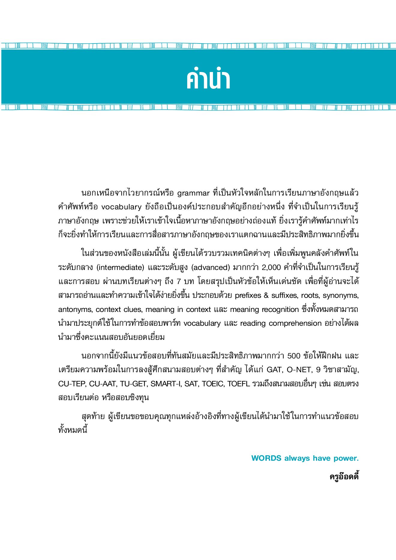 รวบรวมเทคนิคต่างๆ เพื่อเพิ่มพูนคลังคำศัพท์ในระดับกลาง (intermediate) และระดับสูง (advanced) มากกว่า 2,000 คำที่จำเป็นในการเรียนรู้และการสอบ แบ่งออกเป็น 7 บท โดยสรุปเป็นหัวข้อให้เห็นเด่นชัด เพื่อให้ผู้อ่านทาความเข้าใจได้ง่ายยิ่งขึ้น ประกอบด้วย prefixes & suffixes, roots, synonyms, antonyms, context clues, meaning in context และ meaning recognition ซึ่งทั้งหมดสามารถนามาประยุกต์ใช้ในการทำข้อสอบพาร์ท vocabulary และ reading comprehension อย่างได้ผล นอกจากนี้ยังมีแนวข้อสอบที่ทันสมัยและมีประสิทธิภาพมากกว่า 500 ข้อให้ฝึกฝน และเตรียมความพร้อมในสนามสอบต่างๆ ที่สาคัญ ไม่ว่าจะเป็นการสอบเรียนต่อ หรือสอบชิงทุน