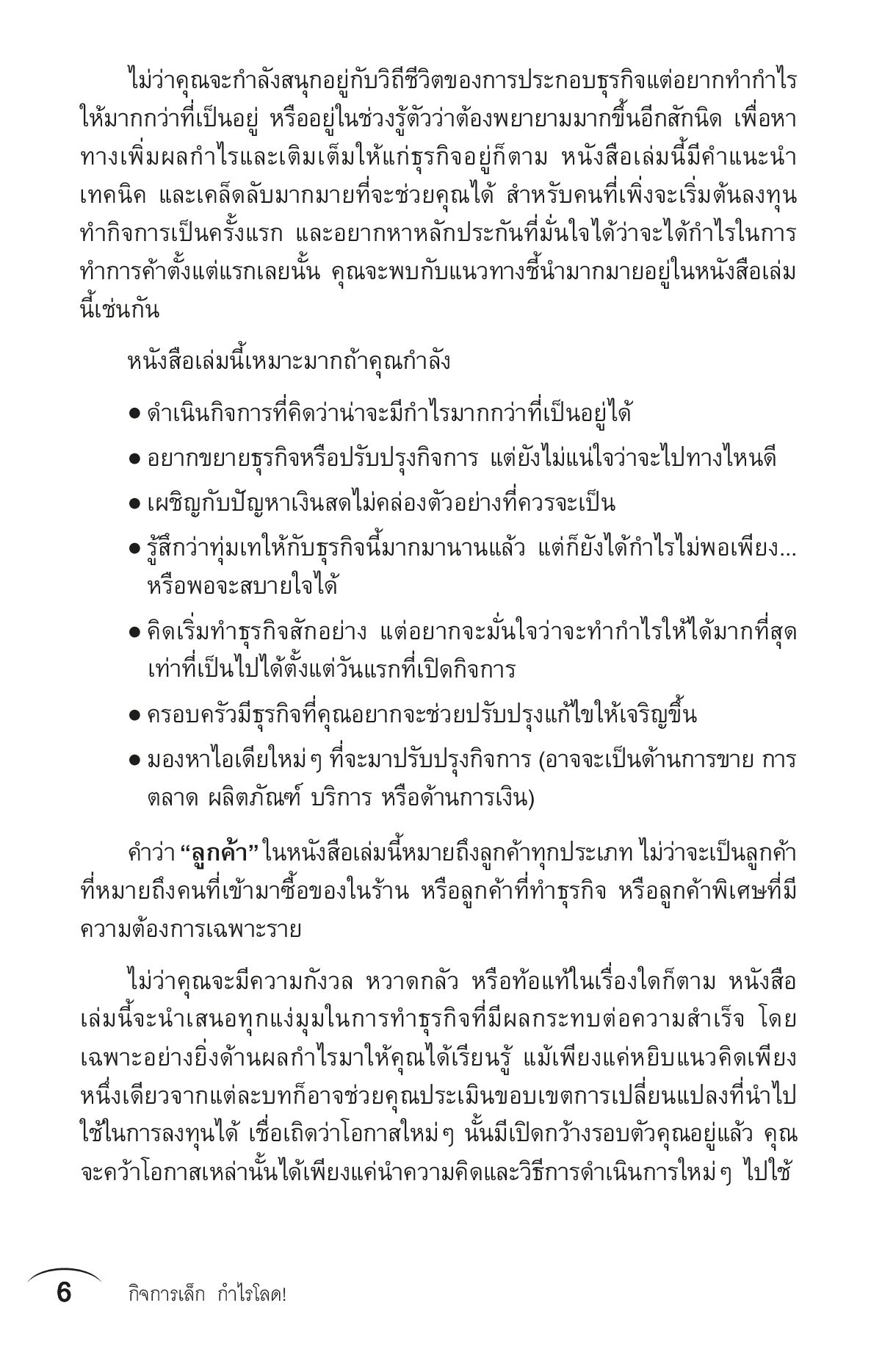 คำแนะนำ เทคนิค และเคล็ดลับมากมายที่จะช่วยคุณได้ สำหรับคนที่เพิ่งจะเริ่มต้นลงทุนทำกิจการเป็นครั้งแรก และอยากหาหลักประกันที่มั่นใจได้ว่าจะได้กำไรในการทำการค้าตั้งแต่ครั้งแรกเลยนั้น คุณจะพบแนวทางชี้นำมากมายจากในเล่ม แล้วคุณจะรู้ว่าการทำธุรกิจขนาดย่อมให้ได้กำไรสูงและงดงามนั้นไม่ใช่เรื่องยากอีกต่อไป...