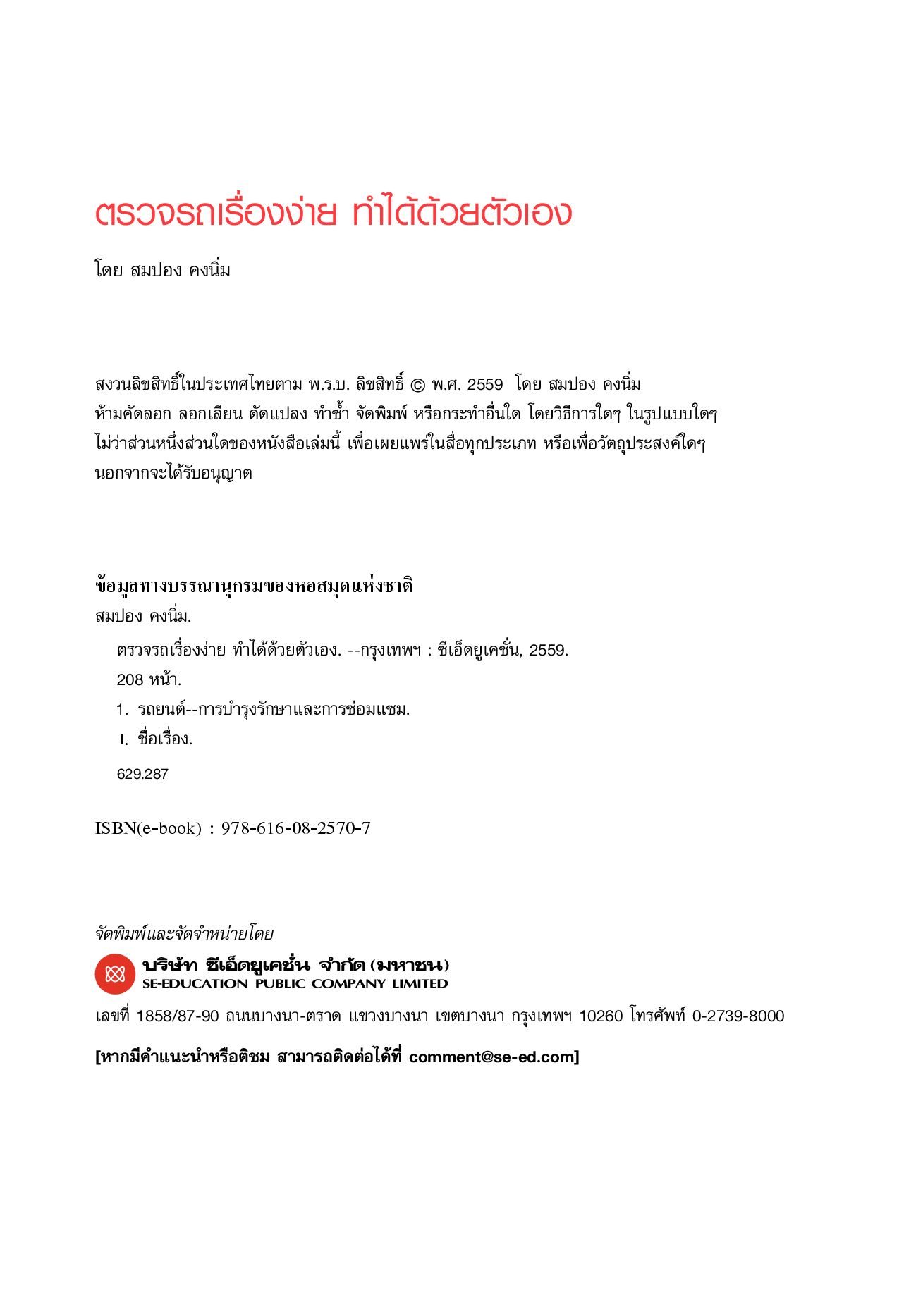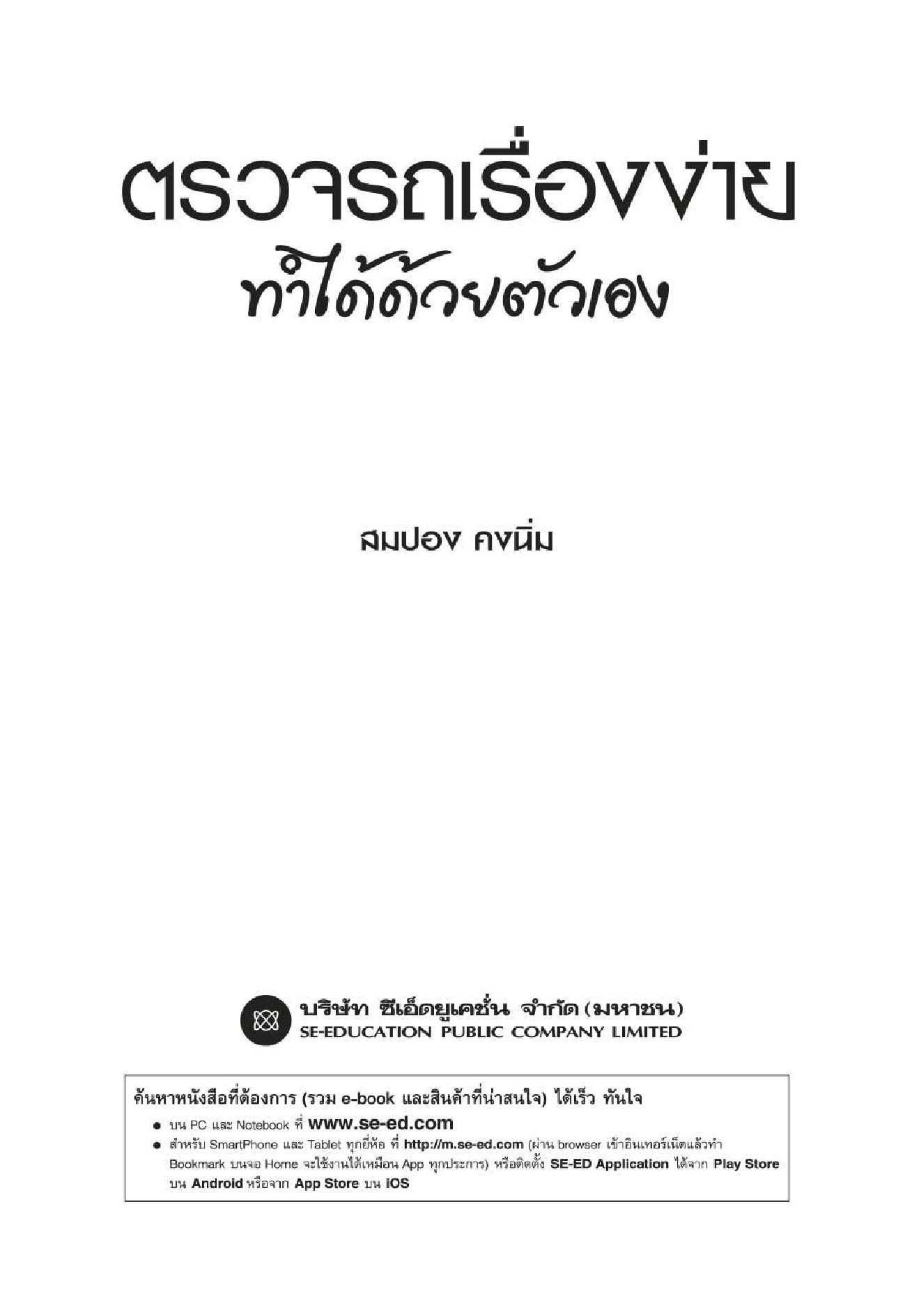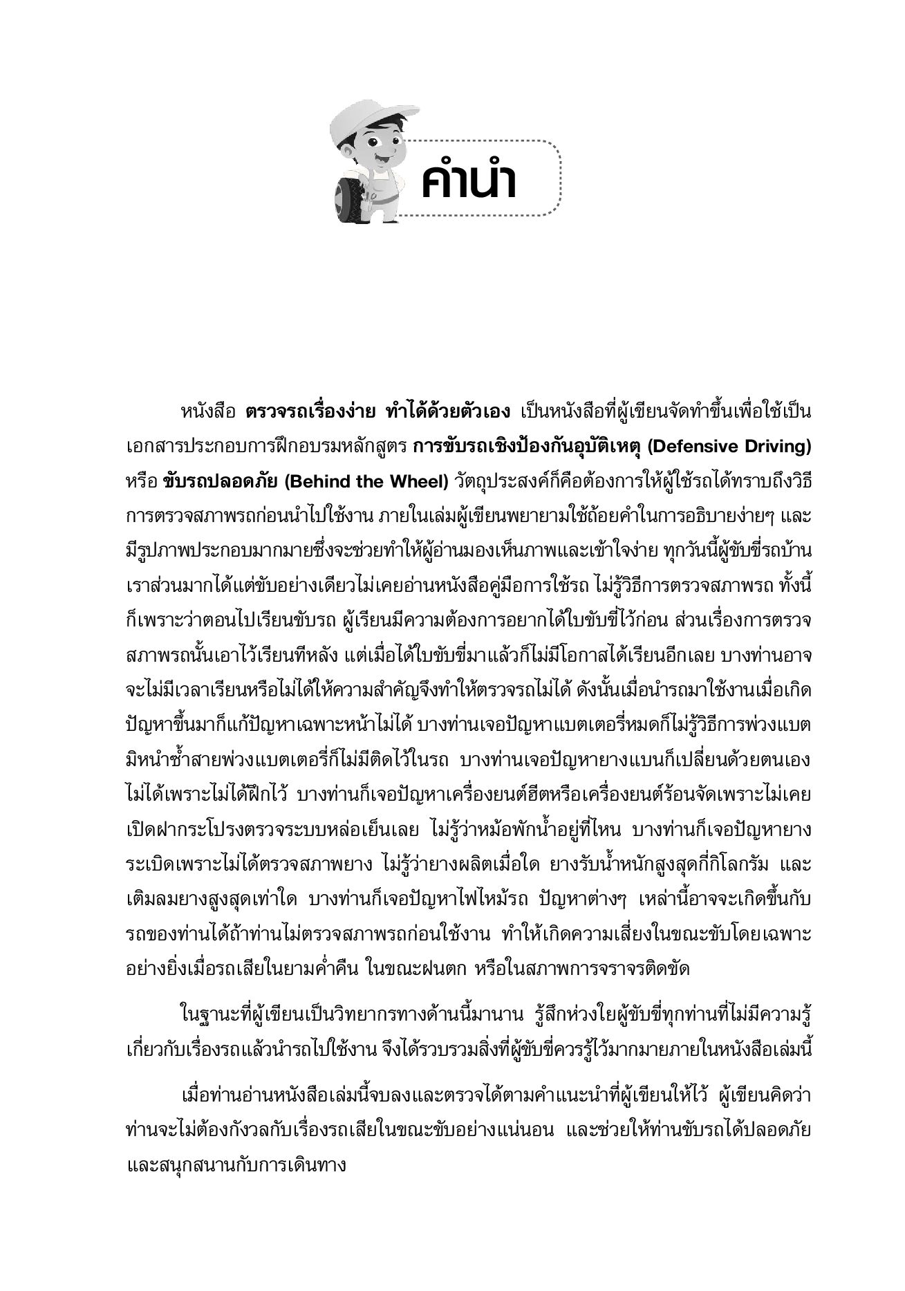 ให้คำแนะนำในการตรวจสภาพรถง่ายๆ ไม่ยุ่งยากซับซ้อน มีภาพประกอบคำอธิบายมากมาย เข้าใจง่าย ซึ่งถ้าทุกท่านปฏิบัติตามคำแนะนำของผู้เขียน รับรองว่าจะไม่เผชิญปัญหาเรื่องรถเสียในขณะขับอย่างแน่นอน หนังสือเล่มนี้จะช่วยให้คุณขับรถถึงจุดหมายปลายทางได้อย่างปลอดภัย เหมาะสำหรับผู้ขับขี่รถทุกท่าน