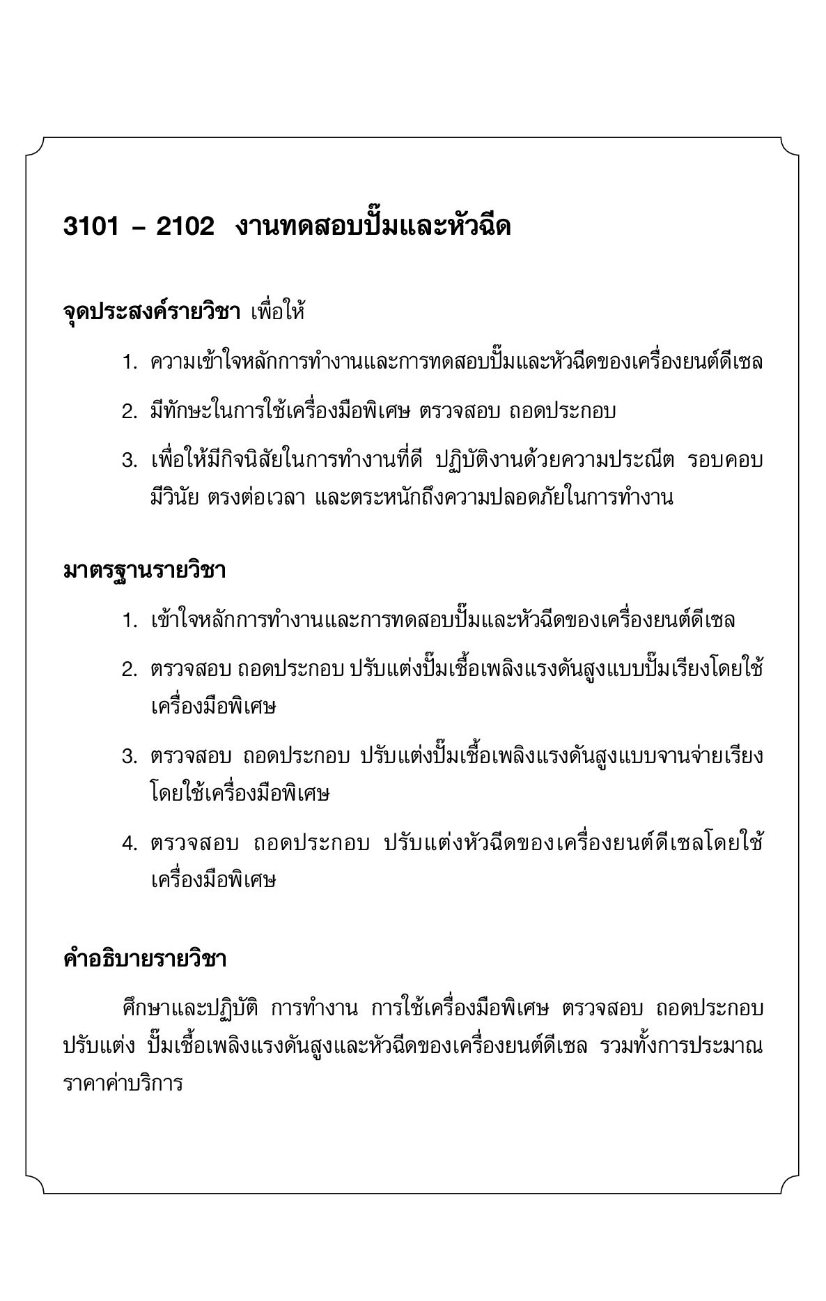 กล่าวถึงปั๊มฉีดเชื้อเพลิง หัวฉีดเชื้อเพลิง เครื่องควบคุมความเร็ว การจัดห้องทดสอบปั๊มและหัวฉีด พร้อมทั้งเครื่องมือพิเศษแบบต่างๆ ที่ใช้ในการปฏิบัติงานเกี่ยวกับการทดสอบปั๊มและหัวฉีด