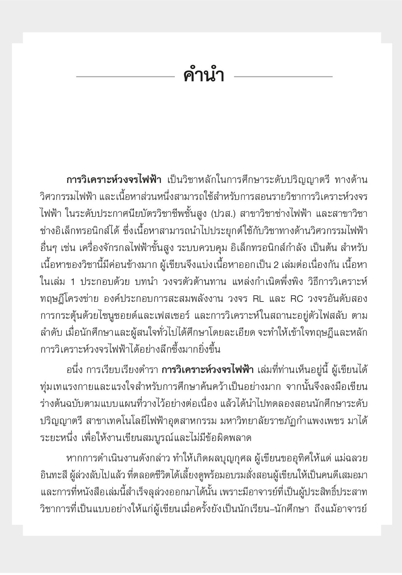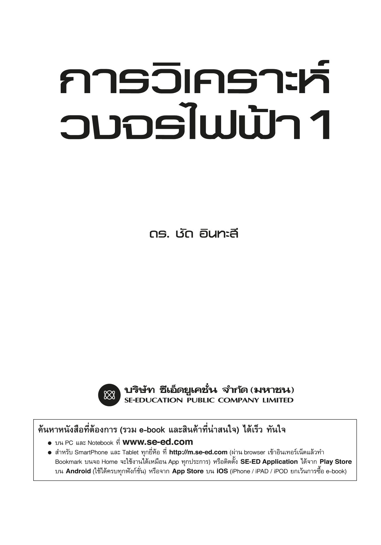 ให้เนื้อหาที่สำคัญเกี่ยวกับ "การวิเคราะห์วงจรไฟฟ้า 1" เริ่มตั้งแต่ทำความรู้จักกับวงจรตัวต้านทาน แหล่งกำเนิดพึ่งพิง วิธีการวิเคราะห์ทฤษฎีโครงข่าย องค์ประกอบการสะสมพลังงาน วงจร RL และ RC วงจรอันดับสองการกระตุ้นด้วยไซนูซอยด์และเฟสเซอร์ และการวิเคราะห์ในสถานะอยู่ตัวไฟสลับ ตามลำดับ เมื่อนักศึกษาและผู้สนใจทั่วไปได้ศึกษาโดยละเอียด จะทำให้เข้าทฤษฎีและหลักการวิเคราะห์วงจรไฟฟ้าได้อย่างลึกซึ้งมากยิ่งขึ้น