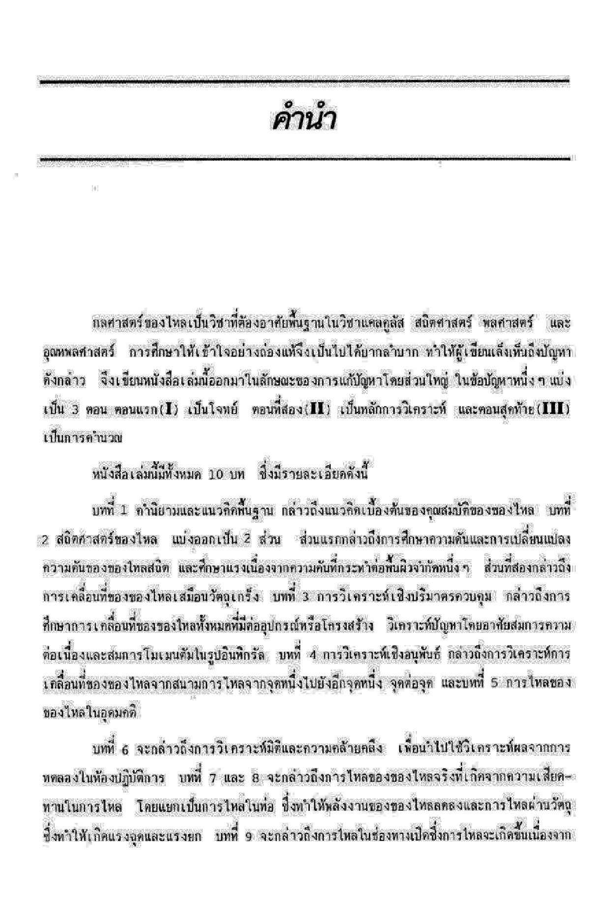 กลศาสตร์ของไหลเป็นวิชาที่ต้องอาศัยพื้นฐานในวิชาแคลคูลัส สถิตศาสตร์ พลศาสตร์ และอุณหพลศาสตร์ การศึกษาให้เข้าใจอย่างถ่องแท้จึงเป็นไปได้ยากลำบาก เพื่อขจัดปัญหาดังกล่าว หนังสือเล่มนี้จึงได้เขียนออกมาในลักษณะของการแก้ปัญหาโดยส่วนใหญ่ ซึ่งในปัญหาข้อหนึ่ง ๆ จะแบ่งเป็น 3 ตอน คือ โจทย์ หลักการวิเคราะห์ และการคำนวณ ตามลำดับ เนื้อหาภายในกล่าวเริ่มต้นตั้งแต่คำนิยามและแนวคิดพื้นฐาน สถิตศาสตร์ของไหล การวิเคราะห์ปริมาตรควบคุม การวิเคราะห์เชิงอนุพันธ์ การไหลของของไหลในอุดมคติ การวิเคราะห์มิติและความคล้ายคลึงเพื่อนำไปใช้วิเคราะห์ผลจากการทดลองในห้องปฏิบัติการ การไหลของของไหลจริงที่เกิดจากความเสียดทานในการไหล การไหลในช่องทางเปิดซึ่งการไหลจะเกิดขึ้นเนื่องจากอิทธิพลของความโน้มถ่วง และการไหลที่มีการยุบตัวในกระบวนการไหลแบบต่าง ๆ ซึ่งหนังสือเล่มนี้จะช่วยสรุปทฤษฎีและเพิ่มประสบการณ์ในการแก้โจทย์ปัญหาต่าง ๆ ดังกล่าวด้วย