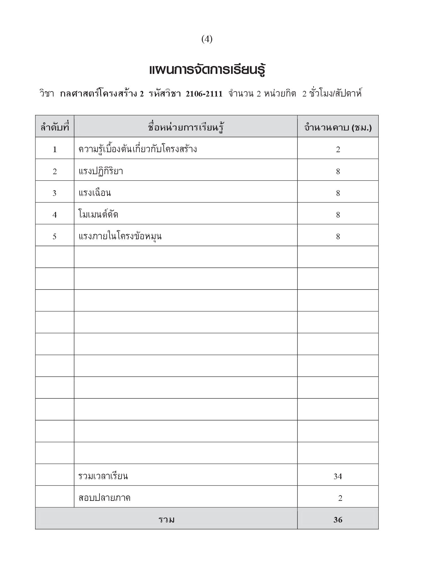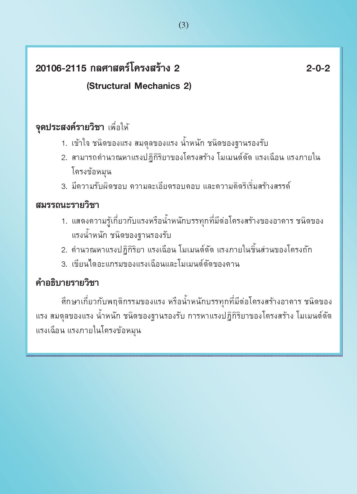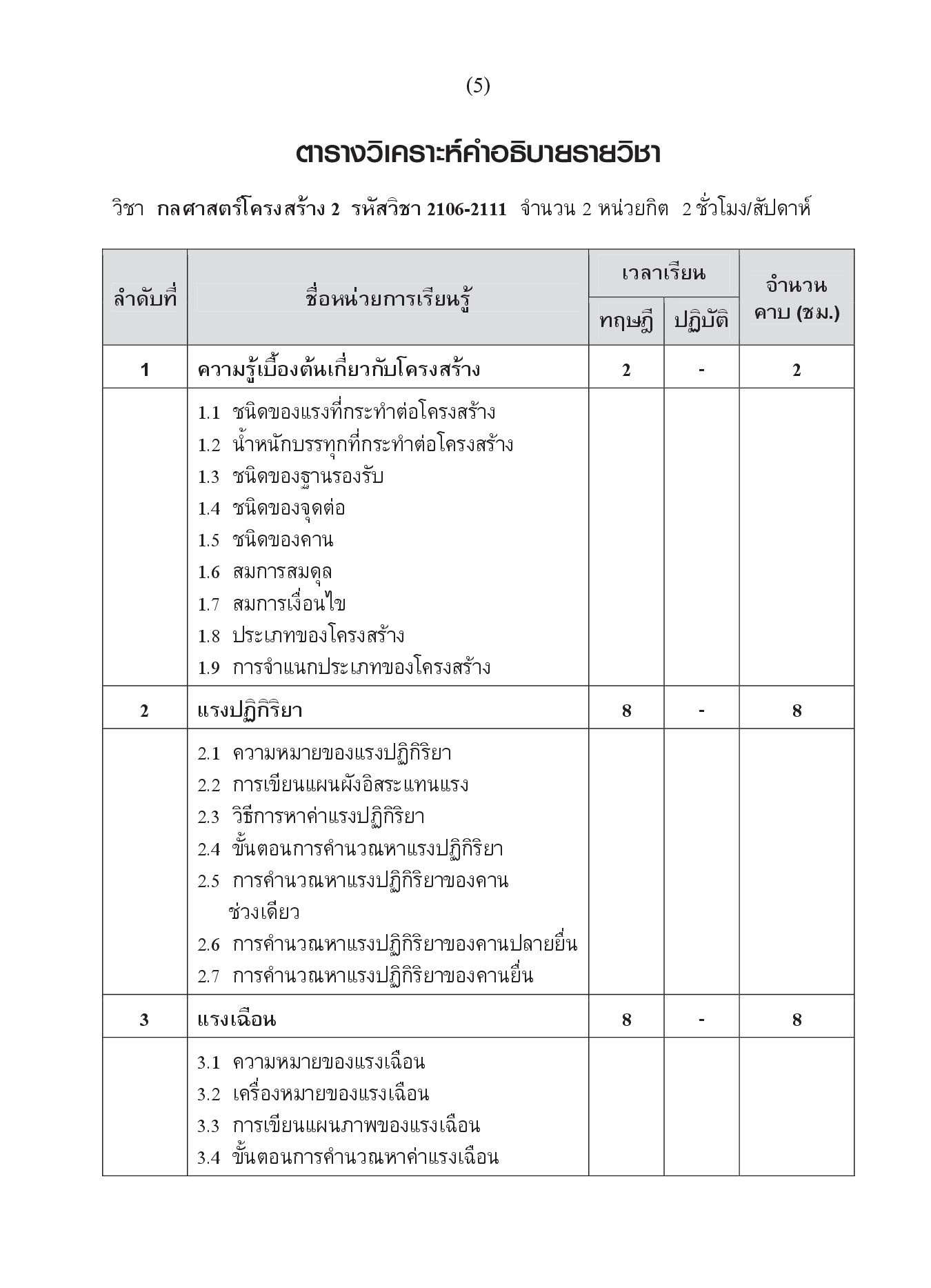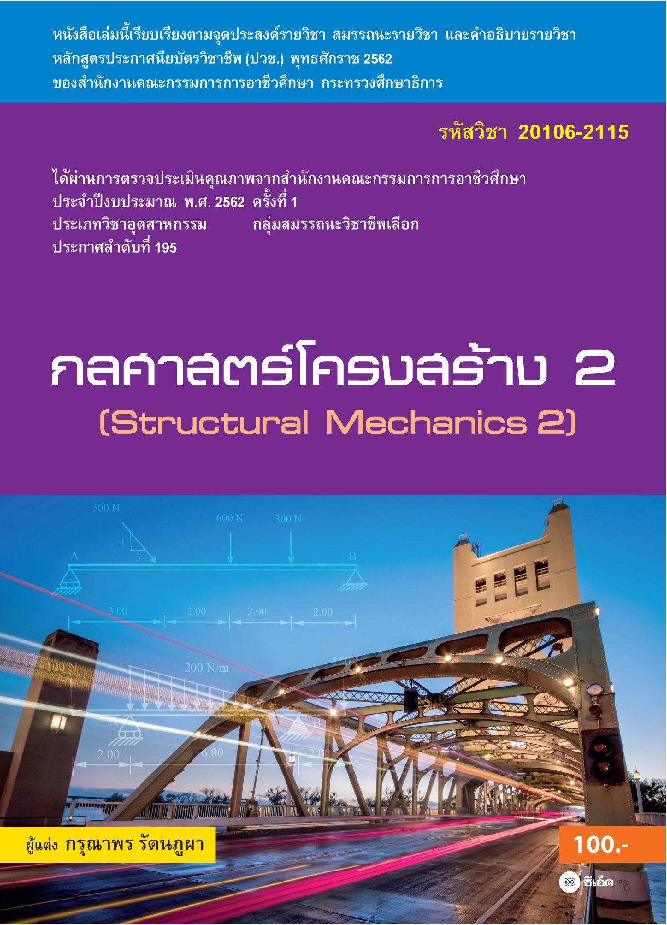 "กลศาสตร์โครงสร้าง 2 (รหัสวิชา 20106-2115)" เขียนขึ้นตามจุดประสงค์รายวิชา สมรรนะรายวิชาและคำอธิบายรายวิชา ตามหลักสูตรประกาศนียบัตรวิชาชีพ (ปวช.) พุทธศักราช 2562 ประเภทวิชาอุตสาหกรรม สาขาวิชาช่างก่อสร้าง เนื้อหาวิชาประกอบด้วย ความรู้เบื้องต้นเกี่ยวกับโครงสร้าง แรงปฏิกิริยา แรงเฉือน โมเมนต์ดัด และแรงภายในชิ้นส่วนของโครงข้อหมุน โดยเน้นตัวอย่างประกอบที่หลากหลายพร้อมภาพประกอบ แบบทดสอบหลังเรียน และแบบฝึกหัดท้ายบทเรียน เพื่อให้ผู้เรียนได้รับความรู้ ความเข้าใจมากที่สุด ช่วยให้การเรียนการสอนเป็นไปอย่างมีประสิทธิภาพ ตรงตามจุดประสงค์ของหลักสูตร