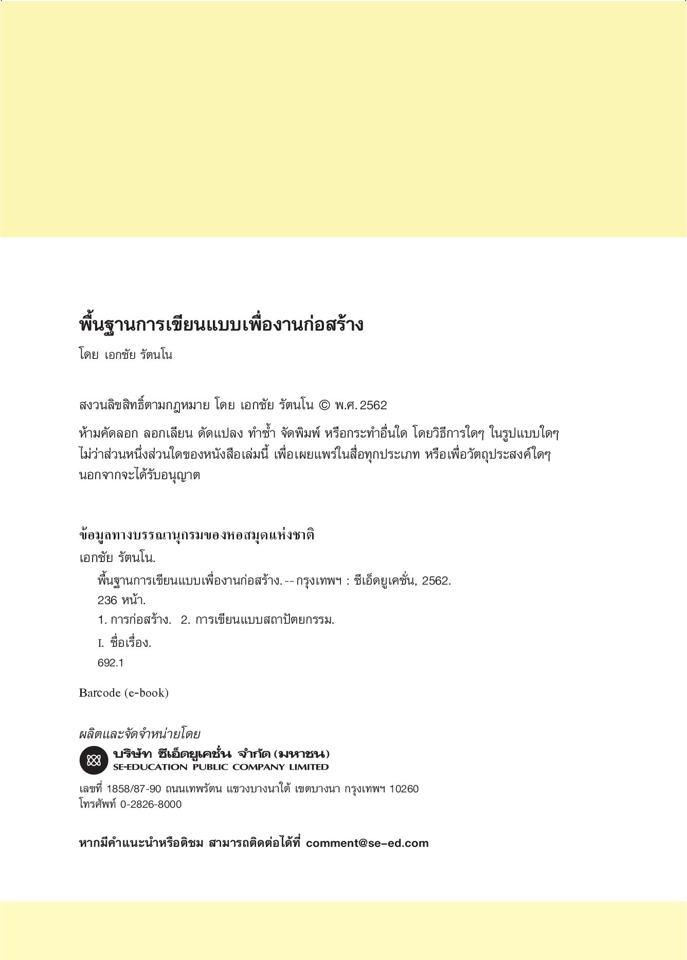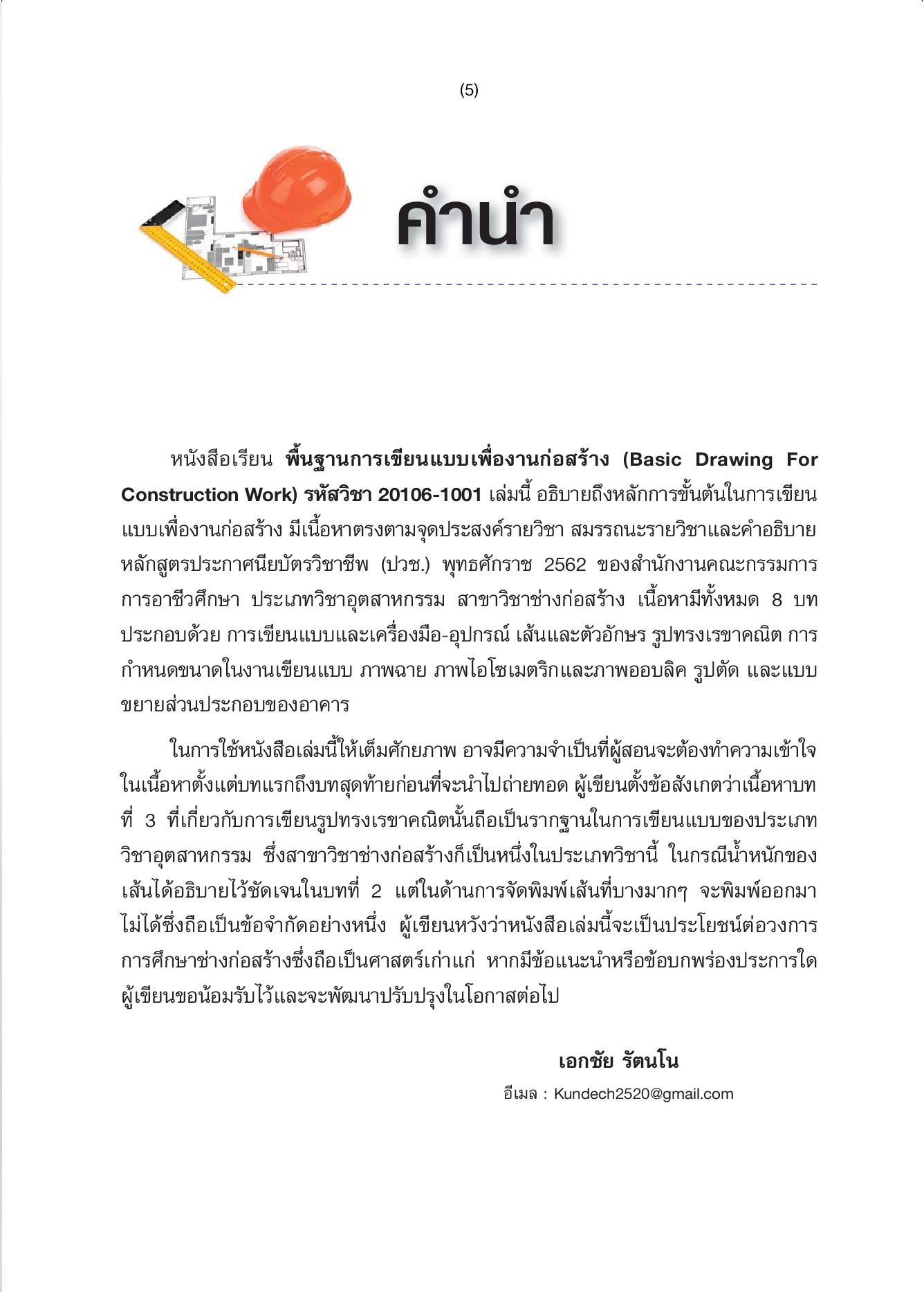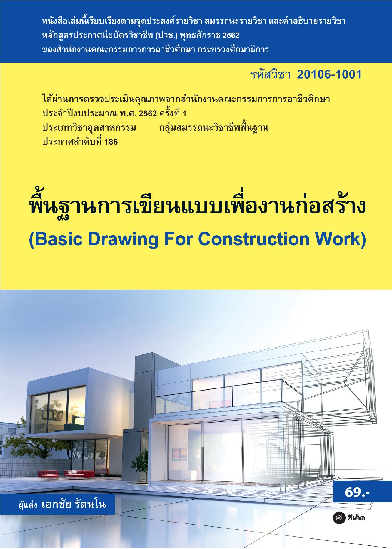 "พื้นฐานการเขียนแบบเพื่องานก่อสร้าง (สอศ.) (รหัสวิชา 20106-1001)" เล่มนี้ อธิบายถึงหลักการขั้นต้นในการเขียนแบบเพื่องานก่อสร้าง มีเนื้อหาตรงตามจุดประสงค์รายวิชา สมรรถนะรายวิชา และคำอธิบายรายวิชา หลักสูตรประกาศนียบัตรวิชาชีพ (ปวช.) พุทธศักราช 2562 ของสำนักงานคณะกรรมการการอาชีวศึกษา กระทรวงศึกษาธิการ ประเภทวิชาอุตสาหกรรม สาขาวิชาช่างก่อสร้าง เนื้อหามีทั้งหมด 8 บท ประกอบด้วย การเขียนแบบและเครื่องมือ-อุปกรณ์ เส้นและตัวอักษร รูปทรงเรขาคณิต การกำหนดขนาดและมาตราส่วน ภาพฉาย ภาพไอโซเมตริกและภาพออบลิค รูปตัด และแบบขยายส่วนประกอบของอาคาร อธิบายเนื้อหาอย่างกระชับ เป็นลำดับขั้น เข้าใจง่าย พร้อมใบงานและแบบฝึกหัดท้ายบทเพื่อทบทวนความรู้ภายในบทเรียน