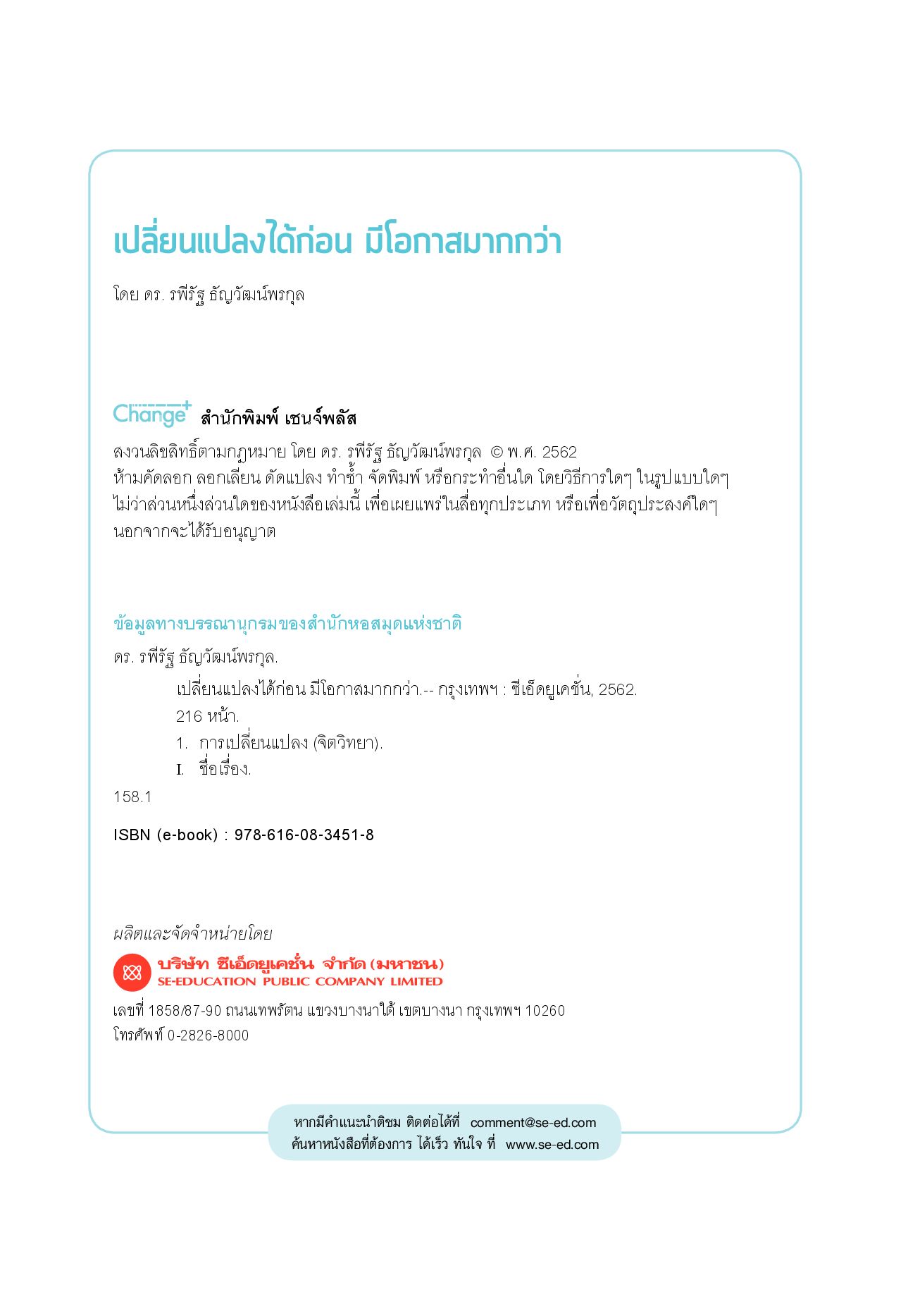 "เปลี่ยนแปลงได้ก่อน มีโอกาสมากกว่า" เล่มนี้ นำเสนอเนื้อหาเกี่ยวกับแง่มุมของการเปลี่ยนแปลงหลายๆ ด้าน เพื่อให้ผู้อ่านทั่วไปโดยเฉพาะ "มนุษย์เงินเดือนทุกคน" ได้ตระหนัก เปลี่ยนแปลงตัวเอง และเตรียมพร้อมรับมือกับการเปลี่ยนแปลงต่างๆ คนที่พร้อมรับมือกับการเปลี่ยนแปลง และคนที่เปลี่ยนแปลงไปก่อนที่จะถูกบังคับให้เปลี่ยนแปลง ย่อมจะได้เปรียบ และมีแต้มต่อมากกว่าคนที่ยังไม่เปลี่ยนแปลงใดๆ ซึ่งการเปลี่ยนแปลงใดๆ ก็ตาม จะทำให้เกิดสิ่งใหม่ๆ เรื่องใดเรื่องหนึ่งเสมอ อาจจะไม่ดีขึ้น หรืออาจจะแย่ลง แต่อย่างน้อย ก็ทำให้เกิดการเรียนรู้จากการเปลี่ยนแปลงนั้นๆ และในครั้งต่อไปจะได้เพิ่มการคิดและวางแผนไว้ล่วงหน้า ซึ่งจะทำให้เกิดผลดีมากกว่าผลเสียอย่างแน่นอน ด้วยเนื้อหาของหนังสือเล่มนี้ จะทำให้มนุษย์เงินเดือนทุกคนพร้อมที่จะเปลี่ยนแปลงตัวเองได้ในทุกๆ สถานการณ์!