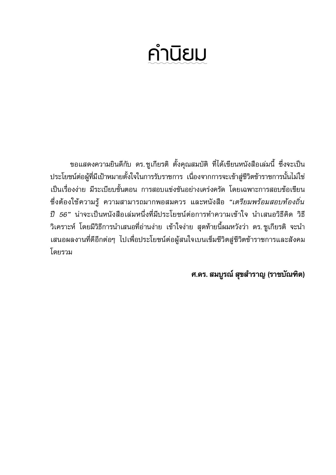 ขอแสดงความยินดีกับ ดร.ชูเกียรติ ตั้งคุณสมบัติ ที่ได้เขียนหนังสือเล่มนี้ ซึ่งจะเป็นประโยชน์ต่อผู้ที่มีเป้าหมายตั้งใจในการรับราชการ เนื่องจากการจะเข้าสู่ชีวิตข้าราชการนั้น ไม่ใช่เป็นเรื่องง่าย มีระเบียบขั้นตอน การสอบแข่งขันอย่างเคร่งครัด โดยเฉพาะการสอบข้อเขียน ซึ่งต้องใช้ความรู้ ความสามารถพอสมควร และหนังสือ "เตรียมพร้อมสอบท้องถิ่นปี 56" น่าจะเป็นหนังสือเล่มหนึ่งที่มีประโยชน์ต่อการทำความเข้าใจ
