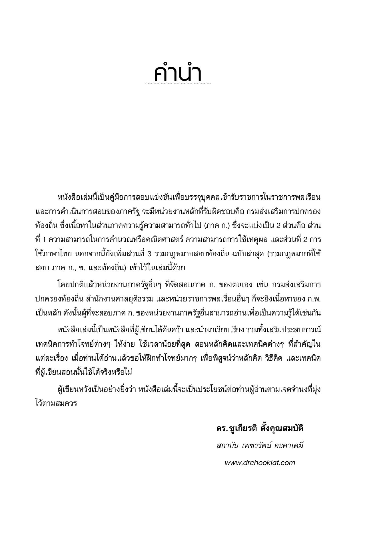 รวบรวมความรู้และแนวข้อสอบ เพื่อเป็นคู่มือสำหรับผู้ที่ต้องการสอบแข่งขันเพื่อบรรจุเข้ารับราชการ ในสังกัดกรมส่งเสริมการปกครองท้องถิ่น โดยเนื้อหาในส่วนภาคความรู้ความสามารถทั่วไป (ภาค ก.) จะแบ่งเป็น 2 ส่วนคือ ส่วน ที่ 1 ความสามารถในการคำนวณหรือคณิตศาสตร์ ความสามารถการใช้เหตุผล และส่วนที่ 2 การใช้ภาษาไทย นอกจากนี้ยังเพิ่มส่วนที่ 3 รวมกฎหมายสอบท้องถิ่น ฉบับล่าสุด (รวมกฎหมายที่ใช้สอบ ภาค ก., ข. และท้องถิ่น) เข้าไว้ในเล่มนี้อีกด้วย