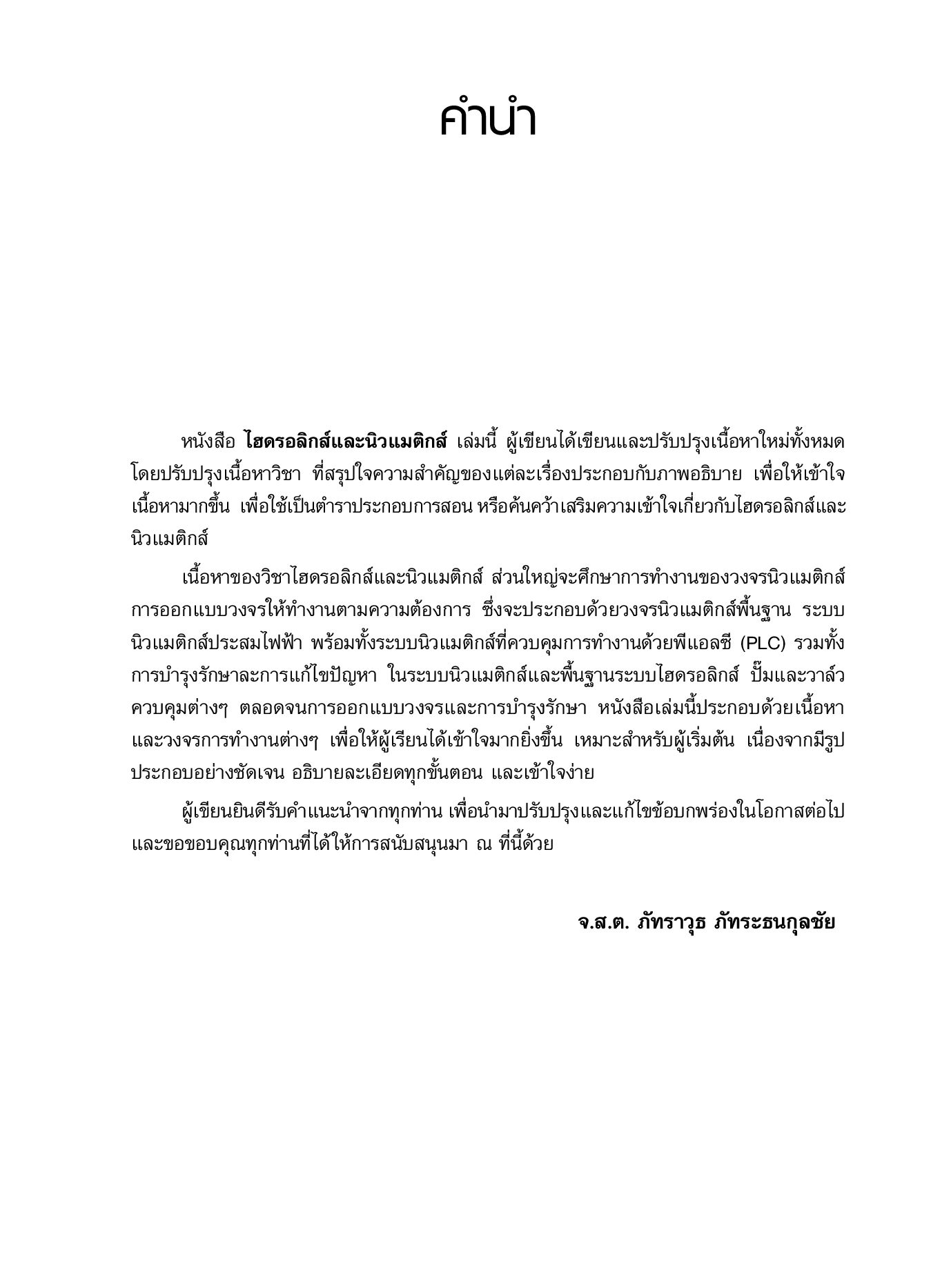 "ไฮดรอลิกส์และนิวแมติกส์" เล่มนี้ ได้เรียบเรียงและปรับปรุงเนื้อหาใหม่ทั้งหมด โดยสรุปใจความสำคัญของแต่ละเนื้อหา มีรูปประกอบคำอธิบายเพื่อให้เข้าใจเนื้อหามากขึ้น และสามารถใช้เป็นตำราประกอบการเรียนการสอน หรือค้นคว้าเสริมความเข้าใจเกี่ยวกับนิวแมติกส์และไฮดรอลิกส์ ซึ่งเนื้อหาประกอบด้วยการทำงานของวงจรนิวแมติกส์ การออกแบบวงจรให้ทำงานตามความต้องการ ประกอบด้วยวงจรนิวแมติกส์พื้นฐาน ระบบนิวแมติกส์ประสมไฟฟ้า ระบบนิวแมติกส์ที่ควบคุมการทำงานด้วย PLC การบำรุงรักษาและการแก้ไขปัญหาในระบบนิวแมติกส์ พื้นฐานระบบไฮดรอลิกส์ ปั๊มและวาล์วควบคุมต่างๆ ตลอดจนการออกแบบวงจรและการบำรุงรักษา เหมาะสำหรับผู้เริ่มต้นศึกษาวิชาไฮดรอลิกส์และนิวแมติกส์ในระดับอุดมศึกษาและบุคคลที่สนใจทั่วไป
