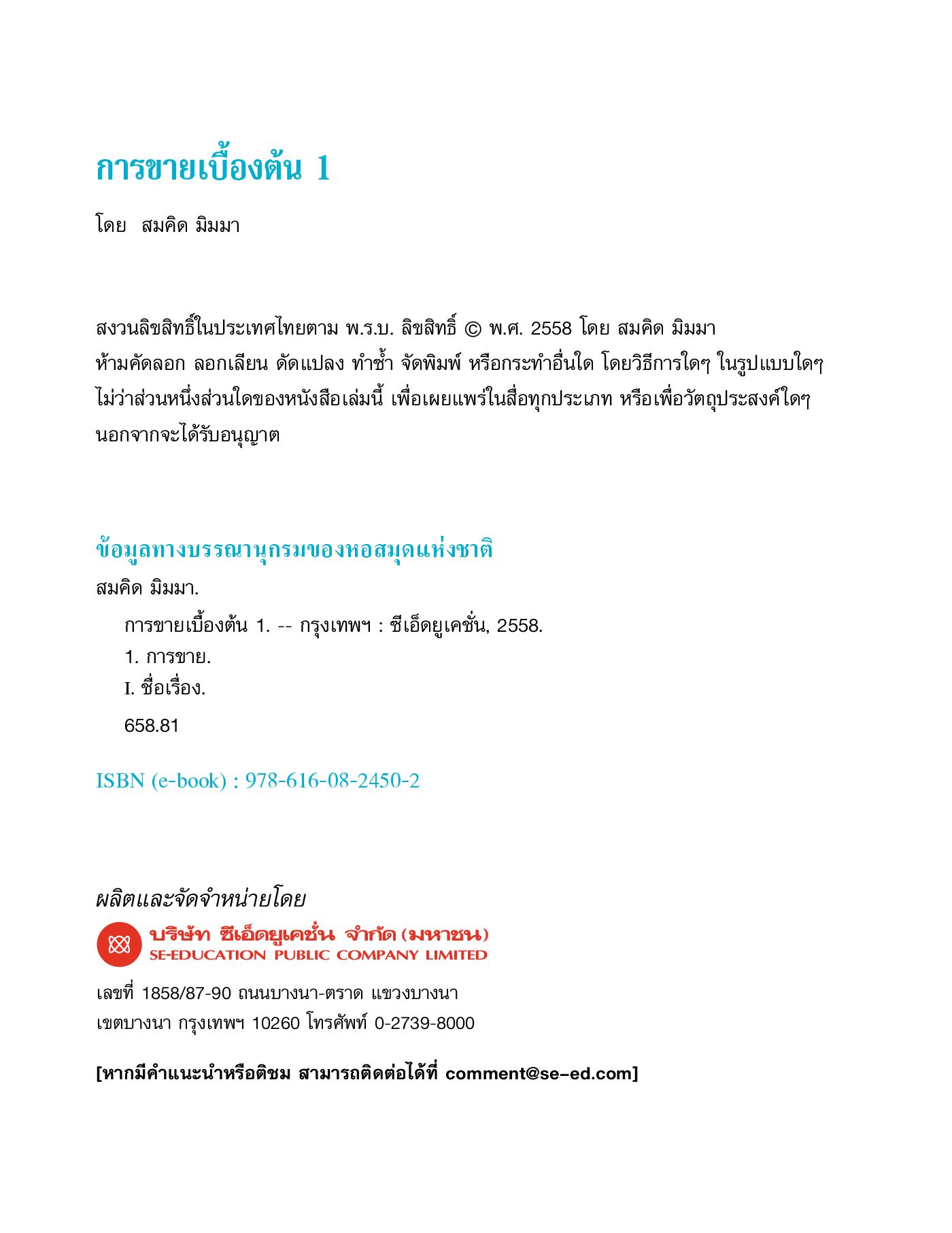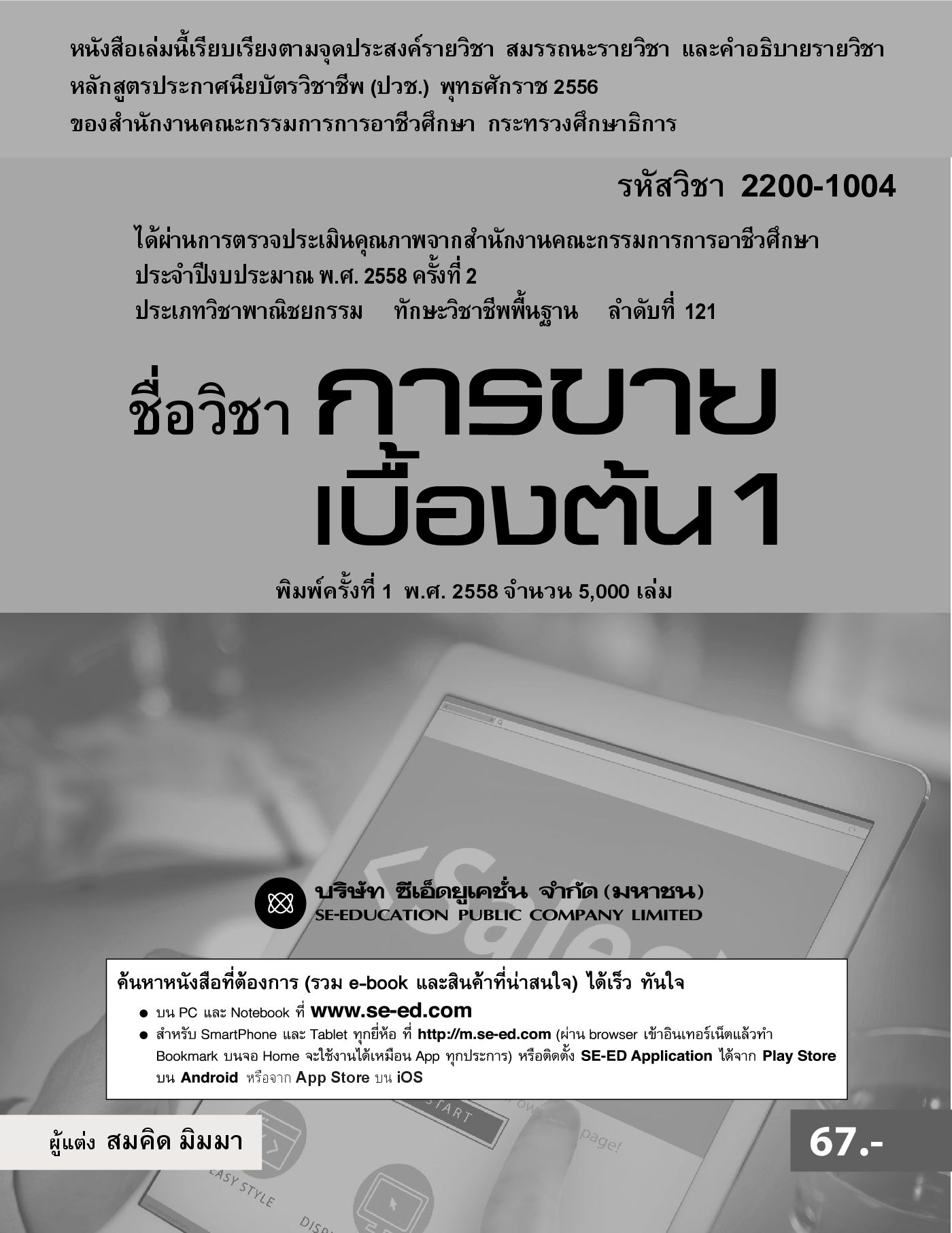 "การขายเบื้องต้น 1 รหัส 2200 - 1004" เหมาะสำหรับนำไปใช้ประกอบการเรียนในหลักสูตรประกาศนียบัตรวิชาชีพ (ปวช.) พุทธศักราช 2556 ประเภทวิชาพาณิชยกรรม ซึ่งมีเนื้อหาครอบคลุมและตรงตามหลักสูตรของสำนักงานคณะกรรมการ การอาชีวศึกษา กระทรวงศึกษาธิการ โดยเนื้อหามี 8 บท ประกอบด้วย บทที่ 1 ความรู้ทั่วไปเกี่ยวกับการขาย บทที่ 2 ประเภทและลักษณะของงานขาย บทที่ 3 ความรู้เกี่ยวกับตนเอง บทที่ 4 ความรู้เกี่ยวกับกิจการ บทที่ 5 ความรู้เกี่ยวกับผลิตภัณฑ์ บทที่ 6 ความรู้เกี่ยวกับลูกค้า บทที่ 7 ความรู้เกี่ยวกับคู่แข่งขัน และ บทที่ 8 คุณสมบัติและโอกาสความก้าวหน้าของพนักงานขาย ในแต่ละบทจะมีกิจกรรมระหว่างเรียน ใบงาน และแบบประเมินผลหลังเรียนเพื่อเป็นการทบทวนเนื้อหาที่ได้ศึกษามา