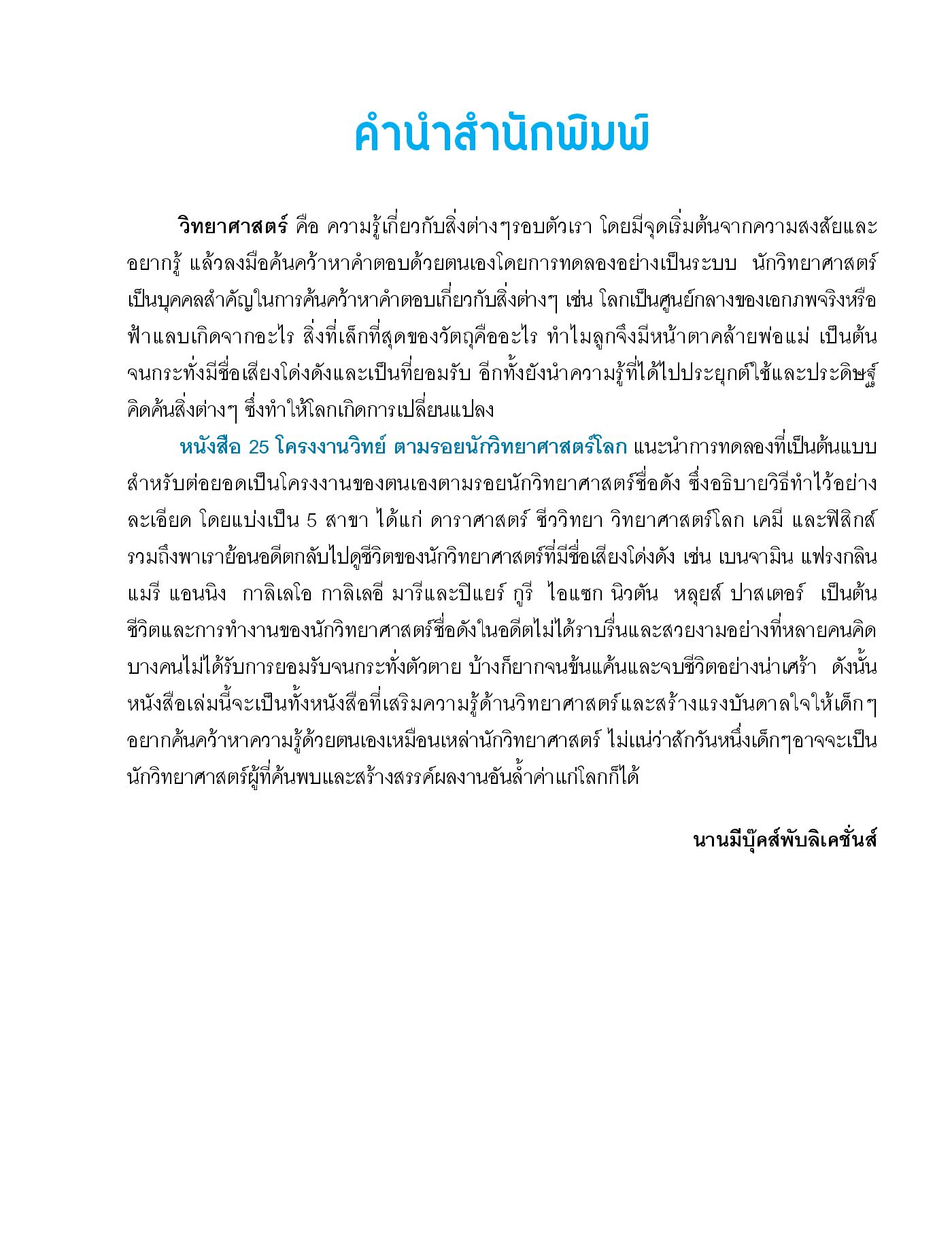 25 โครงงานวิทย์ ตามรอยนักวิทยาศาสตร์โลก พาย้อนอดีตกลับไปดูชีวิตของสุดยอดนักวิทยาศาสตร์ทั้ง 5 สาขา ได้แก่ นักดาราศาสตร์ นักชีววิทยา นักวิทยาศาสตร์โลก นักเคมี และนักฟิสิกส์ และรวบรวมการทดลองเด่นตามรอยนักวิทยาศาตร์ 25 การทดลอง พร้อมภาพประกอบสวยงาม