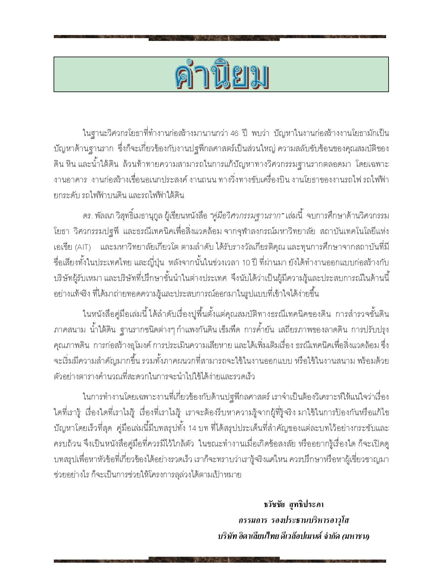 "คู่มือวิศวกรรมฐานราก" เล่มนี้ ปูพื้นตั้งแต่คุณสมบัติทางธรณีเทคนิคของดิน การสำรวจชั้นดินภาคสนาม น้ำใต้ดิน ฐานรากชนิดต่างๆ กำแพงกันดิน เข็มพืด การค้ำยัน เสถียรภาพของลาดดิน การปรับปรุงคุณภาพดิน การก่อสร้างอุโมงค์ การประเมินความเสียหาย ธรณีเทคนิคเพื่อสิ่งแวดล้อม ซึ่งจะเริ่มมีความสำคัญมากขึ้น รวมทั้งภาคผนวกที่สามารถจะใช้ในงานออกแบบ หรือใช้ในงานสนาม พร้อมด้วยตัวอย่างตารางคำนวณที่สะดวกในการนำไปใช้ได้ง่ายและเร็ว ถ่ายทอดจากประสบการณ์การทำงานตลอดระยะเวลาเกือบ 10 ปีของผู้เขียน ผนวกกับการสังเคราะห์ความรู้ที่ทันสมัย อีกทั้งได้สอดแทรกตัวอย่างปัญหาที่ประสบจริงจากการทำงาน เพื่อให้ผู้อ่านสามารถนำไปประยุกต์ใช้ได้อย่างมีประสิทธิภาพ ครบถ้วนด้วยเนื้อหาทางวิชาการและวิชาชีพ เหมาะสำหรับวิศวกรโยธาที่จะนำไปใช้ประกอบวิชาชีพทั้งงานออกแบบและงานก่อสร้าง หรือนำไปใช้เสริมการเรียนการสอนในระดับอุดมศึกษา นอกจากนี้ยังเป็นประโยชน์ต่อผู้ที่เตรียมตัวสอบเป็นภาคีวิศวกรโยธาหรือเลื่อนระดับเป็นสามัญวิศวกรโยธา รวมถึงผู้ที่ต้องการทดสอบความรู้พื้นฐานด้านวิศวกรรมโยธาในต่างประเทศ เพื่อยกระดับวิชาชีพตนเองสู่สากลอีกด้วย
