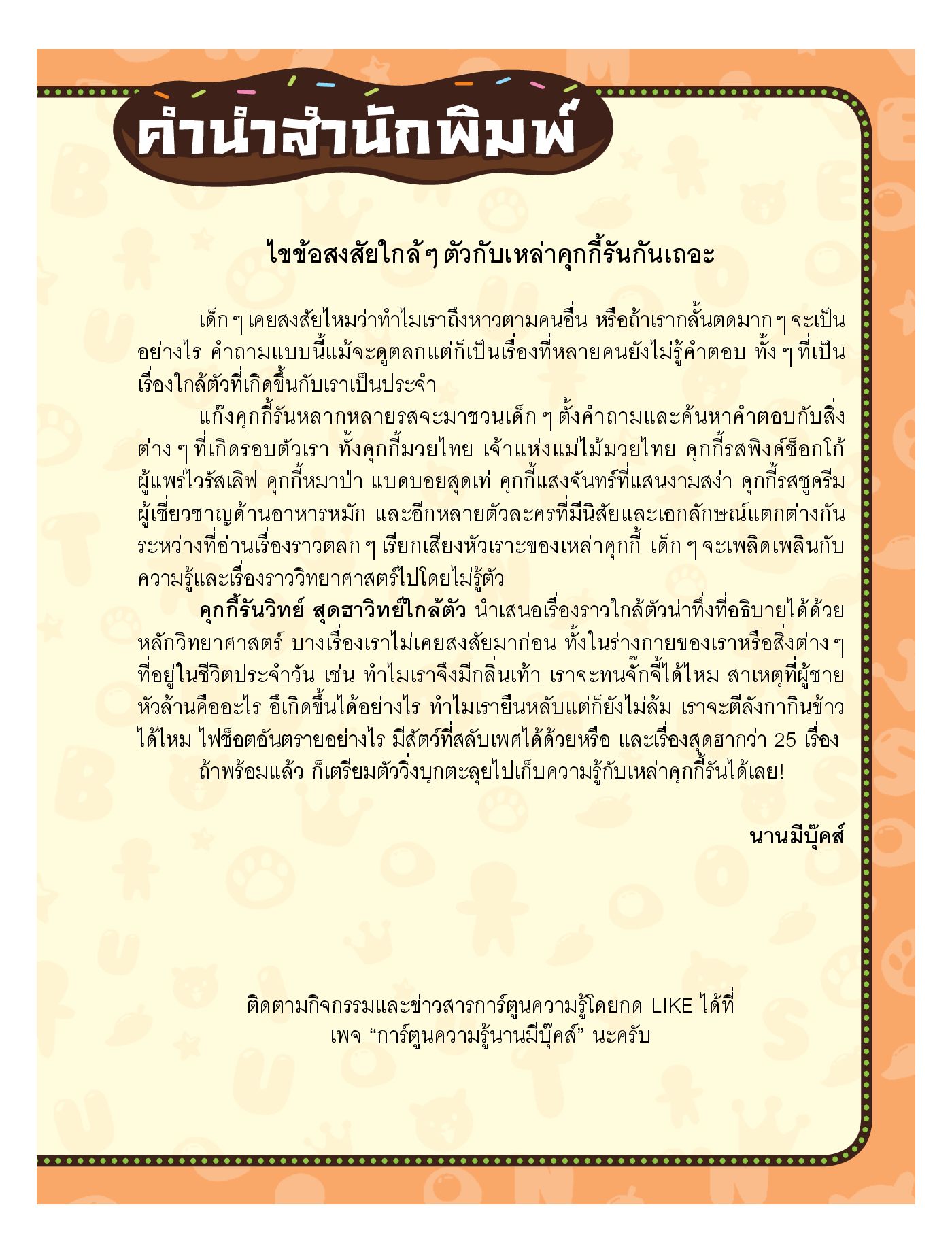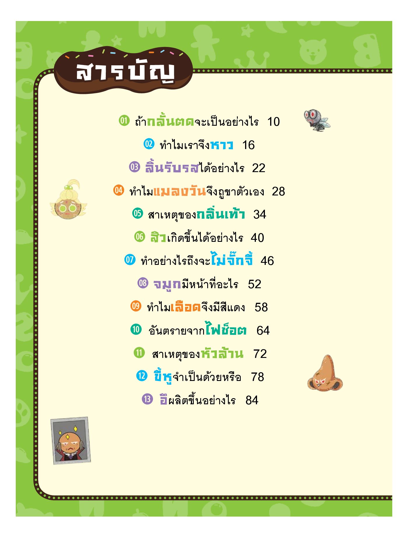 เหล่าตัวละครคุกกี้รันที่เด็ก ๆ ชื่นชอบ จะมาเล่าเรื่องราววิทยาศาสตร์ใกล้ ๆ ตัวชวนสงสัย 25 เรื่อง เช่น ทำไมเราจึงมีกลิ่นเท้า เราจะทนการจั๊กจี้ได้ไหมสาเหตุที่ผู้ชายหัวล้านคืออะไร อึเกิดขึ้นได้อย่างไร ทำไมเราถึงหาว เราจะตีลังกากินข้าวได้ไหม ไฟช็อตอันตรายอย่างไร สาเหตุของกลิ่นเท้าเหม็น มีสัตว์ที่สลับเพศได้ด้วยหรือ! ติดตามความสนุกพร้อมกันในเล่ม