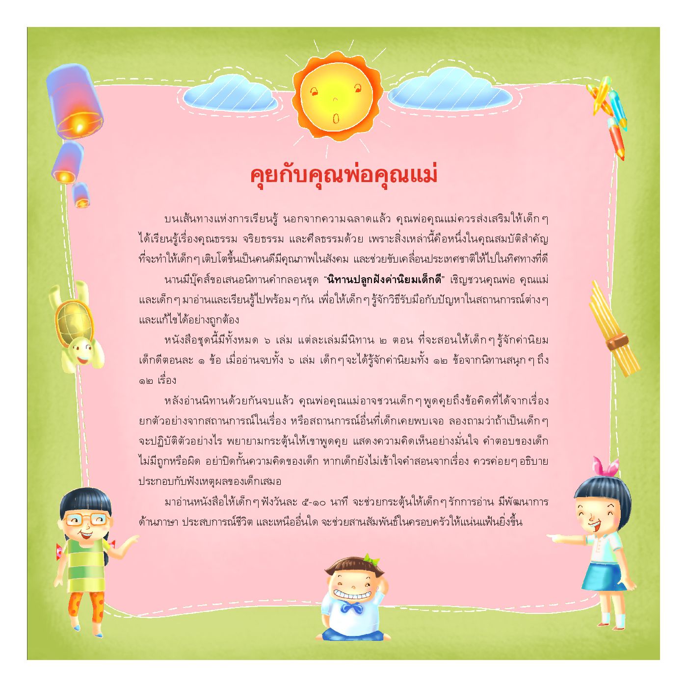 นิทานคำกลอนส่งเสริมค่านิยมหลักของคนไทยทั้ง 12 ประการ เล่มนี้มีเนื้อหาส่งเสริมให้เด็กๆรู้จักประเพณีและวัฒนธรรมชองไทยทั้ง 4 ภาค และรู้จักการแบ่งปัน