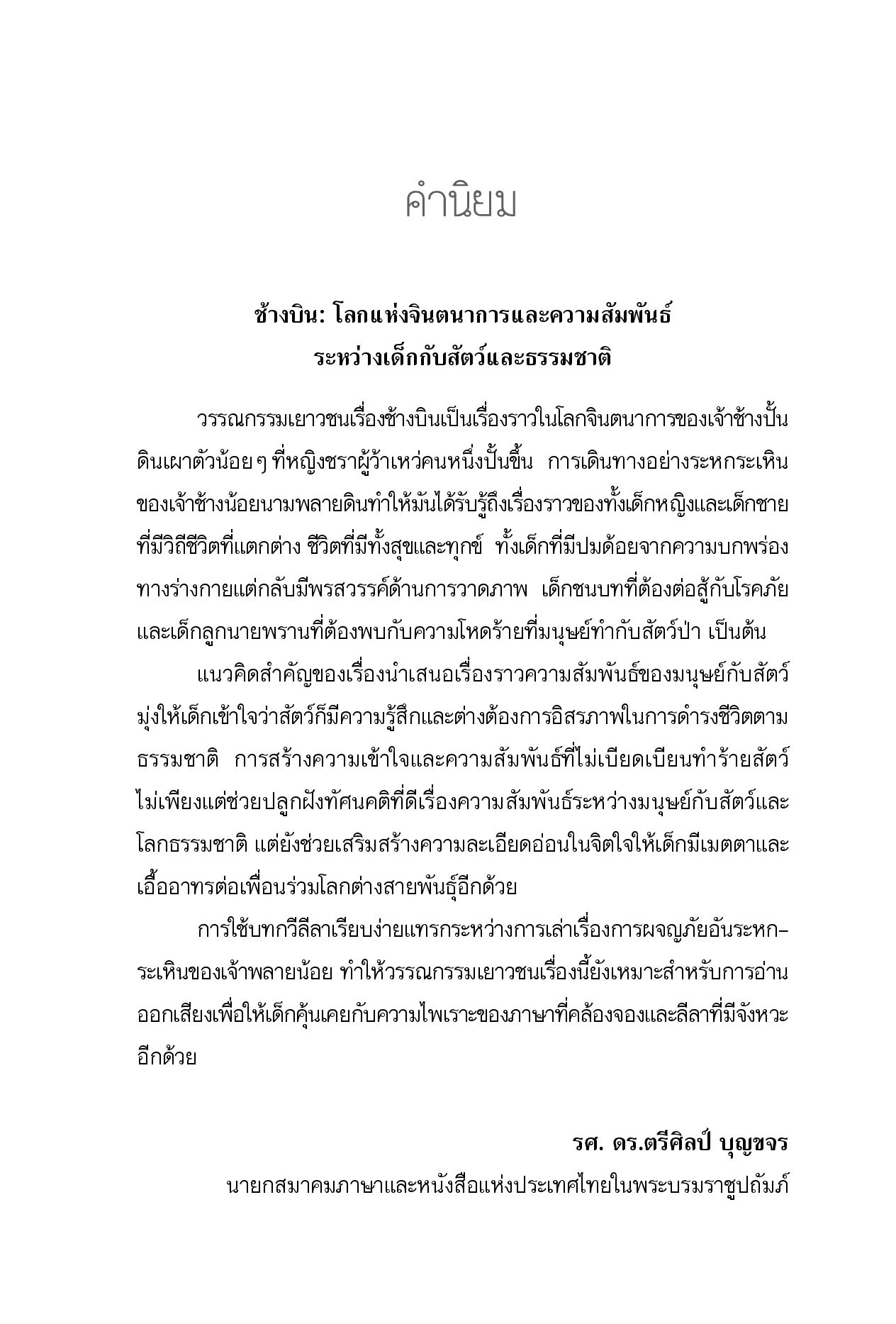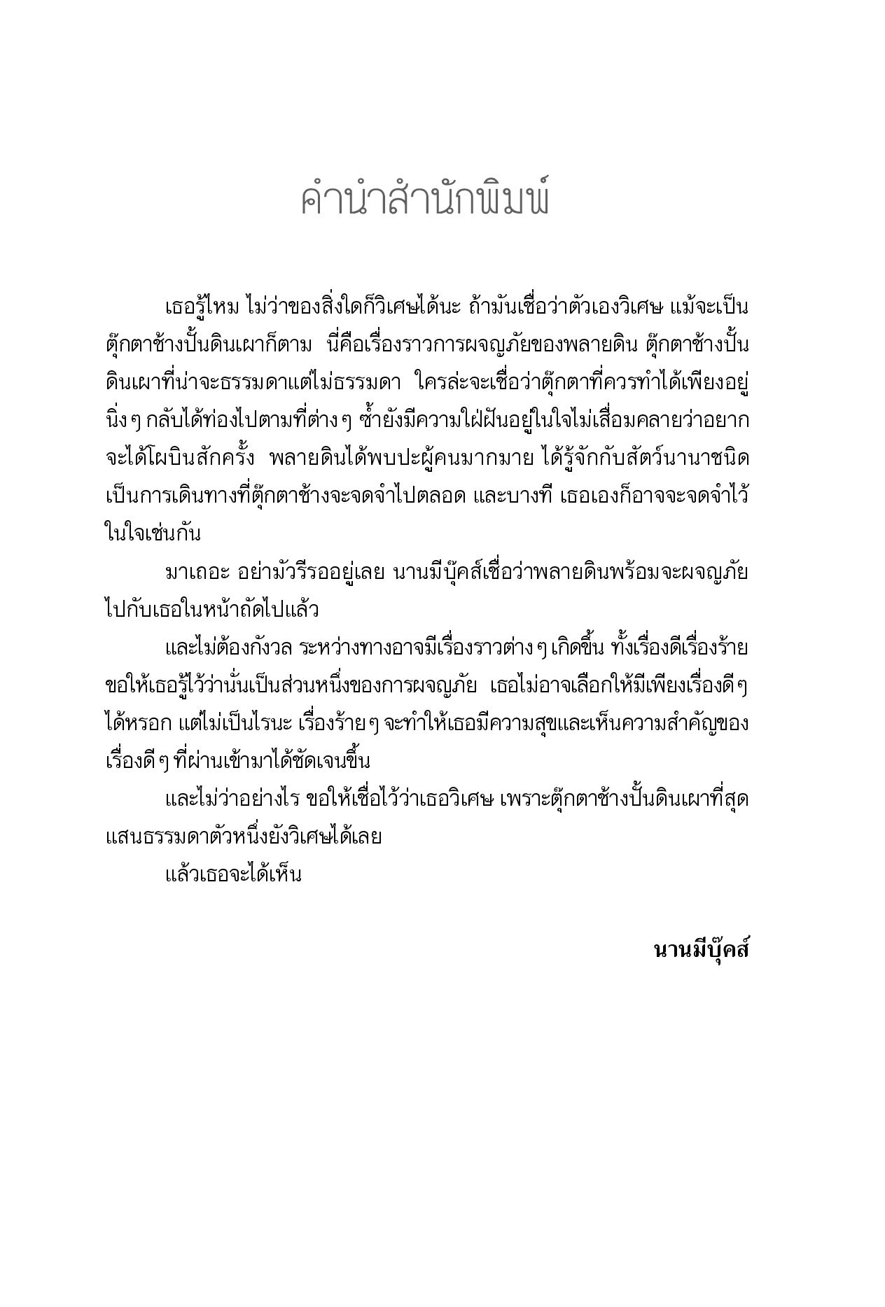 รางวัลชนะเลิศแว่นแก้ว ประเภทนวนิยายสำหรับเยาวชนปี 58 พลายดิน ตุ๊กตาช้างดินเผาตัวจิ๋วหน้าตายิ้มแย้ม มีความฝันอันยิ่งใหญ่อยากจะกางปีกโบยบินไปในท้องฟ้า วันหนึ่ง บรรดาเพื่อนนกกระจอกช่วยจุดประกายเชื้อเพลิงแห่งความฝันให้มันได้ก้าวข้ามกำแพงออกไปสู่โลกกว้าง ทว่าหนทางสู่การเหินขึ้นฟ้าครั้งแรกช่างยาวไกลนัก การเดินทางของพลายดินนำพาให้มันได้ประจักษ์กับความจริงบางอย่างเกี่ยวกับสายสัมพันธ์ระหว่างมนุษย์และธรรมชาติ และนี่คือก้าวแรกแห่งการผจญภัยที่จะตราตรึงในจิตใจของเจ้าช้างวิเศษไปอีกนานแสนนาน