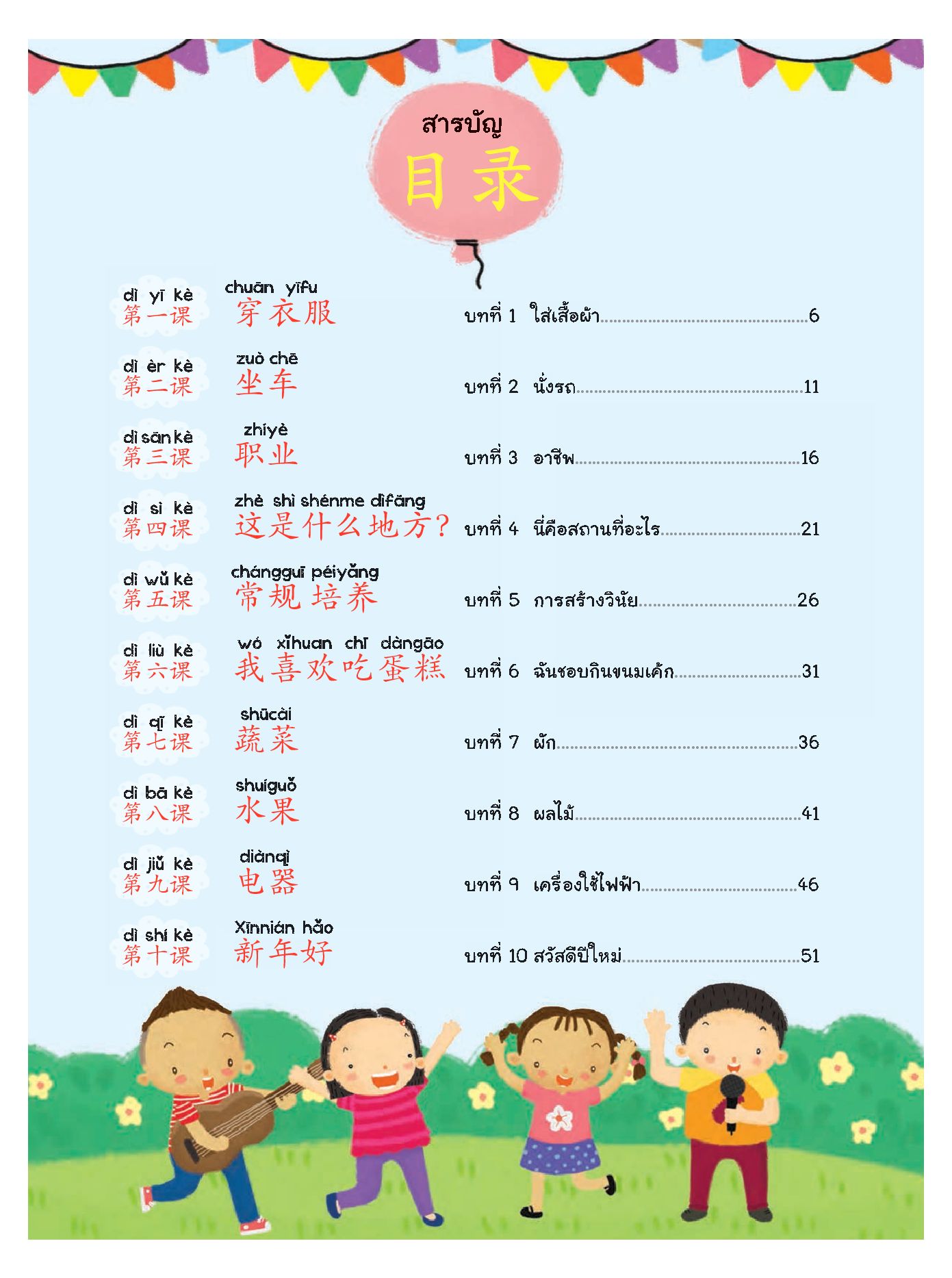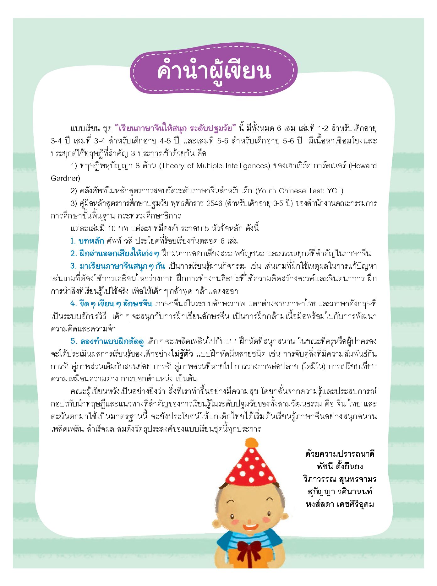 แบบเรียนภาษาจีนที่เหมาะสำหรับพัฒนาการของเด็กปฐมวัยอีกทั้งกิจกรรมในแต่ละบทยังช่วยส่งเสริมพหุปัญญาทั้ง 8 ด้านให้ผู้เรียนได้แก่ปัญญาด้านภาษา ตรรกะและคณิตศาสตร์ มิติสัมพันธ์ ร่างกายและการเคลื่อนไหว ดนตรี มนุษยสัมพันธ์ ความเข้าใจตนเองและธรรมชาติวิทยาแบ่งหัวข้อการเรียนรู้อย่างเป็นระบบ ดังนี้