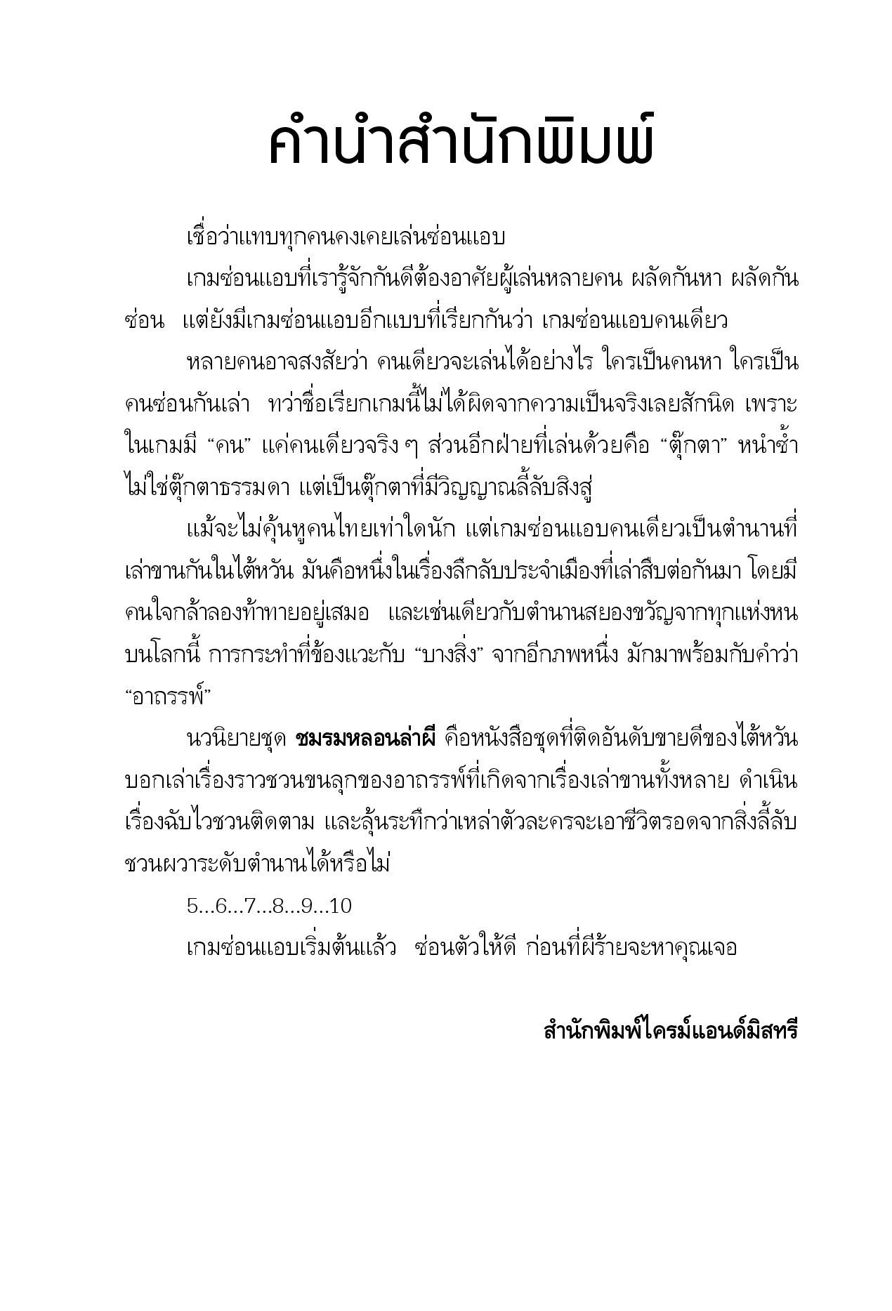 “ฉันหาเธอเจอแล้ว...ถึงตาเธอเป็นผีแล้ว!” เคยได้ยินตำนานเรื่อง “เกมซ่อนแอบคนเดียว” ไหม เตรียมตุ๊กตามาตัวหนึ่ง ดึงนุ่นที่ยัดในตัวตุ๊กตาออกมา แล้วเอาข้าวสารกับเล็บมือของตัวเองใส่ลงไปแทนเครื่องในของตุ๊กตา นับหนึ่งถึงสิบ หยิบมีดเดินไปหาตุ๊กตาและพูดว่า “ฉันหาเธอเจอแล้ว” เสร็จแล้วก็แทงลงไป เท่ากับว่าตุ๊กตาถูกจับได้แล้ว คราวนี้ตาตุ๊กตาเป็นผี!ตำนานที่ฟังเหมือนนิทานหลอกเด็กกลับกลายเป็นคดีสยองขวัญน่าพรั่นพรึง เมื่อหนึ่งในผู้เล่นกลายเป็นศพนอนจมกองเลือด ข้างกายของเธอมีเพียง...ตุ๊กตาที่ ถือมีดในมือ! ปริศนายิ่งทวีความสยองเมื่อเกมยังไม่จบและอาถรรพ์ยังดำเนินต่อจงซ่อนตัวให้ดี เพราะถ้าถูกหาเจอจะต้องกลายเป็นผีรายต่อไป! นวนิยายที่จะทำให้คุณรู้ว่าตำนานทั้งหลายอาจมีที่มาจากเรื่องจริง