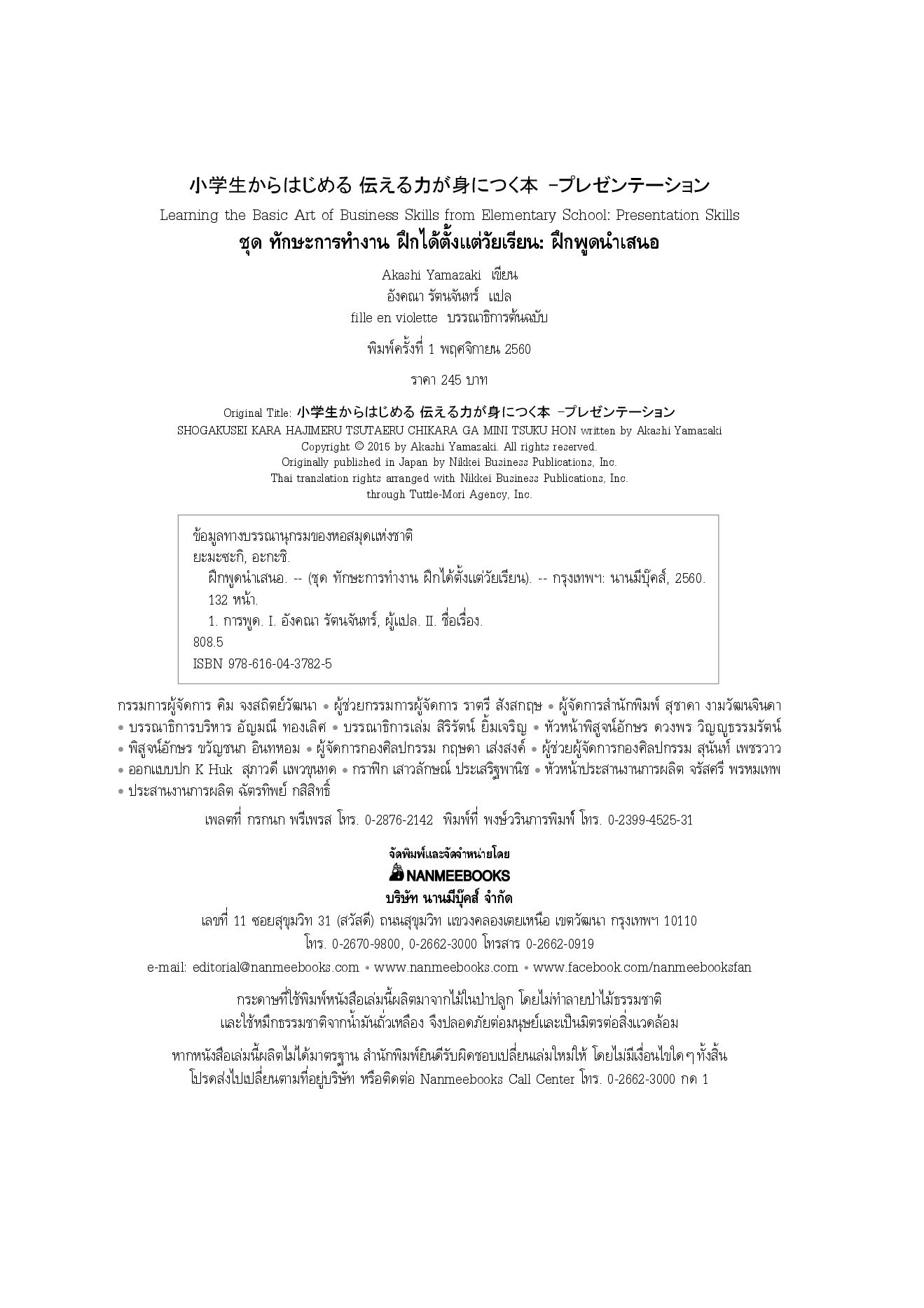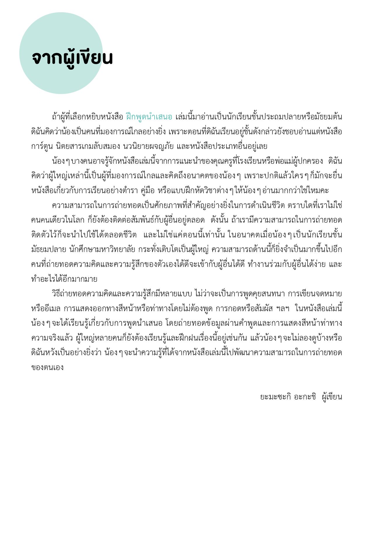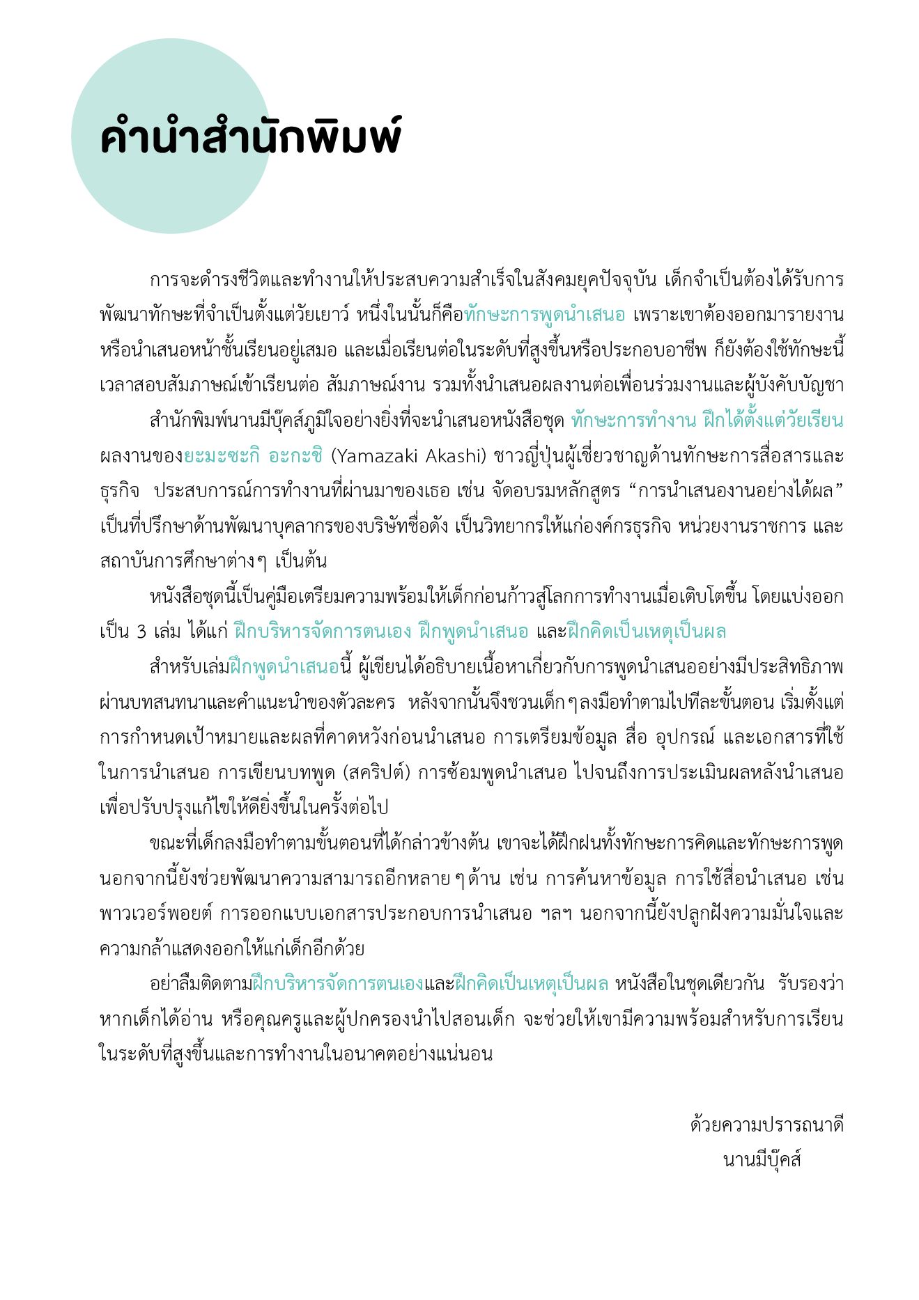 ฝึกพูดนำเสนอ อธิบายเกี่ยวกับการพูดนำเสนออย่างมีประสิทธิภาพผ่าน บทสนทนาและคำแนะนำของตัวละคร จากนั้นจึงชวนเด็ก ๆ ทำตามไปทีละขั้นตอน เริ่มตั้งแต่การกำหนดเป้าหมายและผลที่คาดหวังก่อนนำเสนอ การเตรียมข้อมูล สื่อและอุปกรณ์ที่ใช้นำเสนอ การเขียนบทพูด (สคริปต์) การซ้อมพูดนำเสนอ ไปจนถึงการประเมินผลหลังนำเสนอ เพื่อปรับปรุงให้ดียิ่งขึ้นในครั้งต่อไป นอกจากเด็ก ๆ จะได้พัฒนาทักษะการพูดแล้ว ยังพัฒนาความสามารถอีกหลายด้าน เช่น การค้นหาข้อมูล การใช้สื่อนำเสนอ เช่น พาวเวอร์พอยต์ การออกแบบเอกสารประกอบการนำเสนอ ฯลฯ นอกจากนี้ยังปลูกฝังความมั่นใจและความกล้า แสดงออกให้แก่เด็กอีกด้วย