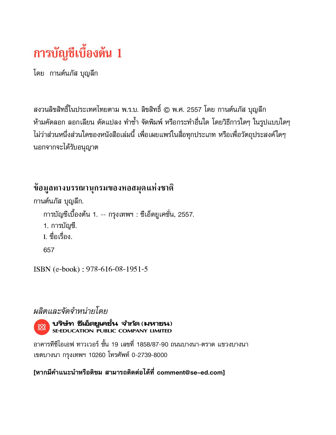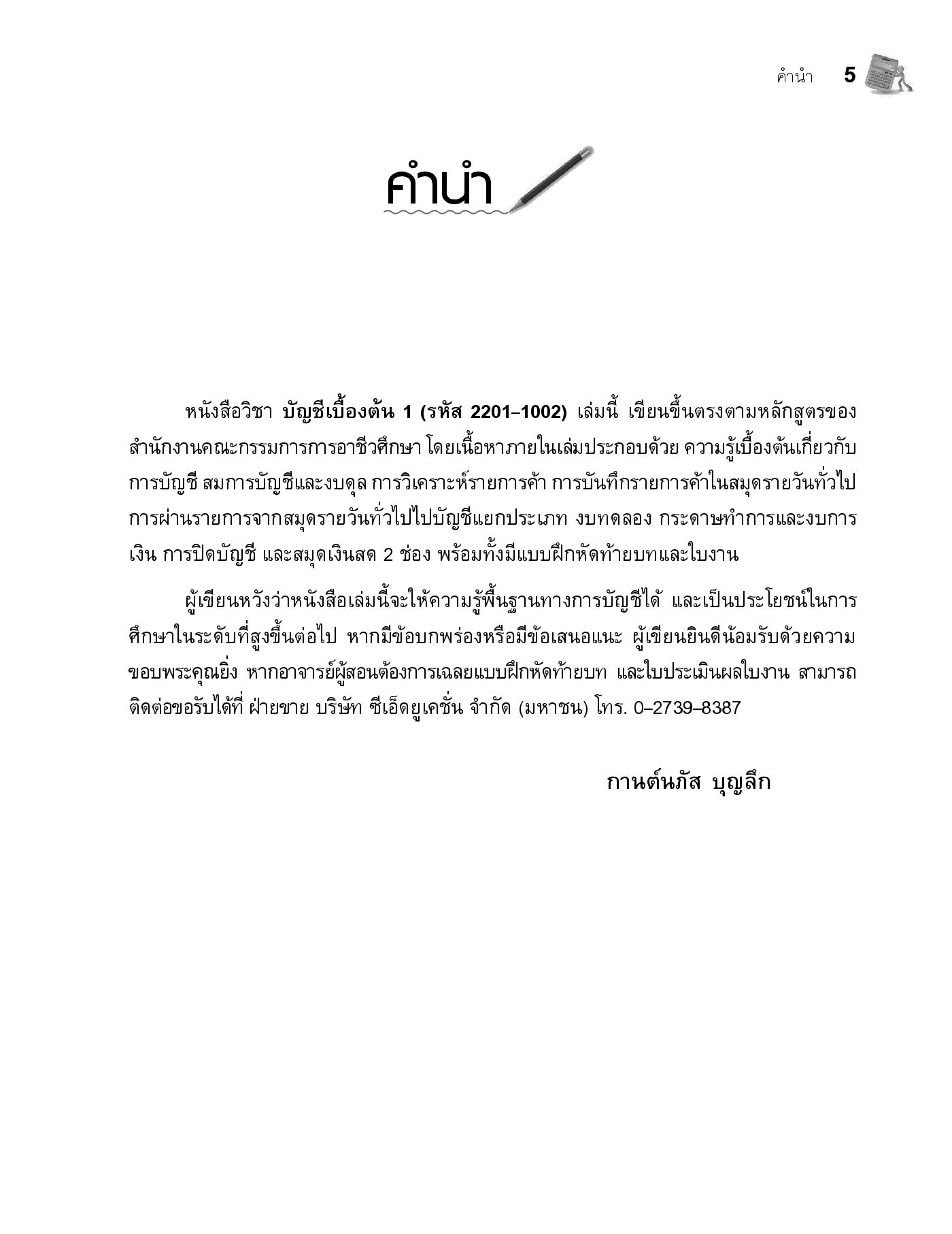 นำเสนอเนื้อหาที่สำคัญเกี่ยวกับความรู้เบื้องต้นเกี่ยวกับการบัญชี สมการบัญชีและงบดุล การวิเคราะห์รายการค้า การบันทึกรายการค้าในสมุดรายวันทั่วไป การผ่านรายจากสมุดรายวันทั่วไปไปบัญชีแยกประเภท งบทดลอง กระดาษทำการและงบการเงิน การปิดบัญชี และสมุดเงินสด 2 ช่อง ภายในเล่มยังมีแบบฝึกหัดและใบงาน เพื่อกระตุ้นให้ผู้เรียนได้ฝึกคิดและแก้ปัญหาได้ไปพร้อมๆ กันอีกด้วย