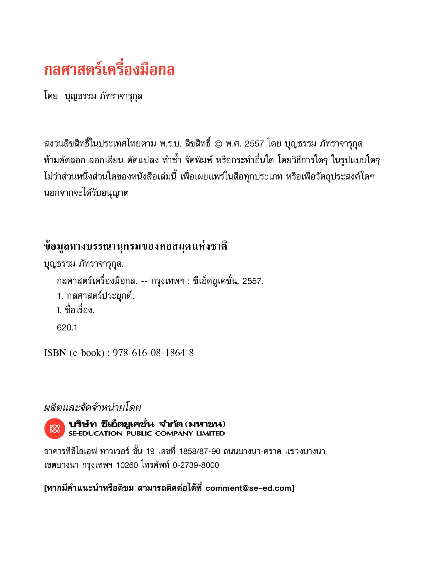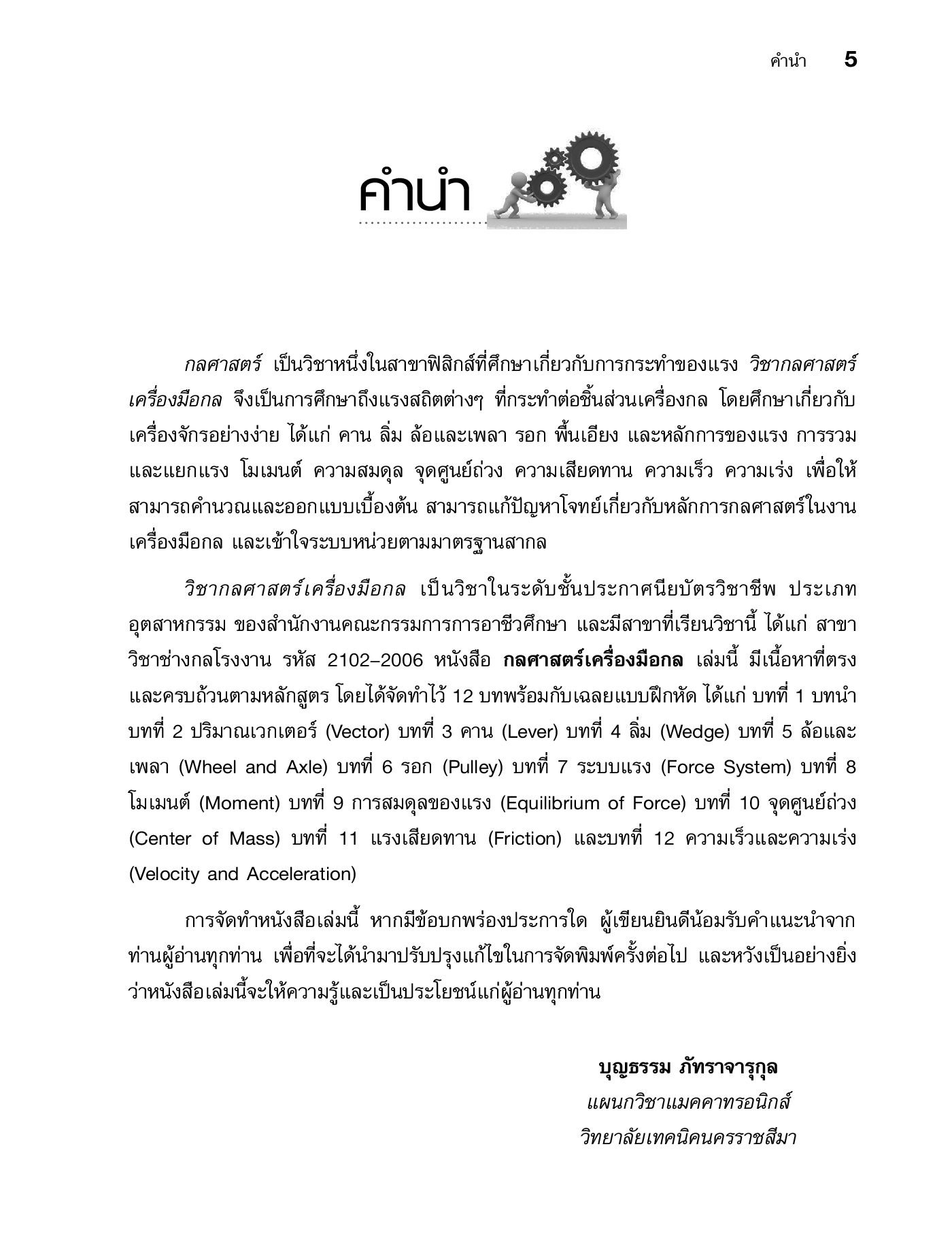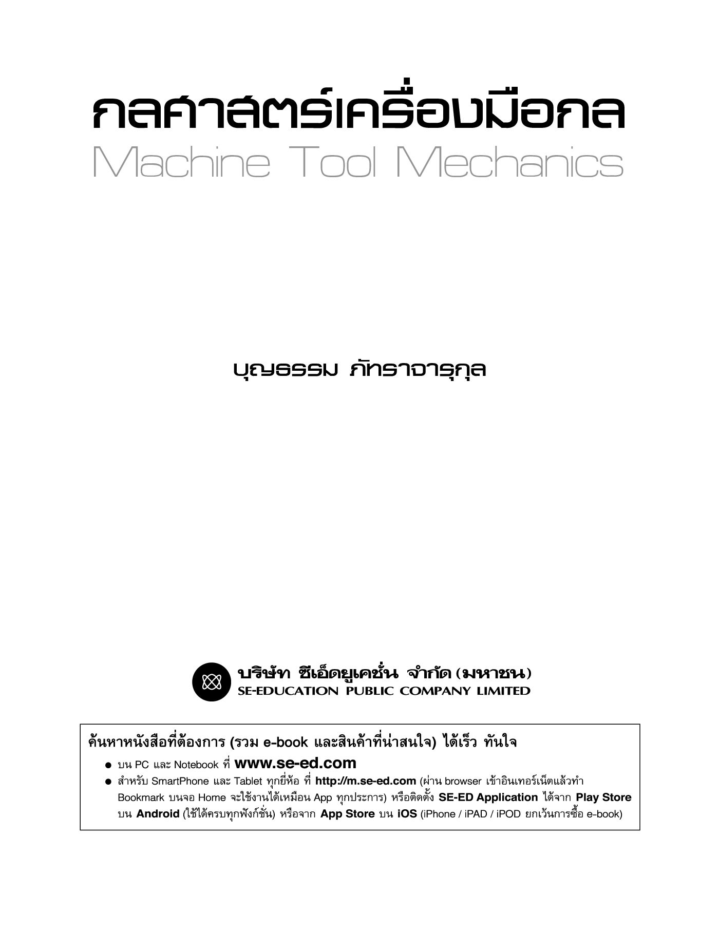 "กลศาสตร์" เป็นวิชาหนึ่งในสาขาฟิสิกส์ที่ศึกษาเกี่ยวกับการกระทำของแรง หนังสือ "กลศาสตร์เครื่องมือกล" เล่มนี้จึงเป็นการศึกษาถึงแรงสถิตต่างๆ ที่กระทำต่อชิ้นส่วนเครื่องมือกล โดยศึกษาเกี่ยวกับเครื่องจักรอย่างง่าย ได้แก่ คาน ลิ่ม ล้อและเพลา รอก พื้นเอียง หลักการของแรง การรวมและแยกแรง โมเมนต์ ความสมดุล จุดศูนย์ถ่วง ความเสียดทาน ความเร็วของแรง เพื่อให้สามารถคำนวณและออกแบบเบื้องต้น สามารถแก้ปัญหาโจทย์เกี่ยวกับหลักการกลศาสตร์ในงานเครื่องมือกล และเข้าใจระบบหน่วยตามมาตรฐานสากล