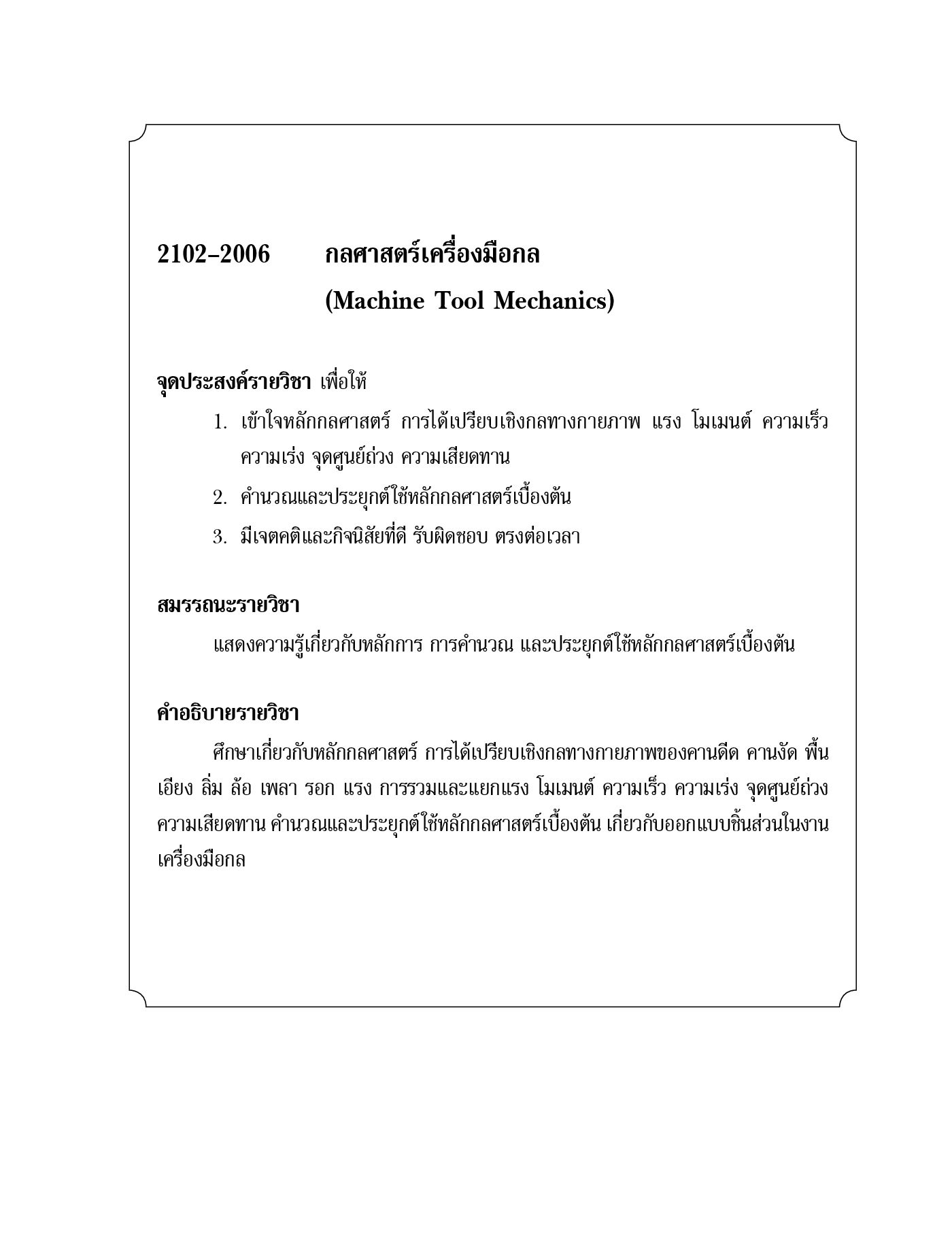เป็นการศึกษาถึงแรงสถิตต่างๆ ที่กระทำต่อชิ้นส่วนเครื่องมือกล โดยศึกษาเกี่ยวกับเครื่องจักรอย่างง่าย เพื่อให้สามารถคำนวณและออกแบบเบื้องต้น สามารถแก้ปัญหาโจทย์เกี่ยวกับหลักการกลศาสตร์ในงานเครื่องมือกล