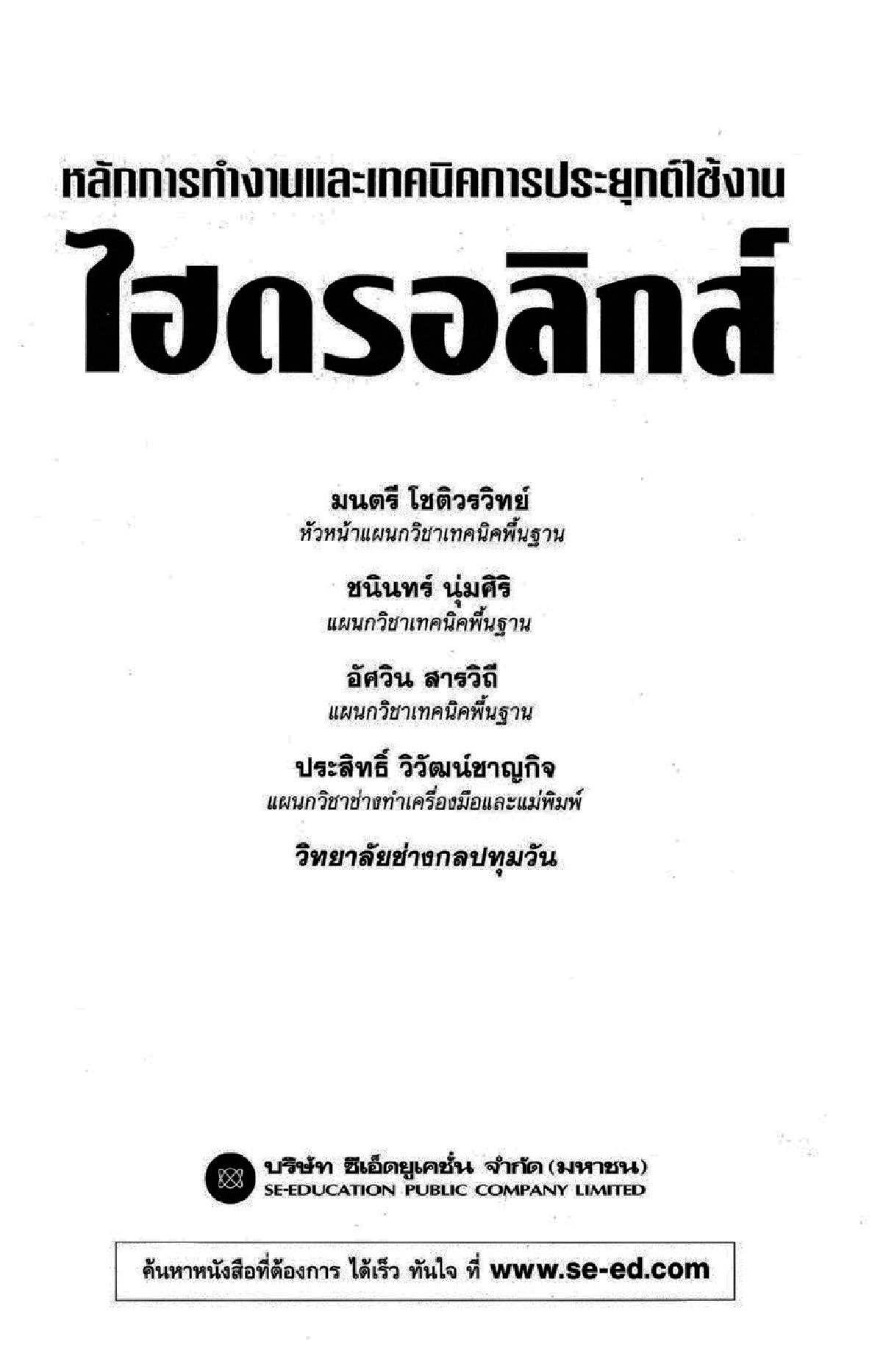หลักการทำงานตั้งแต่ขั้นพื้นฐานของระบบไฮดรอลิกส์รายละเอียดของอุปกรณ์ชนิดต่างๆ สัญลักษณ์ โครงสร้างของวาล์ว ปั๊มน้ำมัน หลักการคำนวณ และรูปวงจรการทำงานของระบบไอดรอลิกส์แบบต่างๆ