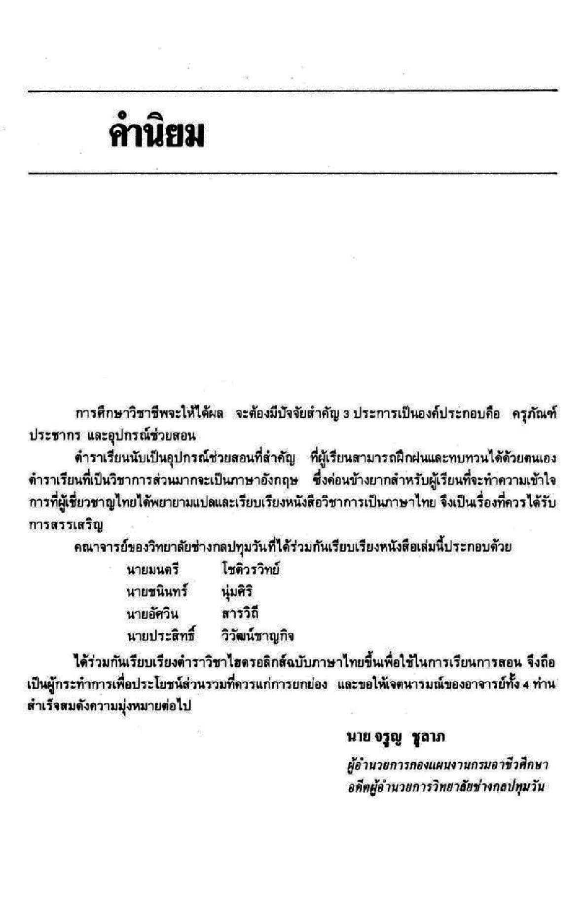 กล่าวถึงหลักการทำงานตั้งแต่ขั้นพื้นฐานของระบบไฮดรอลิกส์รายละเอียดของอุปกรณ์ชนิดต่างๆ สัญลักษณ์ โครงสร้างของวาล์ว ปั๊มน้ำมัน หลักการคำนวณ และรูปวงจรการทำงานของระบบไอดรอลิกส์แบบต่างๆ มากมาย ซึ่งท่านสามารถอ่านและทำความเข้าใจได้ด้วยตนเองจนกระทั่งนำไปประยุกต์ใช้งานได้ และยังเหมาะสำหรับช่างเทคนิคประจำอยู่ในโรงงานอุตสาหกรรมเพื่อเสริมความรู้ หรือท่านที่จะนำเอาระบบไฮดรอลิกส์ไปประยุกต์ใช้กับเครื่องจักรเดิมให้ทำงานได้ประสิทธิภาพเพิ่มมากขึ้น นอกจากนี้แล้วหนังสือยังให้ข้อมูลและความรู้อย่างละเอียดครอบคลุมหลักสูตร ปวส. ประเภทวิชาช่างอุตสาหกรรมอีกด้วย จึงเหมาะสำหรับนักศึกษาที่กำลังศึกษาอยู่ในระดับนี้