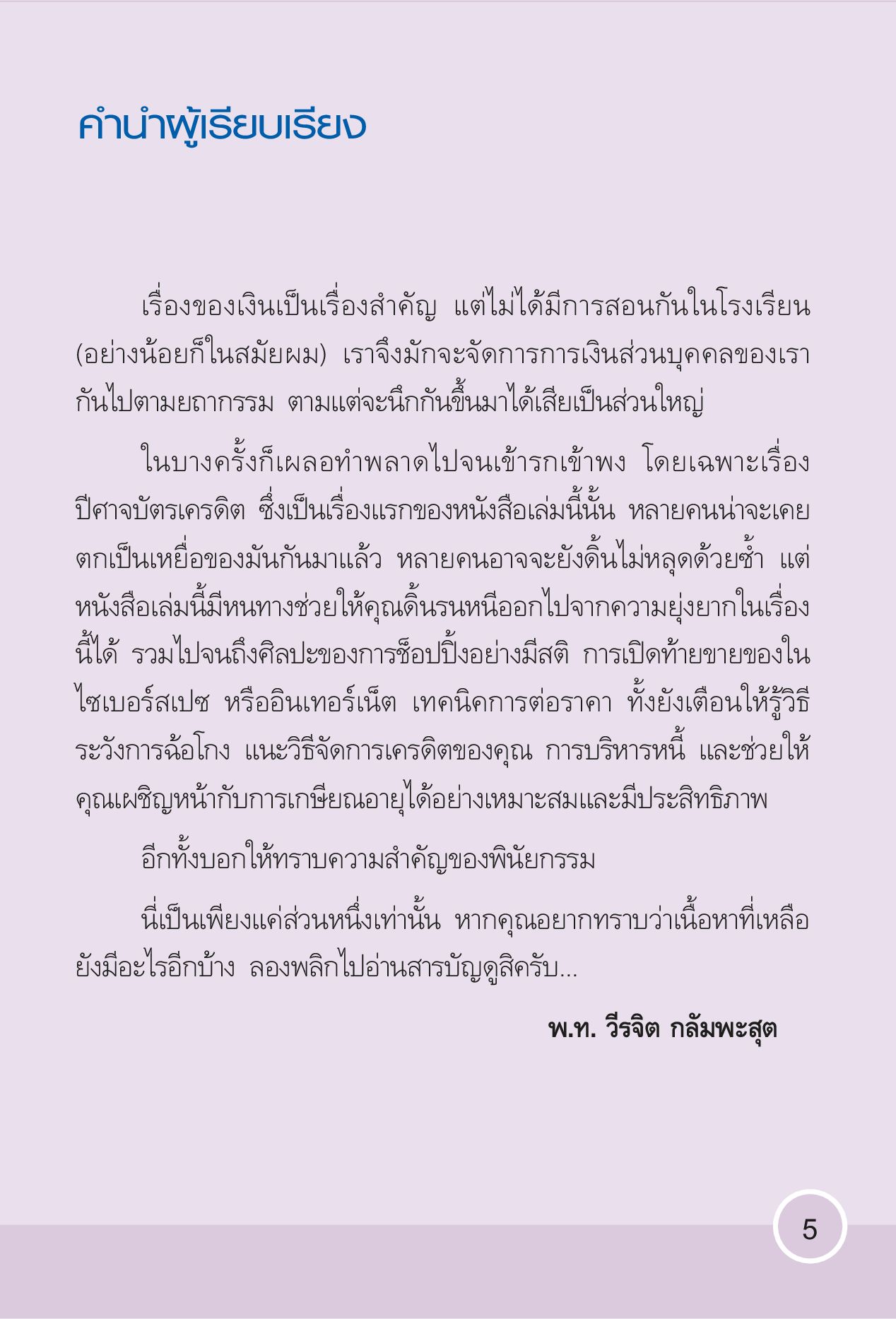 เรื่องการเงินเป็นเรื่องสำคัญแต่ไม่ได้มีการสอนกันในโรงเรียนเราจึงมักจะจัดการการเงินส่วนบุคคลของเรากันไปตามยถากรรมตามแต่จะนึกขึ้นมาได้เสียเป็นส่วนใหญ่ ในบางครั้งก็เผลอทำพลาดไปจนเข้ารกเข้าพง โดยเฉพราะเรื่องปีศาจบัตรเครดิต และหนังสือเล่มนี้มีหนทางช่วยให้คุณดิ้นรนหนีออกไปจากเรื่องนี้ได้รวมไปถึงศิลปะของการช็อปปิ้งอย่างมีสติ และช่วยให้คุนเผชิญหน้ากับการเกษียณอายุได้อย่างเหมาะสมและมีประสิทธิภาพ