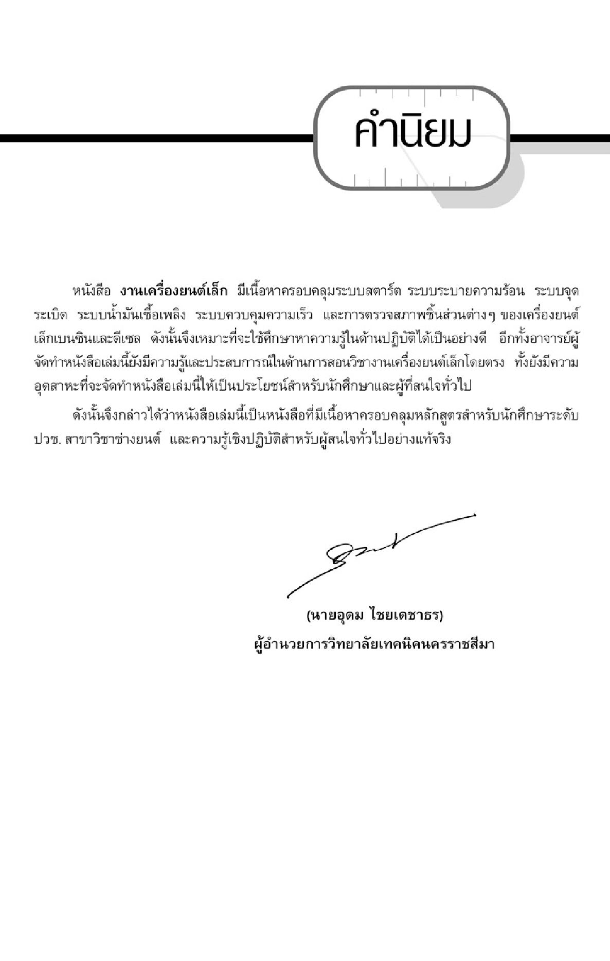 รวบรวมใบงานที่มีเนื้อหาครอบคลุมขั้นตอนปฏิบัติงานซ่อมบำรุงรักษาและบริการเครื่องยนต์เล็กแก๊สโซลีน 2 จังหวะ, เครื่องยนต์เล็กแก๊สโซลีน 4 จังหวะ และเครื่องยนต์เล็กดีเซลไว้ทั้งหมด ได้แก่ ระบบสตาร์ต ระบบระบายความร้อน ระบบจุดระเบิด ระบบน้ำมันเชื้อเพลิง ระบบควบคุมความเร็ว และการตรวจสภาพชิ้นส่วนต่างๆ ของเครื่องยนต์ ประกอบด้วยจุดประสงค์ ขั้นตอน และผลสรุปจากการปฏิบัติงาน