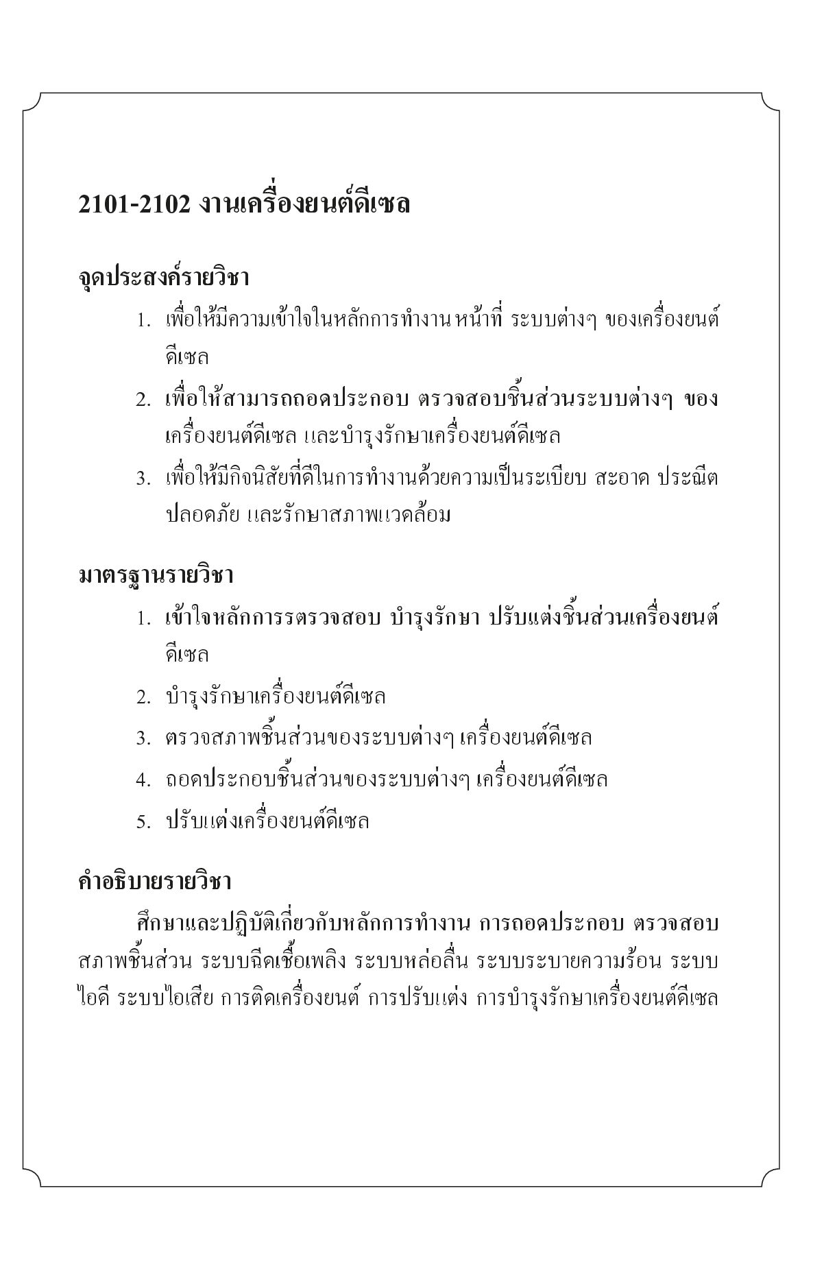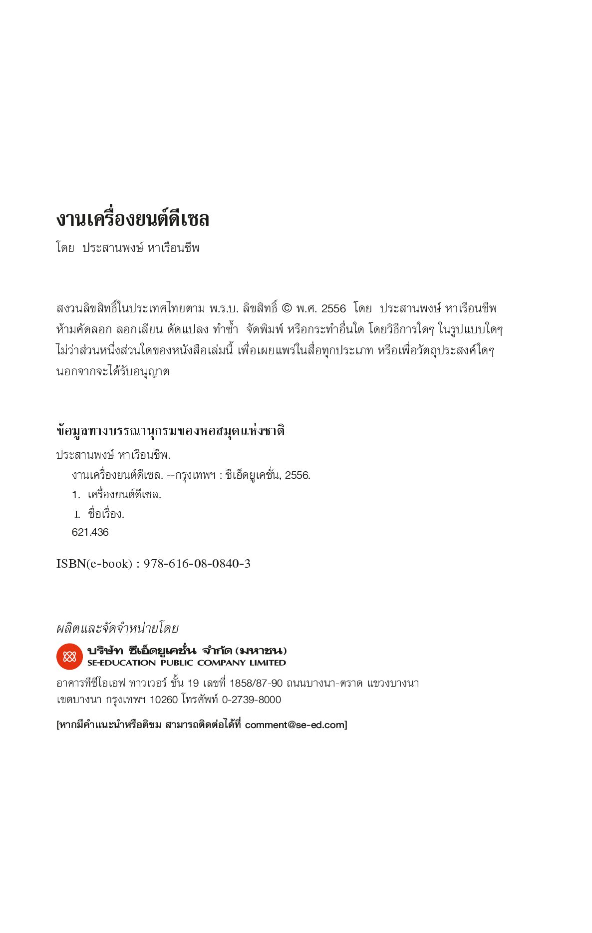 ให้เนื้อหาที่สำคัญเกี่ยวกับงานเครื่องยนต์ดีเซล ตรงตามหลักสูตรของสำนักงานคณะกรรมการการอาชีวศึกษา ครอบคลุมในเรื่องประวัติของเครื่องยนต์ดีเซล หลักการทำงานของเครื่องยนต์ดีเซล โครงสร้างและชิ้นส่วนของเครื่องยนต์ดีเซล ระบบเชื้อเพลิงของเครื่องยนต์ ปั๊มฉีดเชื้อเพลิงของเครื่องยนต์ดีเซล ระบบควบคุมความเร็วของเครื่องยนต์ดีเซล ระบบระบายความร้อนของเครื่องยนต์เซล ระบบควบคุมความเร็วของเครื่องยนต์ดีเซล และการแก้ไขปัญหาข้อขัดข้องของเครื่องยนต์ดีเซล อธิบายเนื้อหาโดยละเอียด เป็นลำดับขั้นตอน พร้อมตัวอย่างหลากหลาย เข้าใจง่าย