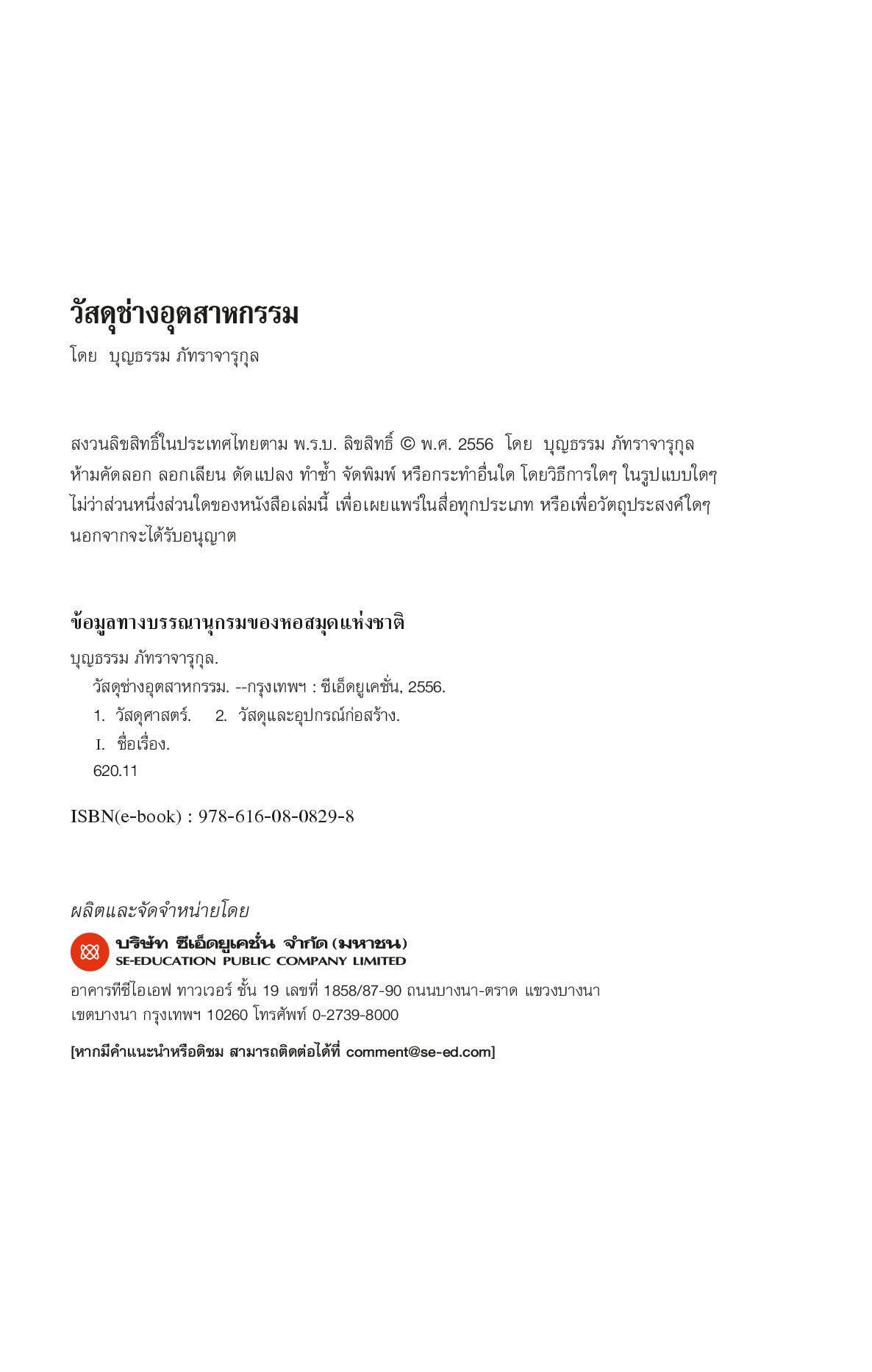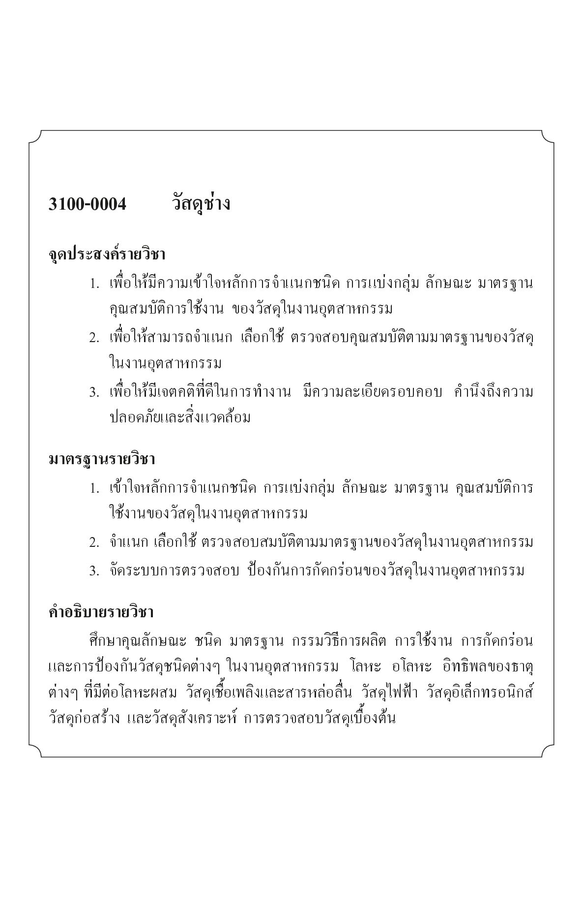 ให้เนื้อหาที่สำคัญเกี่ยวกับวัสดุช่างอุตสาหกรรม ครอบคลุมหลักสูตรช่างอุตสาหกรรม ระดับประกาศนียบัตรวิชาชีพ (ปวช.) ของสำนักงานคณะกรรมการอาชีวศึกษา กระทรวงศึกษาธิการ เริ่มตั้งแต่ทำความรู้จักกับคุณลักษณะ ชนิด มาตรฐาน กรรมวิธีการผลิต การใช้งาน การกัดกร่อน และการป้องกันวัสดุชนิดต่างๆ ในงานอุตสาหกรรม รวมถึงเรื่องราวของโลหะ อโลหะ อิทธิพลของธาตุต่างๆ ที่มีต่อโลหะผสม วัสดุเชื้อเพลิงและสารหล่อลื่น วัสดุไฟฟ้า วัสดุอิเล็กทรอนิกส์ วัสดุก่อสร้าง และวัสดุสังเคราะห์ ตลอดจนการตรวจสอบวัสดุเบื้องต้น อธิบายเนื้อหาโดยละเอียด เป็นลำดับขั้นตอน พร้อมตัวอย่างหลากหลาย เข้าใจง่าย