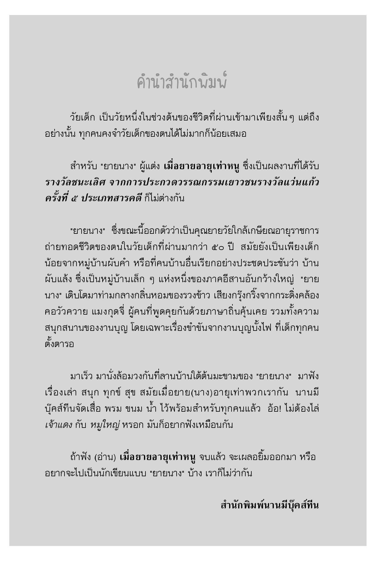 "ยายนาง" ถ่ายทอดชีวิตเมื่อครั้งวัยเด็กที่ผ่านมากว่าห้าสิบปี ลูกอีสานแห่งหมู่บ้านผับแล้ง หมู่บ้านเล็กๆ ในพื้นดินอีสานที่กว้างใหญ่ท่ามกลางวิถีชีวิต ประเพณีวัฒนธรรมอีสานแบบดั้งเดิม อบอวลด้วยเสียงแคน กลิ่นดิน และความสนุก สดใส ของชีวิตวัยเด็ก ที่เรียกรอยยิ้มทุกครั้งเมื่อนึกถึง