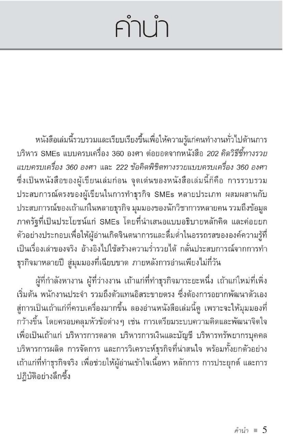 รวบรวมและเรียบเรียงขึ้นเพื่อให้ความรู้แก่คนทำงานทั่วไปด้านการบริหาร SMEs แบบครบเครื่อง 360 องศา ต่อยอดจากหนังสือ 202 คิดวิธีชี้ทางรวย แบบครบเครื่อง 360 องศา และ 222 ข้อคิดพิชิตทางรวยแบบครบเครื่อง 360 องศา ซึ่งเป็นหนังสือของผู้เขียนเล่มก่อน จุดเด่นของหนังสือเล่มนี้ก็คือ การรวบรวมประสบการณ์ตรงของผู้เขียนในการทำธุรกิจ SMEs หลายประเภท ผสมผสานกับประสบการณ์ของเถ้าแก่ในหลายธุรกิจ มุมมองของนักวิชาการหลายคน
